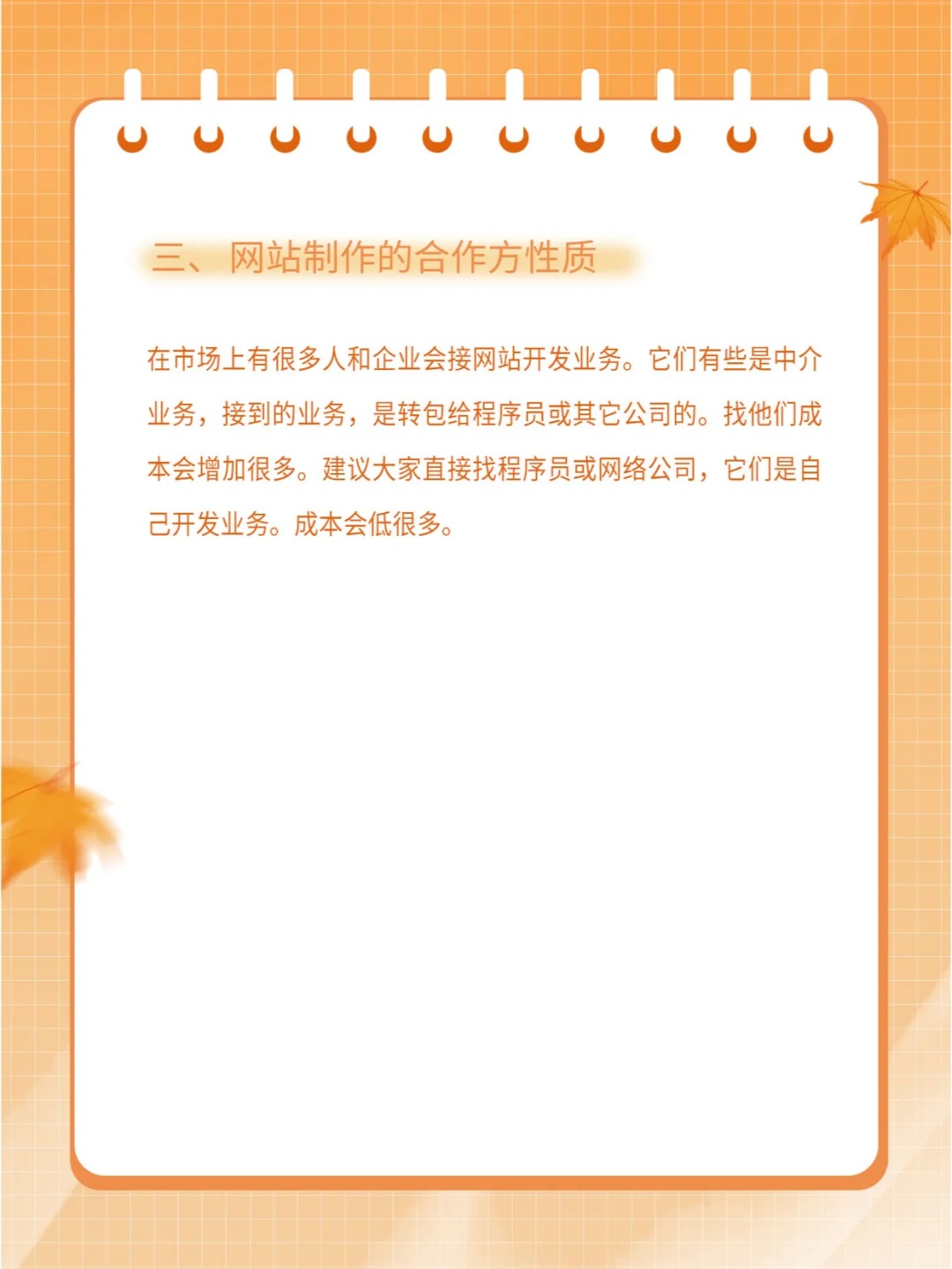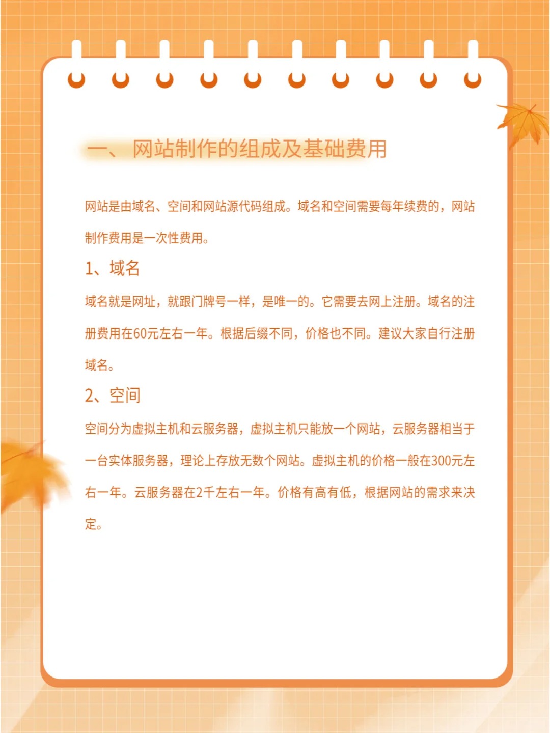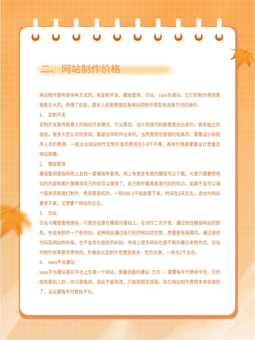 很多企业或个人想制作网站,首先考虑的还是价格,到网上找合作方,会发现网站制作报价真的是五花八门。有上万的价格,也有几百的价格。让很多人迷茫,如果大家对这行不熟很容易被坑。今天就根据小编从事程序开发十年的经验为大家详细介绍网站制作价格方面的知识。 一、网站制作的组成及基础费用 网站是由域名、空间和网站源代码组成。域名和空间需要每年续费的,网站制作费用是一次性费用。 1、域名 域名就是网址,就跟门牌号一样,是唯一的。它需要去网上注册。域名的注册费用在60元左右一年。根据后缀不同,价格也不同。 2、空间 空间分为虚拟主机和云服务器。虚拟主机的价格一般在300元左右一年。云服务器在2千左右一年。 二、网站制作价格 网站制作是有很多种方式的。有定制开发、模版套用、仿站。弄懂了它们的制作价格基本上就能掌握网站的报价了。 1、定制开发 定制开发是传统意义的网站开发模式。它从策划、设计到源代码开发都是原创出来的。具有独立的版权。很多大型公司的官网,都是这样制作出来的。当然费用也是相对较高的。一般企业网站制作定制开发的费用在3-8千不等。具体价格是要看设计质量及网站规模。 2、模版套用 模版套用是指到网上去找一套模版来套用。网上有很多免费的模版可以下载。大家只需要把网站的内容和图片替换成自己的就可以使用了。自己套用要具备一定代码的知识,如果不会可以请程序员帮我们制作。人工费用一般500-1千就能拿下来,时间在2天左右。 3、仿站 仿站与模版套用类似,只是仿站是在模版的基础上进行二次开发。通过修改模版网站的颜色、布局来制作一个新的站。这种网站通常是吸引其它网站的优势,再结合自身的需求来建站。质量是有保障的,而且制作价格又比较低。市场上很多网站也是不断模仿来制作的。仿站的制作效率是非常高的。定制开发需要一个星期的话, 仿站只需要3天就能完成。价格比定制开发便宜很多。一般在2千左右就能完成。 三、网站制作的合作方性质 在市场上有很多人和企业会接网站开发业务。它们有些是中介业务,接到的业务,是转包给程序员或其它公司的。找他们成本会增加很多。建议大家直接找程序员或网络公司,他们是自己开发业务。成本会低很多。 如果想制定网站可以联系平台客服,帮助您处理。