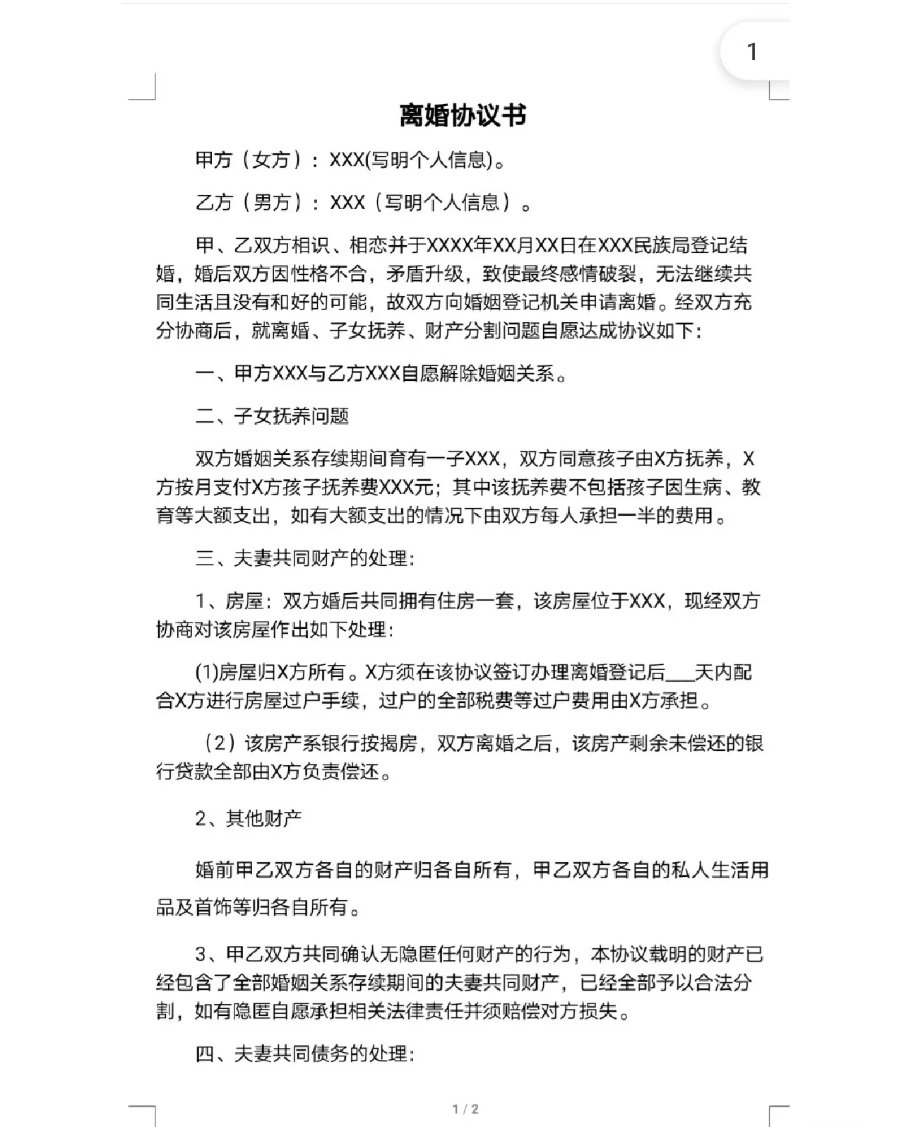 甲方(女):XXX(注明个人信息)。 乙方(男):XXX(注明个人信息)。 甲乙双方于XXXX年XX月XX日在XXX市民政局登记结婚。然而,由于性格差异和不断升级的冲突,他们的关系最终破裂,如果没有和解的可能性,他们无法继续生活在一起。因此,双方当事人向婚姻登记机关申请离婚。经双方充分协商,就离婚、子女监护、财产分割等事项自愿达成如下协议: 1、 甲方XXX与乙方XXX自愿解除婚姻关系。 2、 育儿问题 婚姻关系存续期间,双方育有一子,取名XXX。双方同意由X方抚养子女,X方每月向X方支付子女抚养费XXX元;抚养费不包括孩子的疾病或教育等重大费用。如发生重大费用,双方各承担一半费用。 3、 配偶共同财产的处理: 一️⃣ 房屋:结婚后,双方共同拥有位于XXX的房屋一套。经协商,该房屋采取以下措施: (1) 该房屋归X方所有,X方应配合X方于本协议签订后__日内办理房屋过户手续,办理离婚登记。与转让相关的所有税费应由X方承担。 (2) 该房产为银行抵押房产。双方离婚后,该房产剩余未偿还的银行贷款由X全额偿还。 二️⃣ 其他财产 婚前,双方财产归对方所有,个人生活用品和珠宝首饰归对方所有。 三️⃣ 双方,田,已共同确认不存在财产隐性损失。本协议约定的财产已依法分割,包括夫妻在婚姻关系存续期间的全部共同财产 如有隐瞒,自愿承担相关法律责任,并赔偿对方损失。 4、 夫妻共同债务的处理:婚姻关系存续期间双方的确认?未发生共同债务,任何一方均应 有外债的,由债务人自行承担。 5、 其他协议事项: 一️⃣ 甲乙双方自愿接受本协议内容的约束,并保证以下各项的有效履行: 二️⃣ 双方签署本协议时,不存在智力或精神异常,意思表示真实、合法、有效,不存在胁迫、威胁等违法行为或情形: 三️⃣ 本协议一式三份,自双方签字之日起生效。双方各持一份,婚姻登记机关备案一份。 四️⃣ 本协议生效后,在执行过程中如发生争议,双方应协商解决。如果协商不成,任何一方都可以向有管辖权的法院提起诉讼。