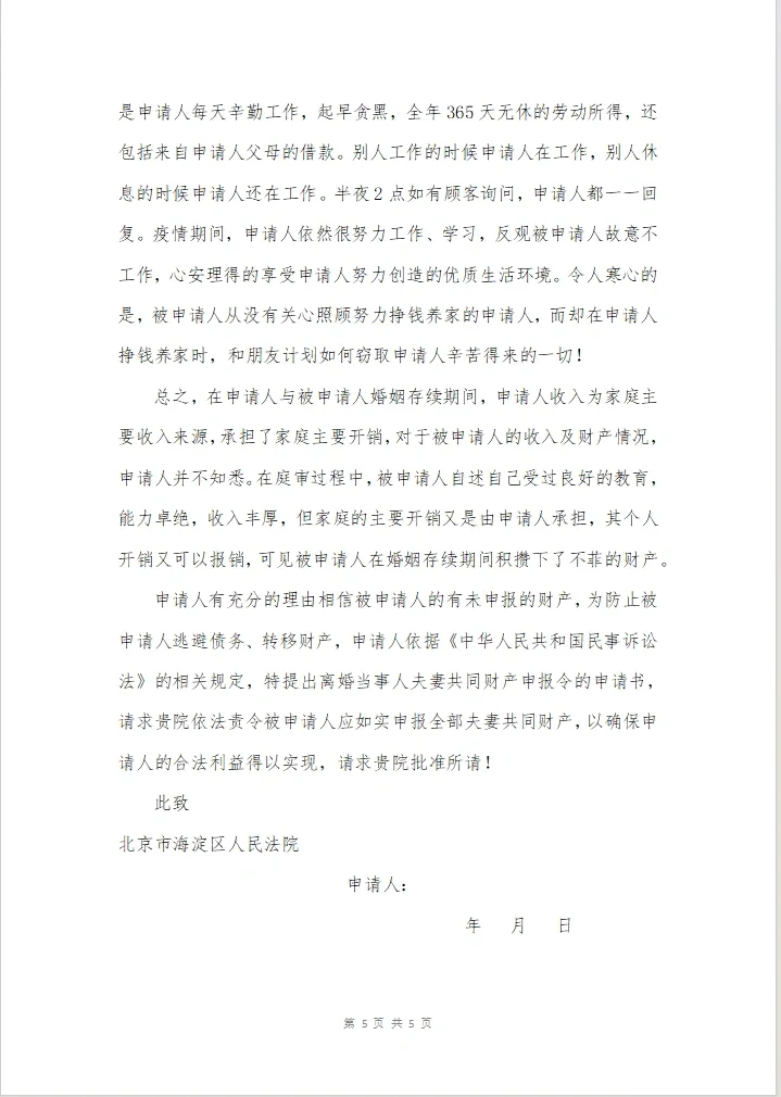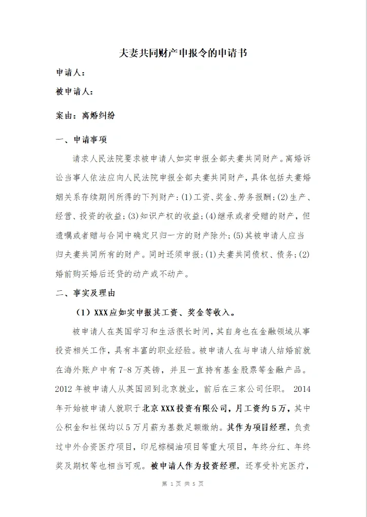 免费共享配偶共同财产申报令申请表模板[Shy R] - 当一方,尤其是弱势群体的妇女提出离婚时,他们往往不知道另一方名下有什么财产。那么,他们应该如何依法保护自己的权利和分割夫妻共同财产呢? - 《中华人民共和国妇女权益保障法》第六十七条规定:“在离婚诉讼中,夫妻一方申请查询登记在另一方名下的财产状况,因客观原因不能自行收集的,人民法院应当调查取证,有关部门和单位应当予以协助。在离婚诉讼过程中,夫妻双方有义务向人民法院申报夫妻全部共同财产。一方隐匿、转移、变卖、损毁、挥霍夫妻共同财产,或者伪造夫妻共同债务,企图侵占另一方财产的,离婚时分割夫妻共同财产,一方可以少分或者不分。” - 《申报令》规定了适用条件、申报期限、申报财产范围、豁免情形以及当事人拒绝申报、逾期申报或申报财产不实的法律责任。根据《申报令》,双方需要申报的财产范围包括:工资、奖金、劳动报酬、银行存款、现金、理财产品、证券,以及夫妻双方的不动产、产权和其他共同所有的财产。“申报令”还将依法告知拒绝申报、逾期申报或申报不实的法律责任。同时,人民法院将依照民事诉讼法的有关规定予以制裁,构成虚假诉讼的,依法承担相应的刑事责任。