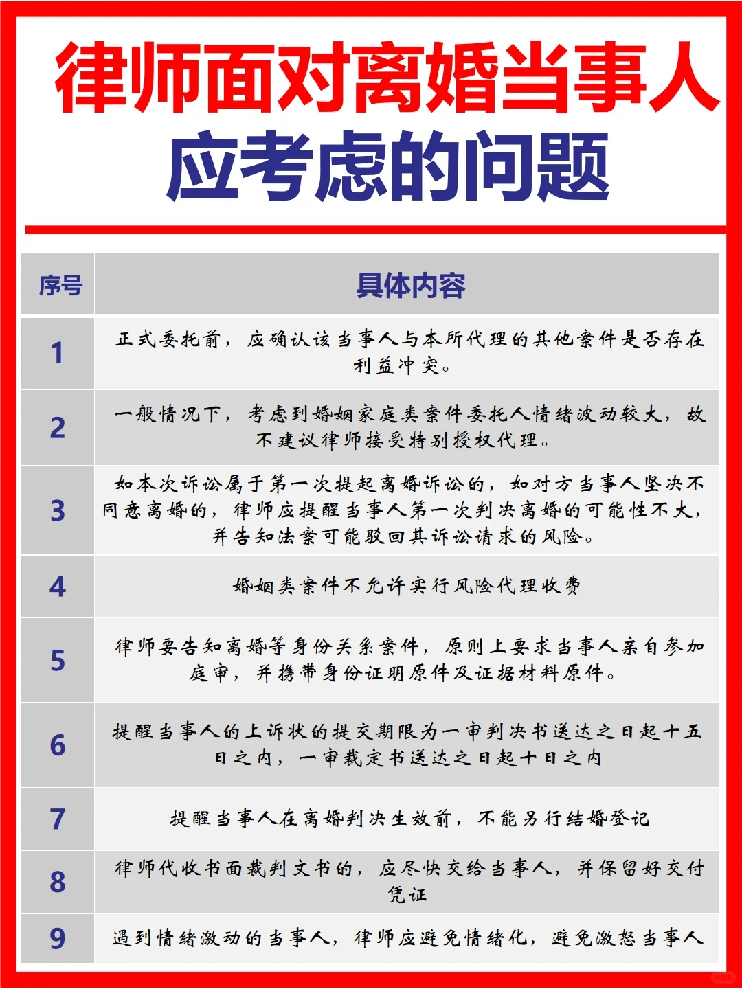 ? 婚姻家庭涉及当事人的诸多情感因素。因此,律师在办理此类案件时,应特别关注当事人心理状态和情绪表达的变化,并在从事相关法律服务时特别注意调解技巧的运用。 ? 法律理论分析与实际操作结果可能存在哪些差异,当事人对纠纷解决应持何种态度和心理态度。 ? 在正式授权之前,应确认当事方与该公司代理的其他案件之间是否存在利益冲突。 ? 一般来说,考虑到客户在婚姻家庭案件中情绪波动较大,不建议律师接受特别授权代理。 ? 如果这是第一次提起离婚诉讼,而另一方坚决不同意离婚,律师应提醒当事人,第一次判决离婚的可能性不大,并告知他们诉讼请求被驳回的风险。 ? 婚姻案件不允许执行风险代理费 ? 律师应当告知离婚等身份案件的当事人,要求其亲自出庭,并携带身份证明文件和证据材料原件。 ? 提起上诉提醒当事人的期限为一审判决送达之日起15日内,一审判决书送达之日止10日内 提醒当事人在离婚判决生效前不能再登记结婚 律师代为领取书面裁判文书的,应当尽快移交给委托人,并保存送达凭证 ? 当遇到情绪激动的客户时,律师应避免情绪激动,避免激怒客户