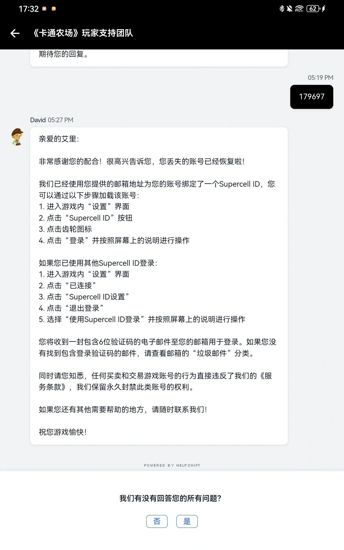 这是一种针对未绑定超级单元ID并以游客身份登录的安卓宝宝的检索技术。它已经过测试并被证明是有效的!(iOS也可以尝试,毕竟这是官方的方法) 不要爬梯子!不要爬梯子!不要爬梯子! 需要准备: 未绑定到超级单元格ID的电子邮件(QQ电子邮件可以) 【天梯会更改IP,更改IP后客服无法为您服务!】 1.打开您的帐户,不要担心系统的初学者指导任务。只需点击左上角有三个栏的设置界面 2.点击底部,选择帮助和支持,进入界面,点击右上角的蓝色小对话框,点击留言 3.进入客服界面,加载时间可能会稍长一些。如果无法加载,请再刷新几次。刷新后,右下角将有三个蓝色选项。选择与帐户相关的问题 4.电子客服代表Greg会要求您选择一个新选项,但如果您再次选择,帐户将丢失 5.接下来,如实回答Greg的问题!为方便客户服务锁定您的帐户 6.经过大约0.5-1个小时的信息收集,它将转换为Tom,他会问你几个问题,以进一步缩小搜索范围(我不知道如果我现在不记得这些问题会发生什么,你可以试试,我可以帮助你) 从这里开始,客服每五到十分钟就会非常迅速地回复一次信息 7.在回答完所有问题后,他会向你询问之前准备的电子邮件地址,他们会向该电子邮件地址发送验证码。将验证码发送给他们后,他们会将您的帐户绑定到此电子邮件地址 完成后,按照提示重新启动游戏,您将能够获得以前的帐户!
