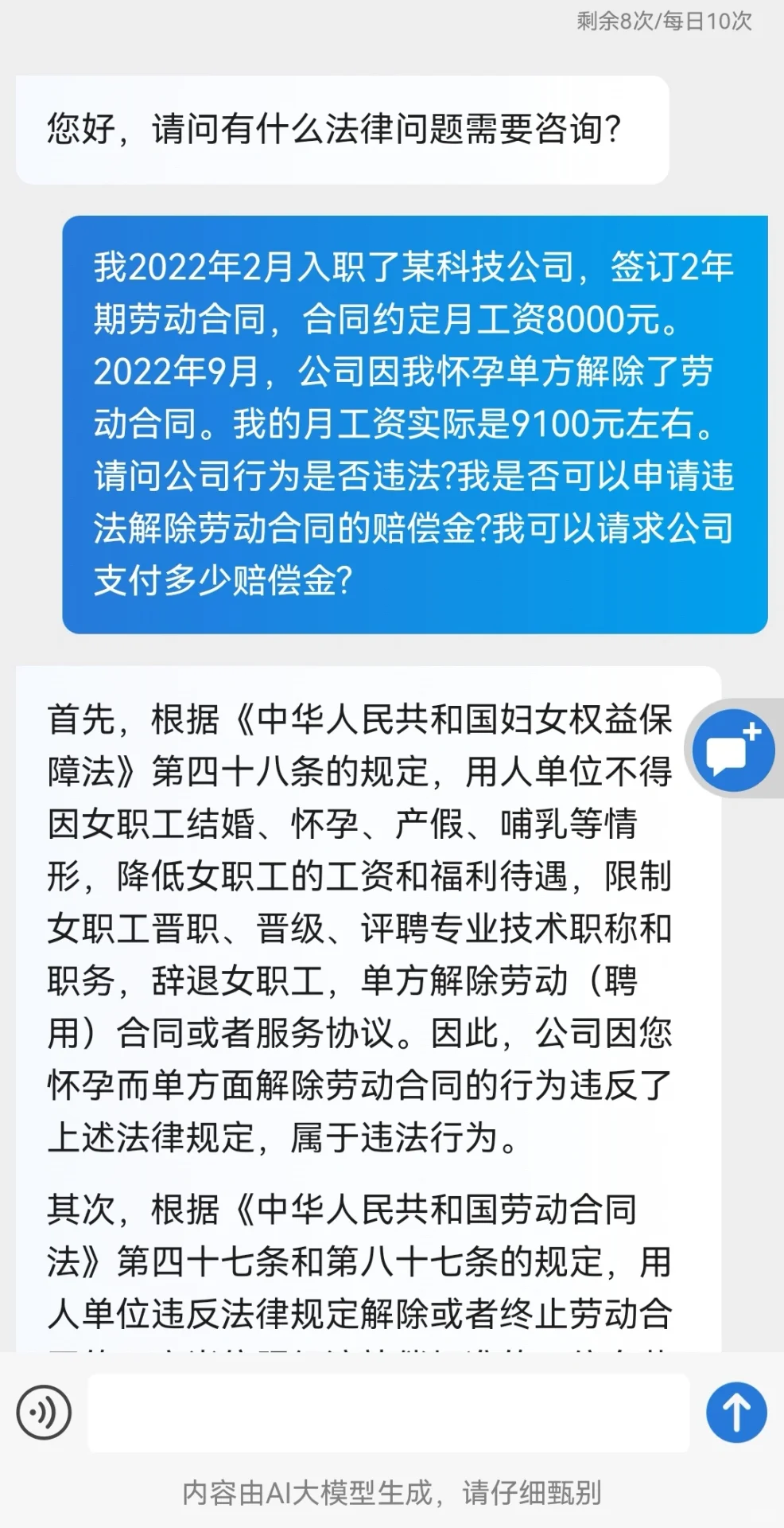 ? 人工智能到底有多有用?例如,如果我在怀孕期间被解雇,我该怎么办?在不到半分钟的时间里,小程序结合《劳动合同法》第47条和第87条进行了回答。工作效率显著提高。