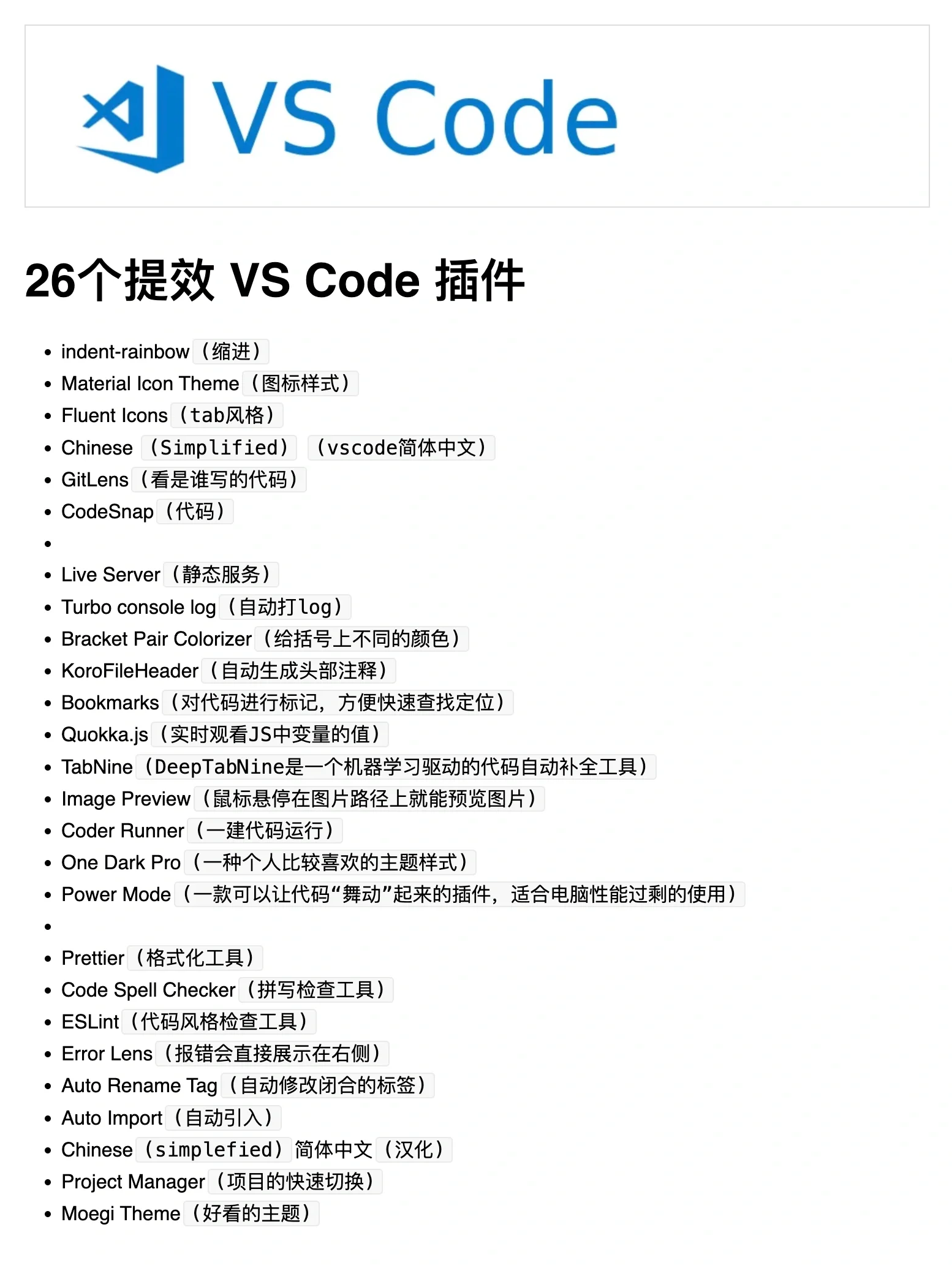 缩进彩虹 材质图标主题 Fluent图标(选项卡样式) 中文(简体)(vscode简体中文) GitLens(看看是谁写的代码) 代码捕捉 Live服务器(静态服务) Turbo控制台日志(自动记录) 支架空气比色器 KoroFileHeader(自动生成标头注释) 书签(标记代码,便于快速查找和本地化) Quokka.js(实时查看js中的变量值) TabNine(DeepTabNine是一个机器学习驱动的代码完成工具) 图像预览(将鼠标悬停在图像路径上以预览图像) 编码器运行程序 One Dark Pro(个人喜爱的主题风格) 电源模式(一个可以让代码跳舞的插件,适合在计算机性能过高的情况下使用) Prettier(格式化工具) 代码拼写检查器 ESLint(代码样式检查器) 错误镜头(错误信息将直接显示在右侧) 自动重命名标记 自动导入 简体中文 项目经理(项目快速切换) Moegi主题