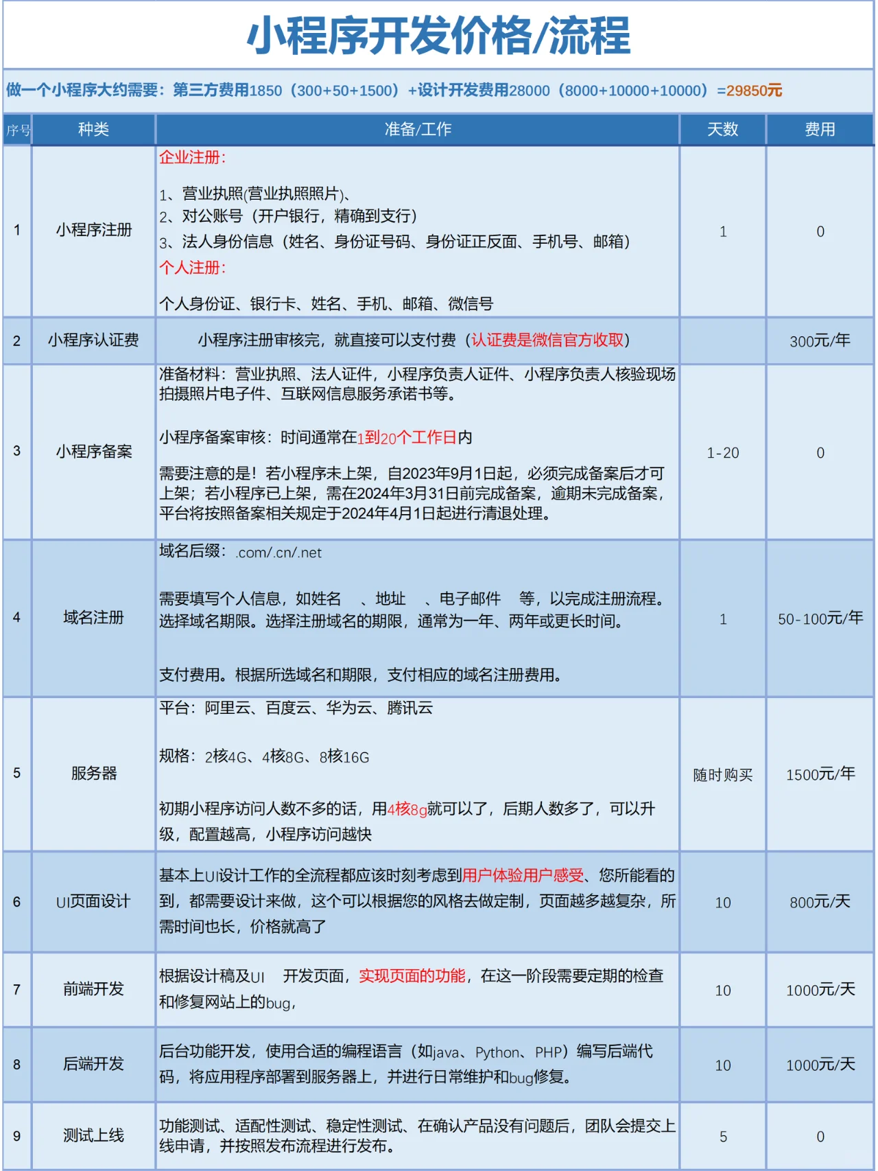 小程序开发所需的过程/价格/时间包括以下部分 1.小程序注册: ? 企业登记:营业执照(营业执照照片)、企业账号(开户银行,准确到分行) 法人身份信息(姓名、身份证号码、身份证正反面、手机号码、电子邮箱) ?? 个人注册: 个人身份证、银行卡、姓名、手机、邮箱、微信 2.小程序认证费: ? 小程序注册审核后,即可直接交费(认证费由微信公号收取) 3、小程序备案: ? 准备材料:营业执照、法人证书、小程序负责人证明、小程序责任人照片电子复印件供核查、互联网信息服务承诺书等。 ? 迷你程序备案审查:通常需要1到20个工作日 4.域名注册: ✅ 域后缀:。com/。cn/。网 ? 完成注册过程需要提供姓名、地址、电子邮件等个人信息。选择域名到期日期。选择注册域名的截止日期通常是一年、两年或更长时间。费用的支付。根据选择的域名和截止日期支付相应的域名注册费。 5.服务器费用: ? 平台:阿里云、百度云、华为云、腾讯云 ? 规格:2芯4G、4芯8G、8芯16G 如果前期迷你程序的访问量不高,那么使用4芯8g就足够了。但是,如果后期有更多的访客,它可以升级。配置越高,访问迷你程序的速度就越快 6.UI设计/定制开发过程/成本占整个成本的大部分,如下所示: ? 对于小程序定制项目,最高的开发成本通常仍然是劳动力成本。一线城市和二线城市的劳动力成本不同,一线程序员平均2000元/天,二线开发者平均800-1500元/天。参与小程序开发项目的技术人员越多,开发周期就越长,产生的成本就越高, ? 例如,项目经理收到的项目估计需要40个工作日。设计需要10天,也就是8000天,前端和后端也需要10天的时间,也就是20000天。这是小程序的定制开发所需的成本,