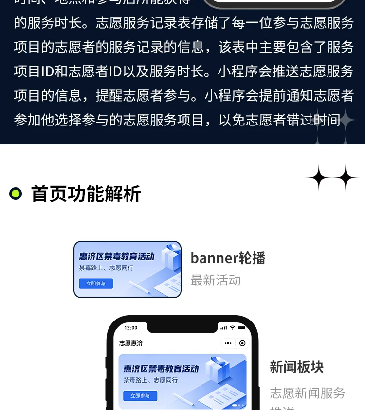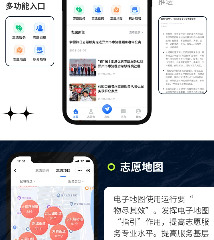 志愿者小程序定制开发的功能模块可以围绕志愿者招募、管理、活动组织、培训教育、社区沟通等方面进行设计。以下是一些核心功能模块: 1.志愿者注册和认证: -用户可以通过小程序快速完成志愿者注册、填写个人信息、上传身份证明或其他资格证书。 -管理员在后台审核和验证志愿者的身份,以确保其真实性和有效性。 2.**活动信息发布和注册**: -活动发布模块允许组织者发布志愿服务项目,包括活动时间、地点、内容介绍、所需人数、技能要求等信息。 -志愿者可以在线浏览、搜索和注册,通过迷你程序参与活动。 3、志愿者报到及考勤管理: -利用GPS定位、二维码扫描等方式,实现现场报到和志愿者考勤记录。 -提供活动评估和反馈系统,使志愿者和活动组织者能够评估活动的有效性。 4.**培训材料和在线教育**: -发布志愿者培训材料、视频教程和其他教育资源,帮助志愿者提高专业技能和服务水平。 -可以设置在线测试或课程评估,完成学业并通过的志愿者将获得相应的证书或积分奖励。 5.**积分制度和荣誉奖励**: -设计一个积分系统,根据参与的持续时间和质量等因素对志愿者进行积分奖励。积分可用于兑换礼物、参加特殊活动或提高等级。 -推广荣誉奖章制度,表彰优秀志愿者,增强志愿者积极性。 6.**社区交流与动态共享**: -建立志愿者社区论坛或动态分享区,促进志愿者之间的经验和见解交流,并分享有关公益活动的信息。 -设立专题讨论区,发起热点话题讨论,增强团队凝聚力。 7.个人中心和数据统计: -在个人中心展示志愿者的个人信息、参与记录、积分、荣誉等。 -后台数据统计和分析功能有助于管理人员了解志愿者参与情况、活动效果和整体服务质量。 8.**通知推送和消息提醒**: -将活动更新、报名确认、培训通知等相关信息实时推送至志愿者移动设备,确保重要信息及时沟通。 以上模块可根据实际应用场景进行组合优化,旨在打造一个便捷高效的志愿服务平台。