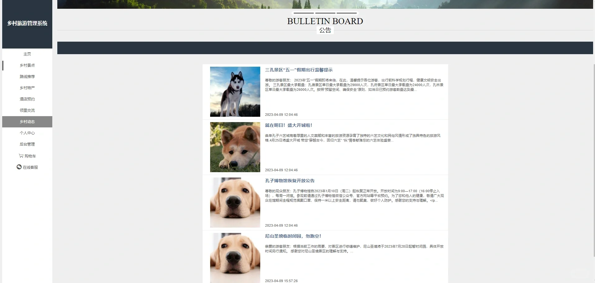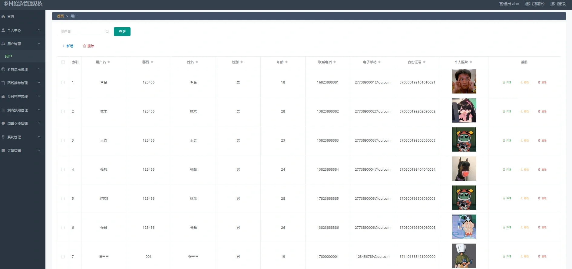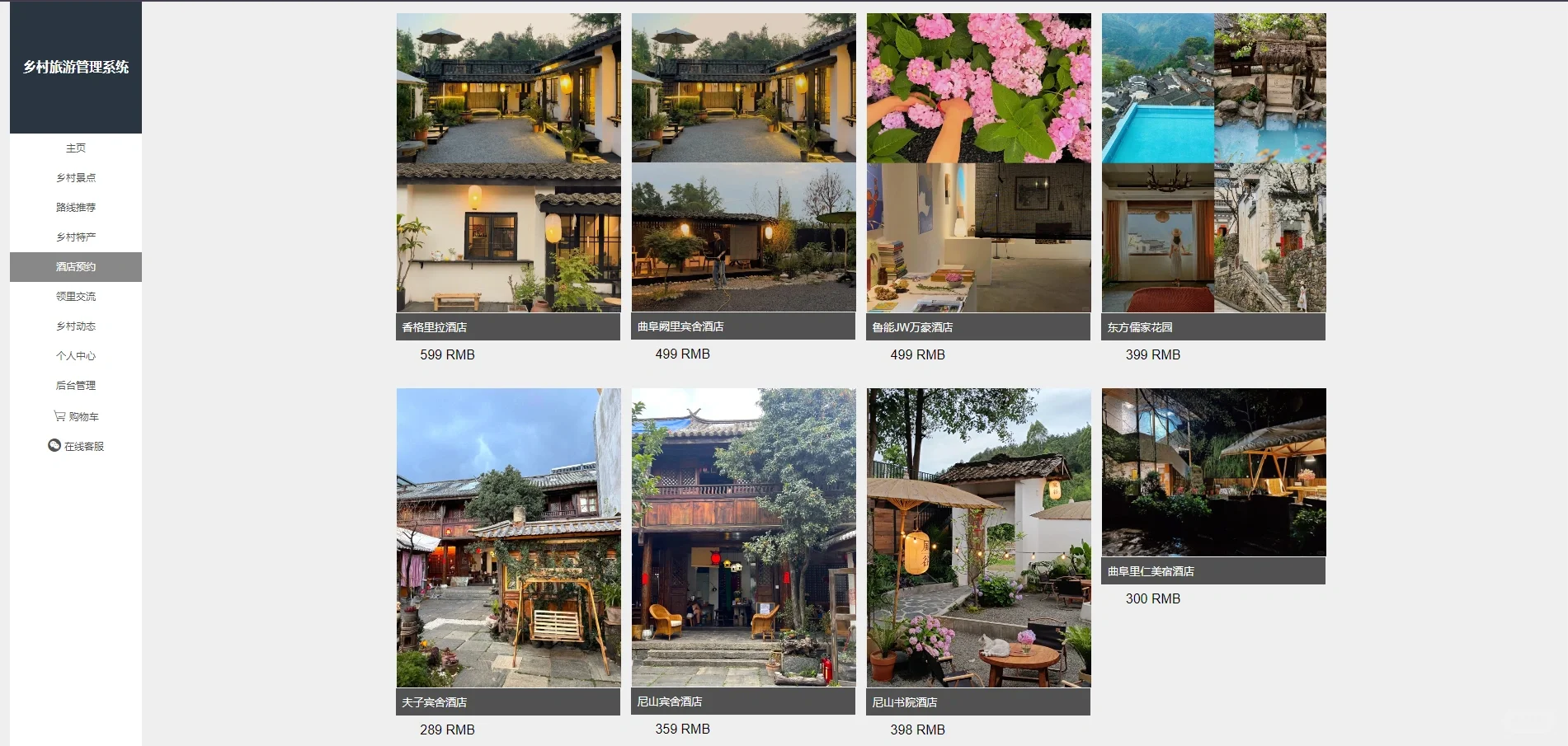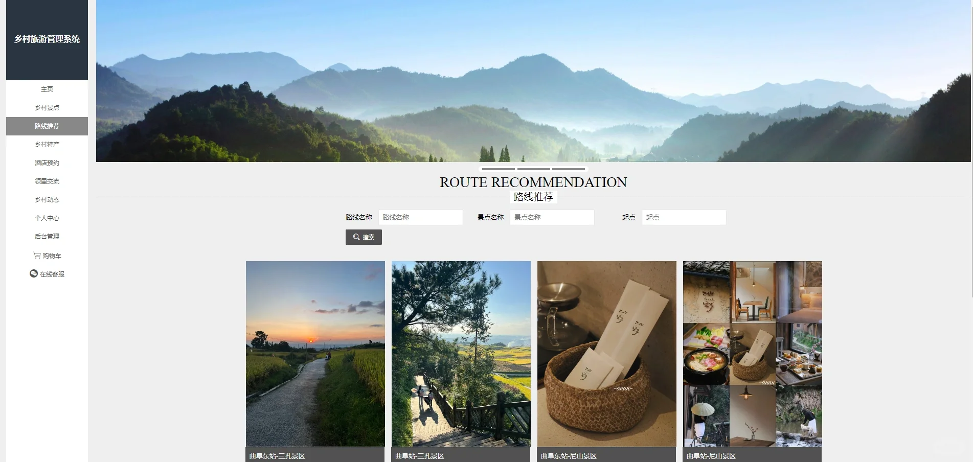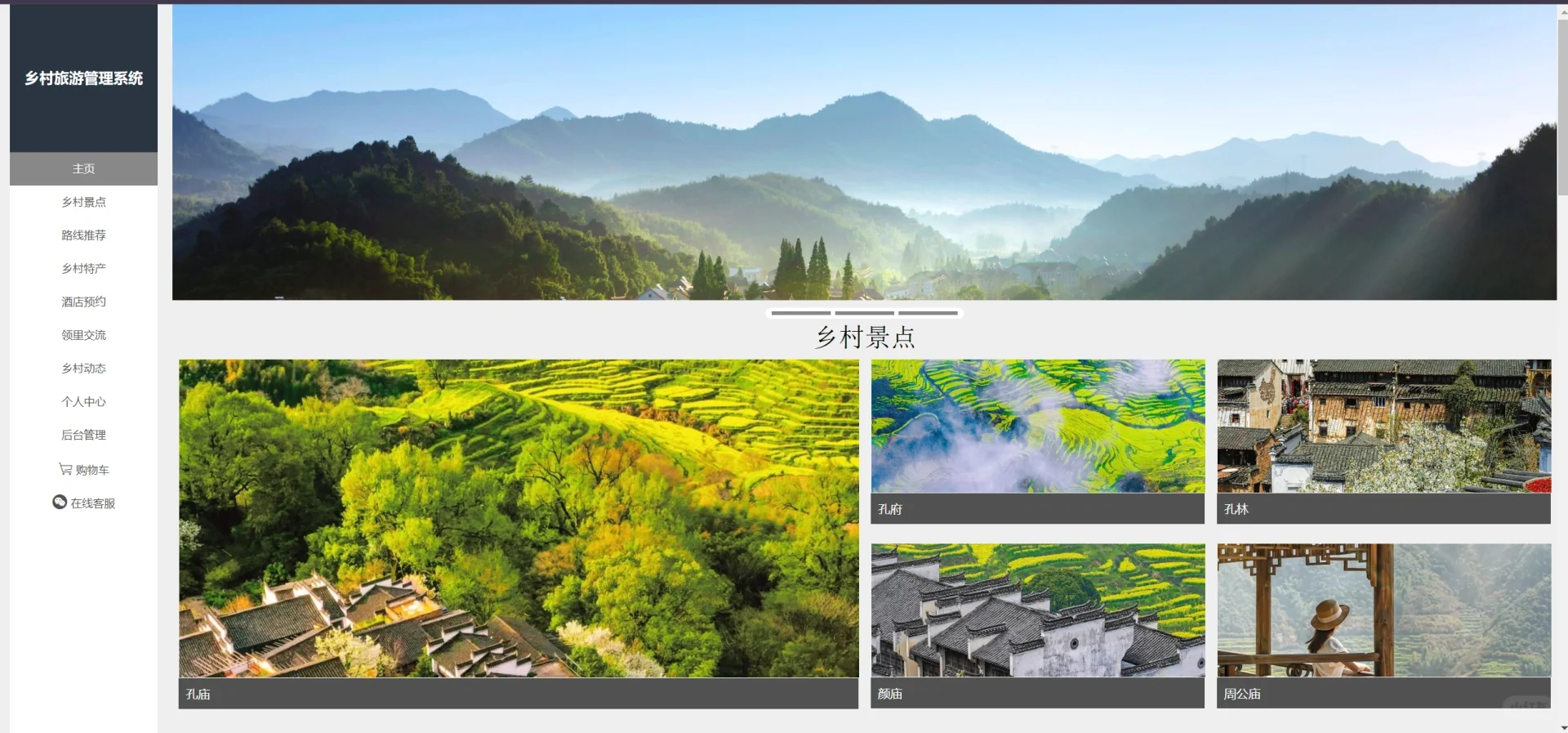 乡村旅游推荐系统源代码|Java|SSM|SpringBoot|推荐|Vue|网站|提供远程部署 【重要①】前后源代码+运行调试+项目部署说明 【重要②】请准确购买正版源代码,仅提供教程视频 【包含内容】 【1】 相关技术堆栈文件 【2】 源代码说明视频(目前正在录制中,将很快提供,如果没有,可以提供其他类似的项目说明视频) 【其他服务】 【1】 可以提供远程部署和安装,打包环境 【2】 提供与软件相关的安装包 【3】 我们的商店提供免费的Javaweb快速入门材料,即使是初学者也可以开始修改源代码(购买后联系我们) [技术堆栈] ① 体系结构:B/S、MVC ② 系统环境:Windows/Mac ③ 开发环境:IDEA、JDK1.8、Maven、MySQL ④ 技术堆栈:Java、MySQL、Spring、SpringMVC、Mybatis、JSP 【功能模块】 ① 前台:乡村景点、路线推荐、后台管理、个人中心、乡村特色菜、乡村更新、购物车等 ② 后台:乡村景点管理、线路推荐管理、用户管理、乡村专业管理、管理员管理、系统管理等
