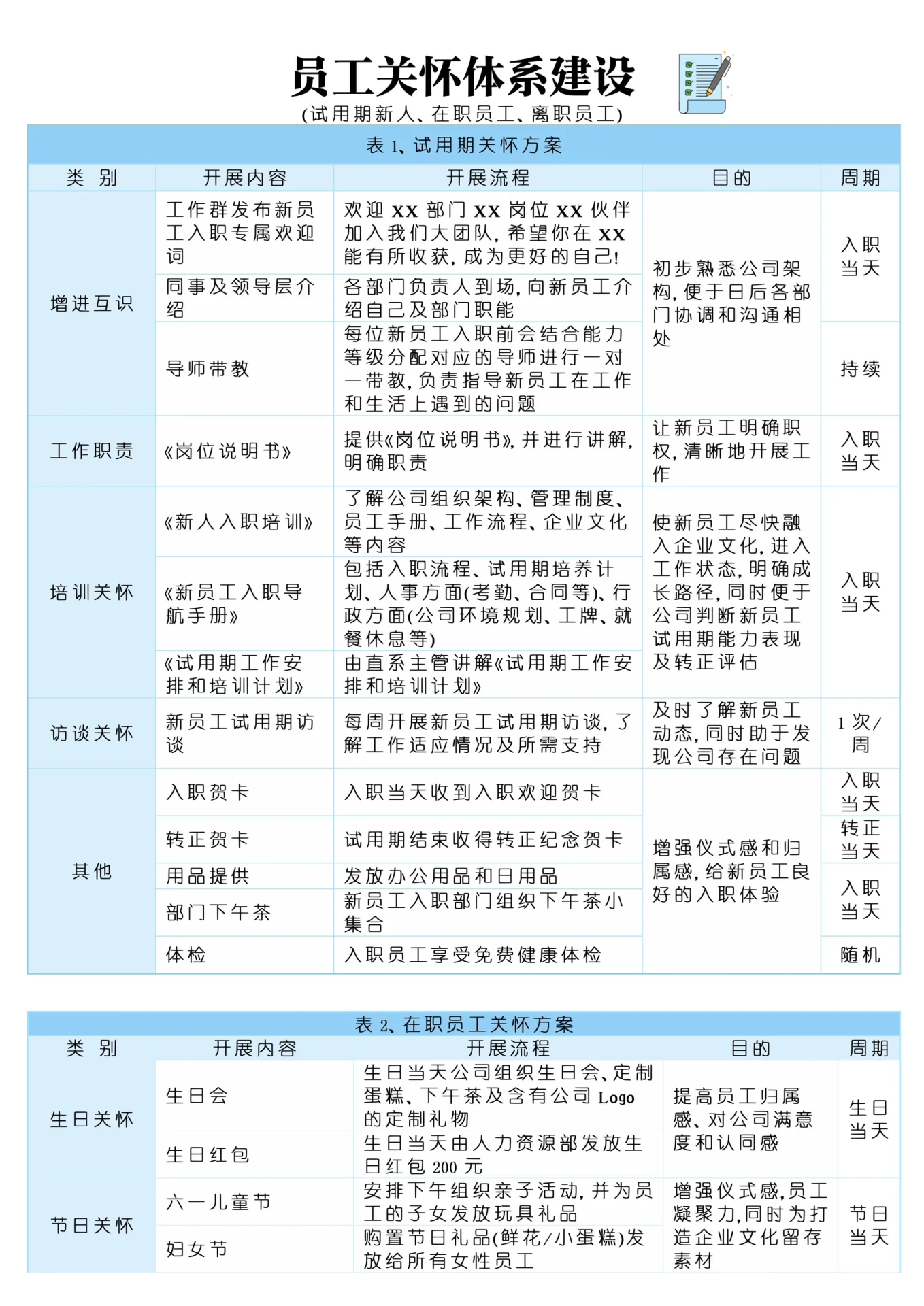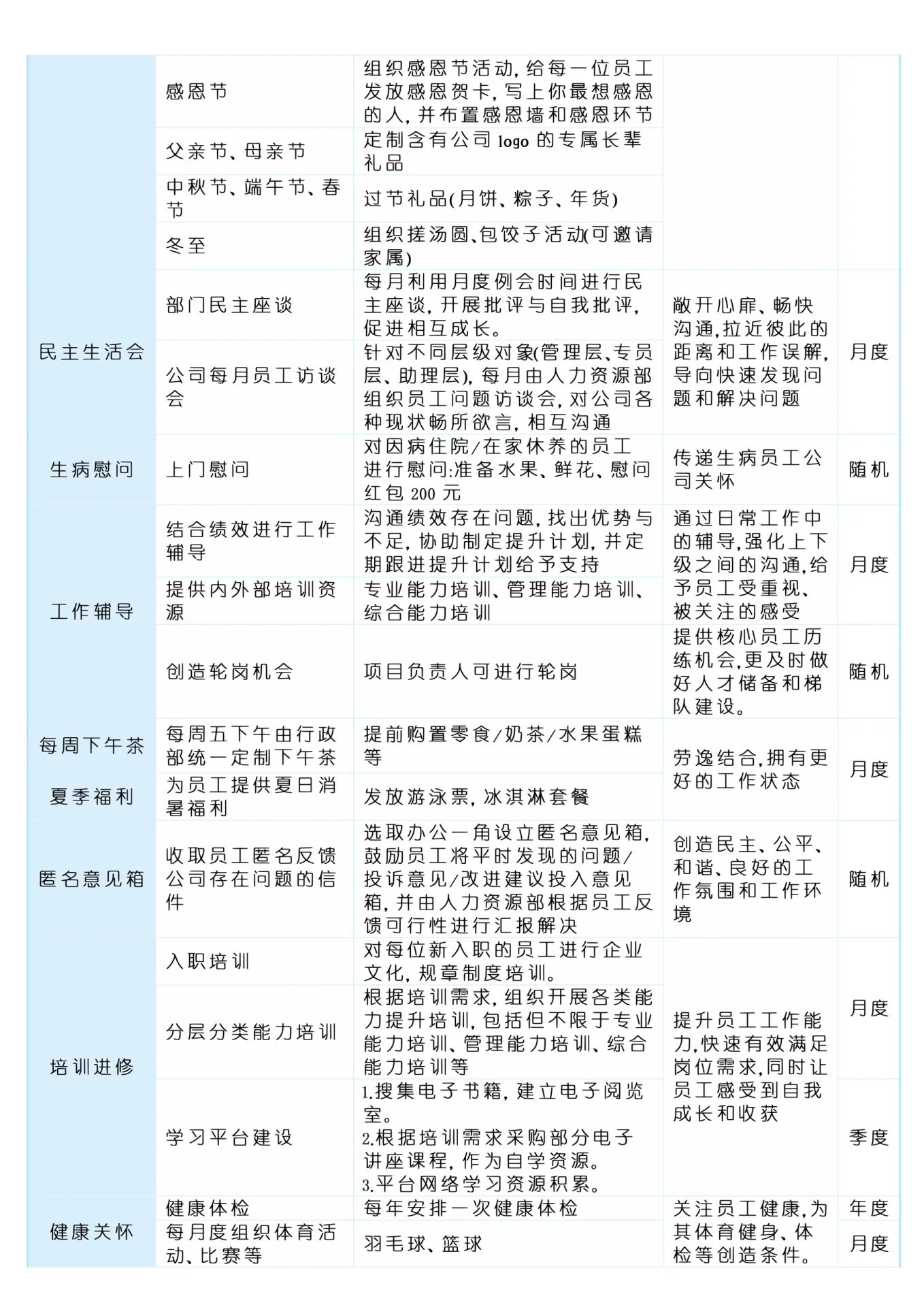 对于一个企业来说,最为重要的就是员工了。如果没有员工,企业将没有任何生存的可能,员工是企业生存的根本,企业可以体现员工的价值。有干劲的员工,才能让企业越做越强。所以企业想要成功,必须从关爱员工开始! 1、员工福利待遇。 企业的员工最关系的莫过于自己的福利待遇,如果福利待遇不好,相信企业员工只能慢慢流逝,保留员工必须先做好员工的福利待遇。当福利待遇让员工满意,这样才能让员工做事更有千劲,才能给企业创造更大的.价值。 2、关心员工从心开始。 企业员工经常会遇到加班加点赶进度的问题,虽然员工不会说什么,但是如果这个时候企业不做什么?难免会让员工心理不舒服。在员工加班时,提供加班晚餐,晚上加班报销车费等等,都能体现企业对员工的关爱,这样员工加班也会任劳任怨。 3、对于特殊员工的关爱。 当员工遇到问题时候,优先帮助员工解决问题。比如员工家属出现严重疾病时,企业进行慰问,发放慰问金。预支员工工资解决燃眉之急。甚至于很多福利好的公司,每年都可以报销一定的医疗费用。对于这样的企业,员工怎么会舍得离开呢? 4、关怀员工健康,防范于未然。 关爱员工健康,就应该先从定期组织员工体检。定期做健康体检。员工健康,才能为企业创造更大的价值。 5.工作环境关怀。 免费下午茶、甜点等;员工休息区域;母婴室。 6.制度与流程关怀. 企业文化宣传;员工面谈;新来员工茶话费。