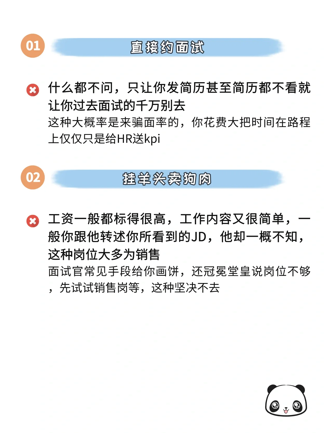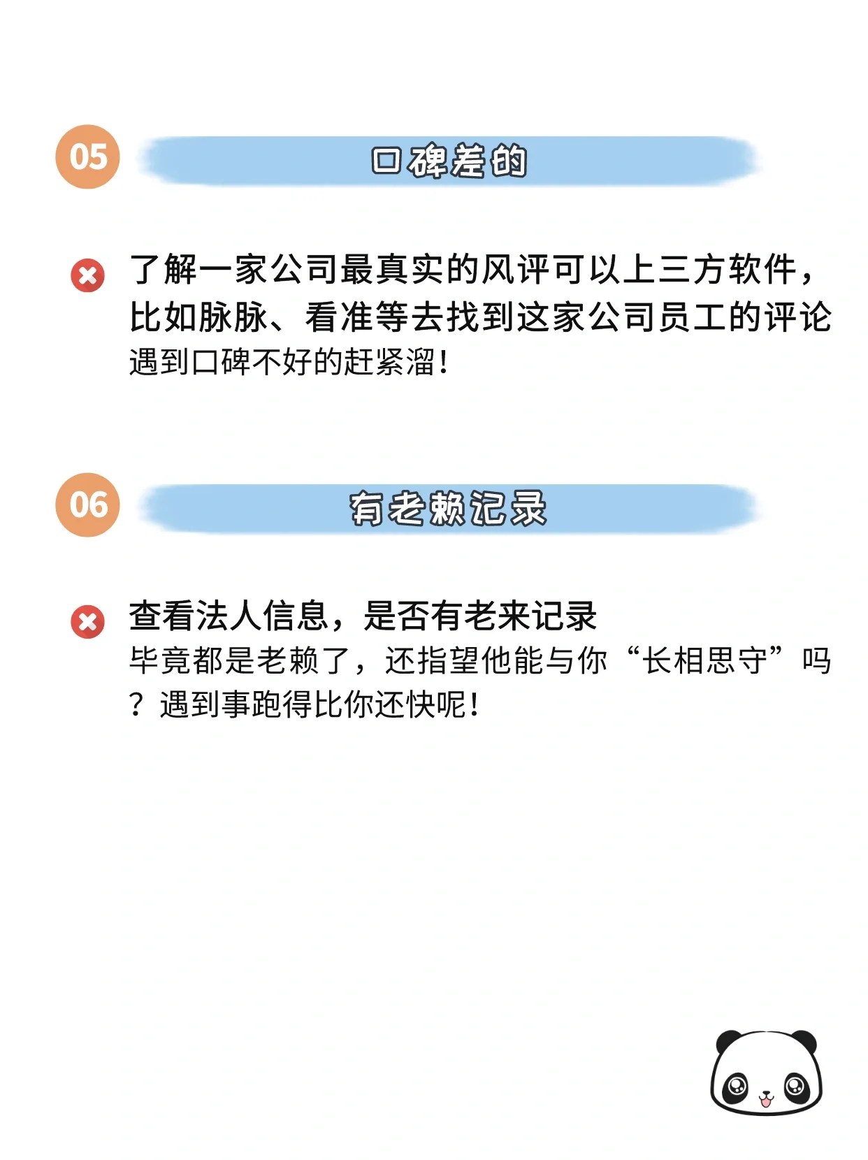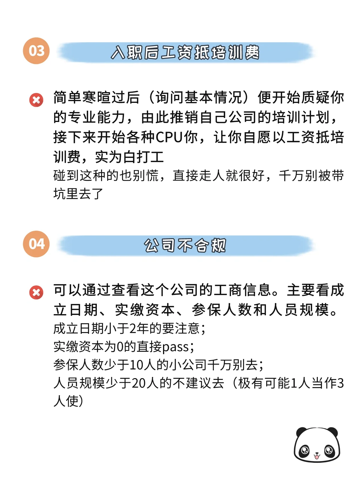 近日,有同学私信,说自己遇到垃圾公司了? 具体流程是HR在审阅简历后直接安排面试。一个1.5小时的车程和2分钟的采访导致了不恰当的回应? 这显然是诈骗率吗?❗ · 我姐姐能理解每个人急于找工作的心情,但我们不应该急于就医❗❗❗ ? 找工作是一个两种选择的过程,作为职场新人,我们需要有与公司进行反向面试的意识,以防止潜在的风险 · 为了避免在找工作时被无良公司欺骗,今天学姐就来列举一下垃圾公司的七大特点。遇到他们就别走?♀️ ⚠️ 直接安排面试 你问的任何问题都是“我们见面时会详细讨论” ⚠️ 挂羊头卖狗肉 面对面操作,实际销售 ⚠️ 入职后,工资与培训费相抵 主观判断你的能力不够,我们将为你提供专业培训,并要求你支付工资,以表明你的决心 ⚠️ 公司不合规 注意查看业务信息(成立日期、实收资本、参保人数、人员规模) ⚠️ 糟糕的口碑 使用第三方平台查看公司员工的真实评估 ⚠️ 查看法定代表人信息,查看是否有赖账记录 你是不是已经是个游手好闲的人了,还希望按时拿到工资 · ? 在去面试之前,学生们不仅需要对公司进行反向调查,还需要问清楚这六个问题:试用工资打折了吗❓ 会有五险一金吗❓ 工资结构是什么❓ 如果申请实习职位,有机会成为全职员工吗❓... 你能转到特定脚本的顶部吗?自己查看笔记~ ❌ 难道不认为这是轰炸问题吗?这会引起人力资源部的不满吗?他们有义务回答吗?,简而言之,提前了解必要的信息可以避免浪费行程❗