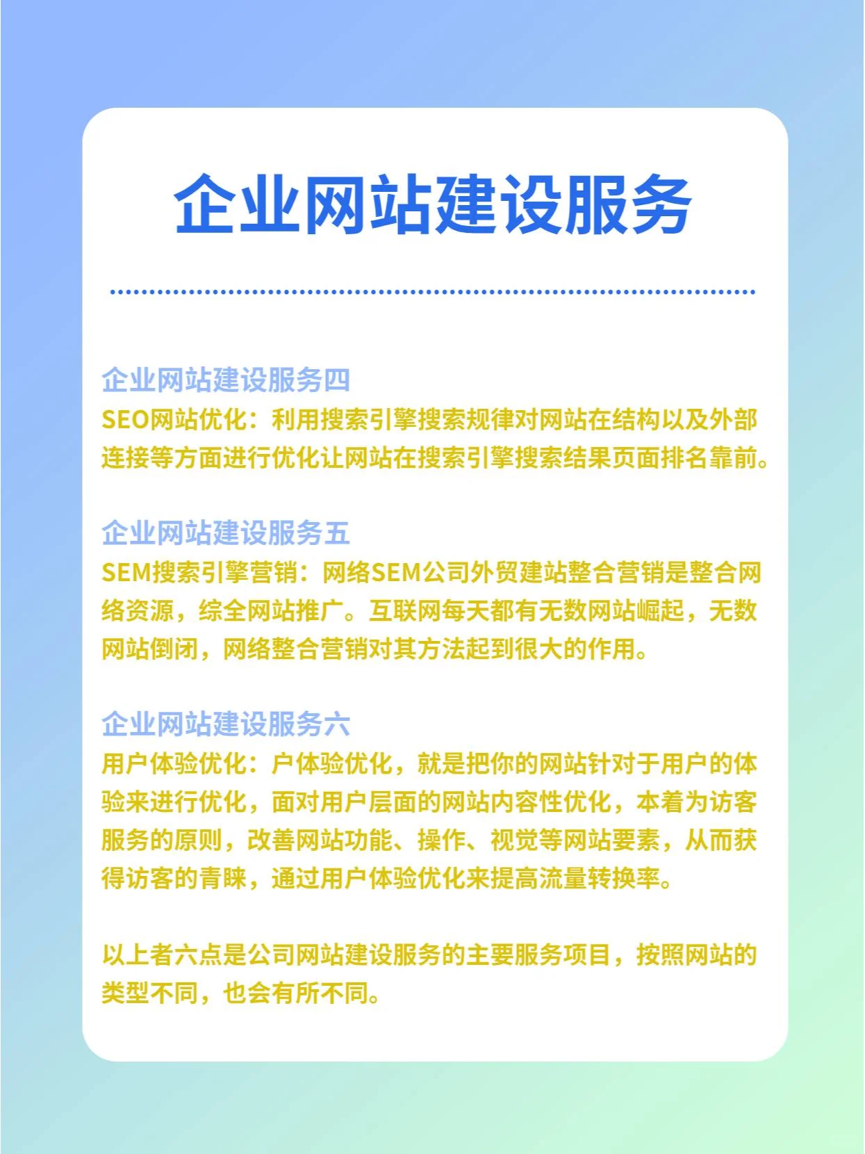 企业网站建设服务的内容是什么?它是衡量外包网站建设公司专业性的重要标准。如果你的公司想找到这样一家公司,他们应该承诺为你的网站提供什么服务? 企业网站建设服务1 基本服务:域名注册、空间租赁、服务器托管/租赁、VPS租赁。 企业网站建设服务二 业务信息(网站建设):面向市场的网站建设、商场建设、OA办公协作、门户网站建设、网站维护、品牌设计等业务。 企业网站建设服务三 网站推广服务:SEO推广,如百度推广、360推广等。 企业网站建设服务四 SEO网站优化:利用搜索引擎搜索模式优化网站的结构和外部连接,使其在搜索引擎搜索结果页面上排名靠前。 企业网站建设服务五 SEM搜索引擎营销:网络SEM公司外贸网站整合营销是对网络资源的整合和网站的全面推广。每天,互联网上都有无数的网站在崛起和崩溃,而在线综合营销在其方法中发挥着重要作用。 企业网站建设服务六 用户体验优化:用户体验优化是基于用户体验优化网站的过程。面对用户层面的网站内容优化,基于服务访问者的原则,改进网站功能、运营、视觉元素等,以获得访问者的青睐,并通过用户体验优化提高流量转化率。 以上六点是公司网站建设服务的主要服务项目,可能因网站类型而异。