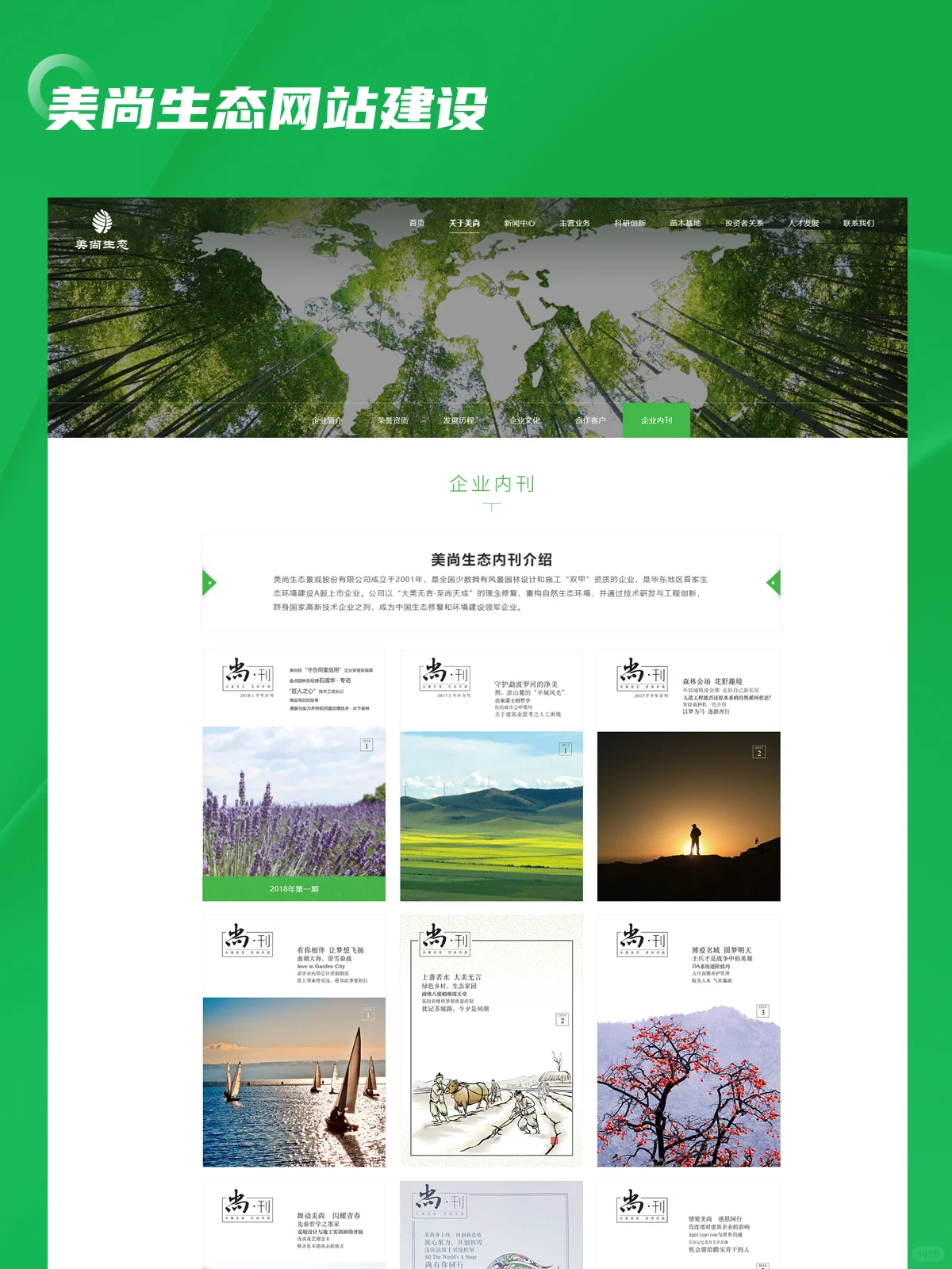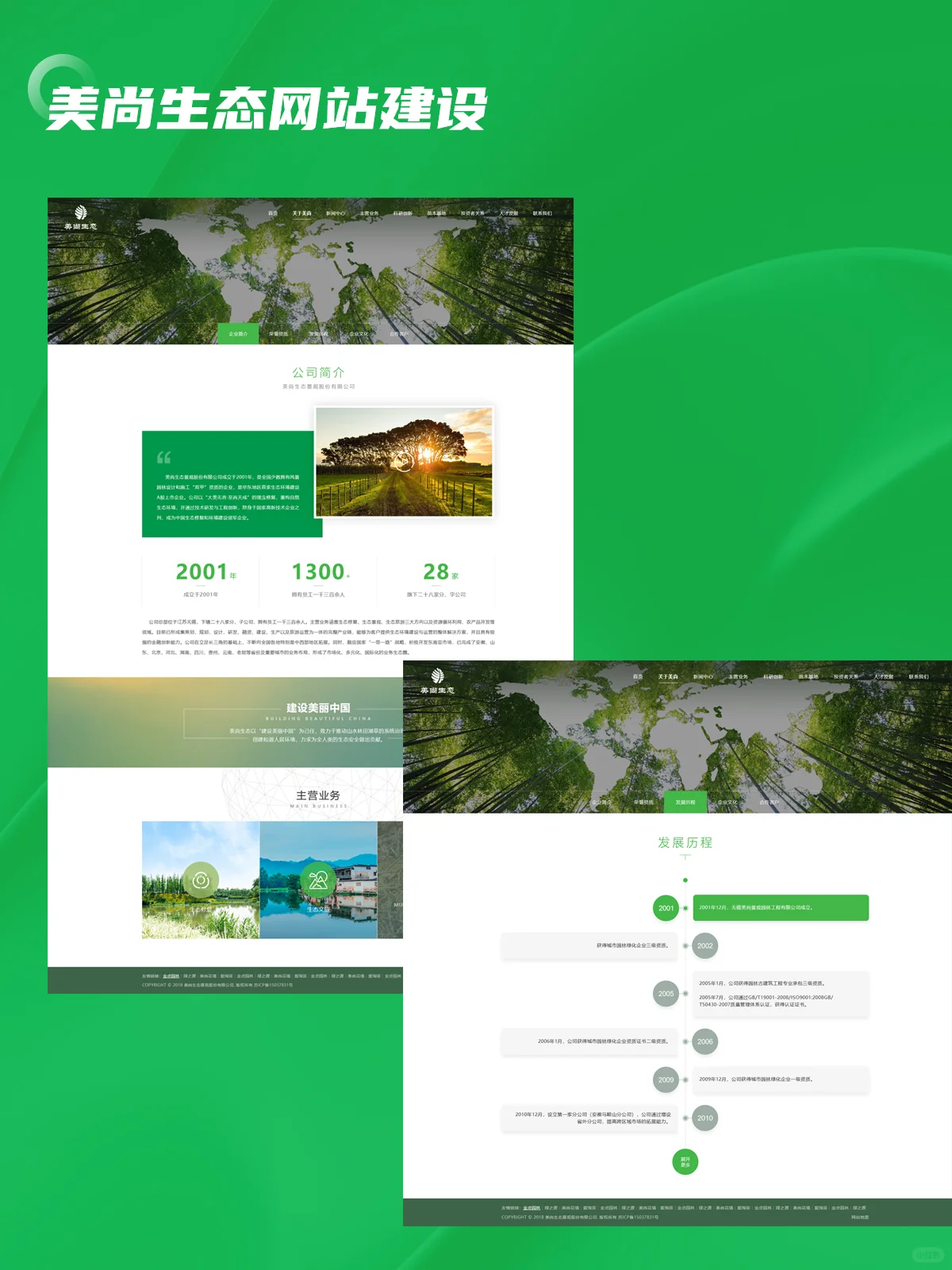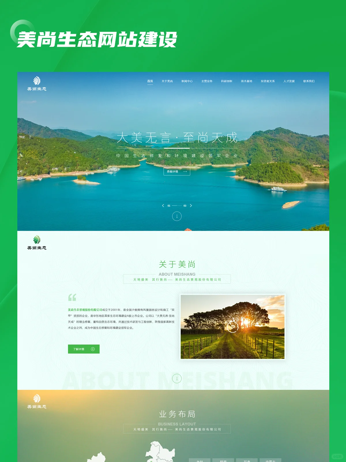 1.客户简介: 有限公司成立于2001年,总部位于广东深圳。是生态景观建设领域的A股上市企业。 公司深耕生态景观建设行业20年,以“大美、无言、尊自然”的理念,恢复和重建自然生态环境。我们的主营业务涵盖三大领域:生态旅游、生态修复和生态产品。我们已形成集规划、规划、设计、研发、融资、建设、生产、招商、旅游运营为一体的完整产业链,为客户提供生态环境建设和运营的全方位服务。是矿山修复的龙头企业,是整个生态、文旅产业的服务商,是国内领先的木曲有机覆盖物和新型优良生态植物的集成商。? 2.客户要求: 增强官方网站的形象,使后端变得简单和用户友好。用户是否希望通过官方网站获得良好的视觉体验,并能够快速找到他们需要的信息? 3、项目亮点: ① 符合行业属性,滚动设计,用户满意度高。 ② 版权合规:当涉及到各种材料时,是否有必要确保版权所有权,通过合法渠道购买,并担心版权?