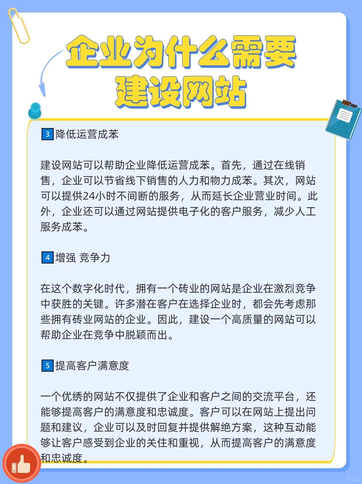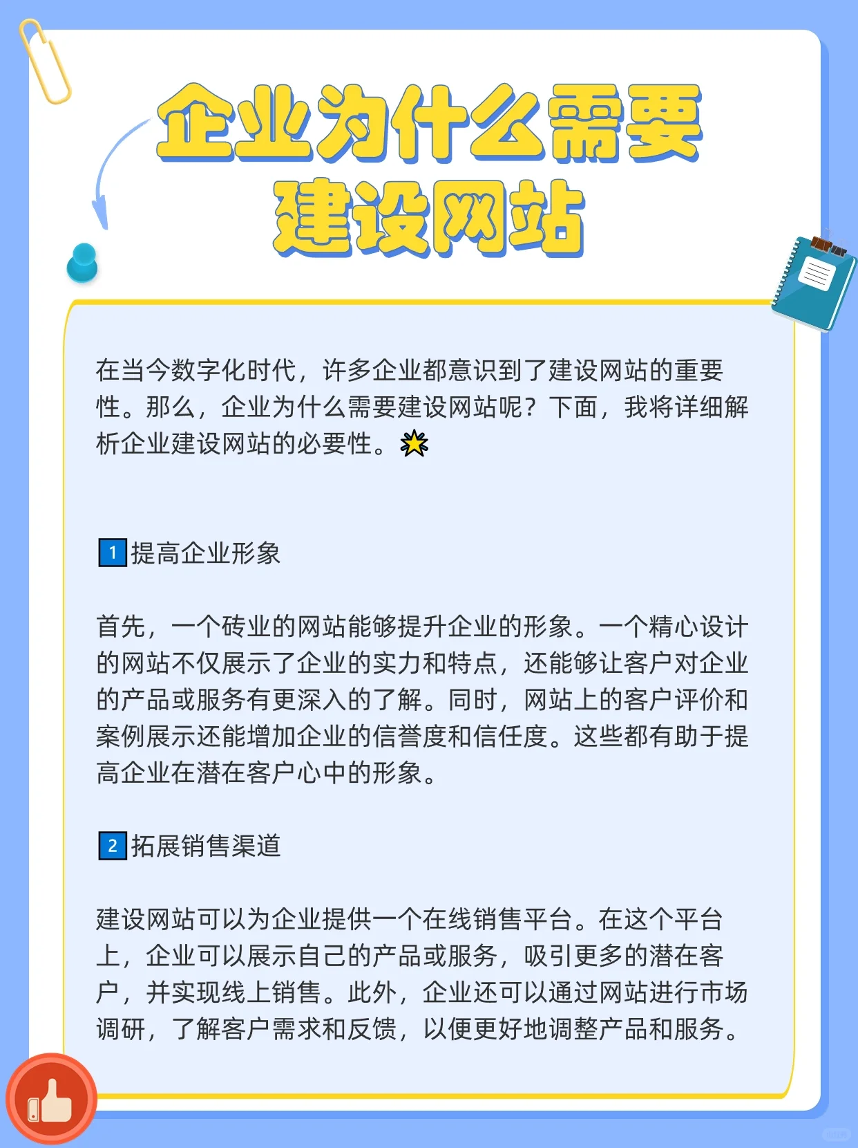 在当今数字化时代,许多企业已经意识到建设网站的重要性。那么,为什么公司需要建立网站呢?接下来,我将详细分析企业建设网站的必要性。? 一️⃣ 提升企业形象 首先,一个砖行业网站可以提升公司的形象。精心设计的网站不仅展示了一家公司的实力和特点,还让客户对公司的产品或服务有更深入的了解。同时,网站上的客户评论和案例研究也可以增加企业的可信度和信任度。这些都有助于改善企业在潜在客户心目中的形象。 二️⃣ 拓展销售渠道 建立一个网站可以为企业提供一个在线销售平台。在这个平台上,企业可以展示自己的产品或服务,吸引更多的潜在客户,并实现在线销售。此外,公司可以通过网站进行市场调查,了解客户的需求和反馈,以便更好地调整产品和服务。 三️⃣ 减少操作苯排放 建立网站可以帮助企业降低运营成本。首先,通过线上销售,企业可以节省线下销售的人力物力。其次,网站可以提供24小时不间断的服务,从而延长企业的营业时间。此外,企业还可以通过网站提供电子客服,降低了人工服务的成本。 四️⃣ 增强竞争力 在这个数字时代,拥有一个砖行业网站是企业在激烈竞争中获胜的关键。许多潜在客户在选择业务时会首先考虑拥有砖行业网站的公司。因此,建立一个高质量的网站可以帮助企业在竞争中脱颖而出。 五️⃣ 提高客户满意度 优秀网站不仅为企业和客户提供了一个沟通平台,还提高了客户的满意度和忠诚度。客户可以在网站上提出问题和建议,公司可以及时回应并提供解决方案。这种互动可以让客户感受到公司的关怀和关注,从而提高客户满意度和忠诚度。 为企业建设网站是当今数字时代的必然趋势。一个高质量的网站可以提升企业形象,拓宽销售渠道,降低运营成本,增强竞争力,提高客户满意度。