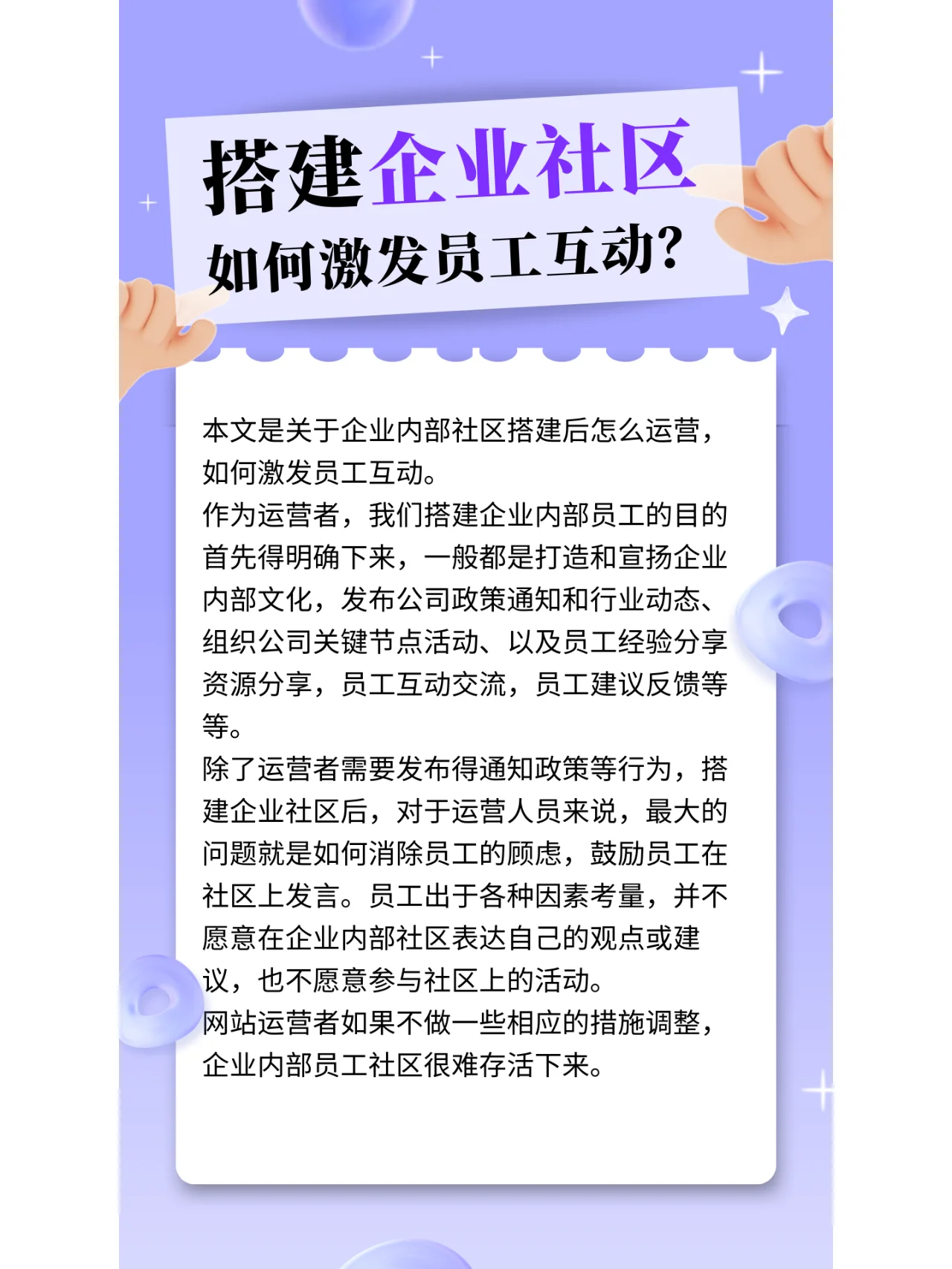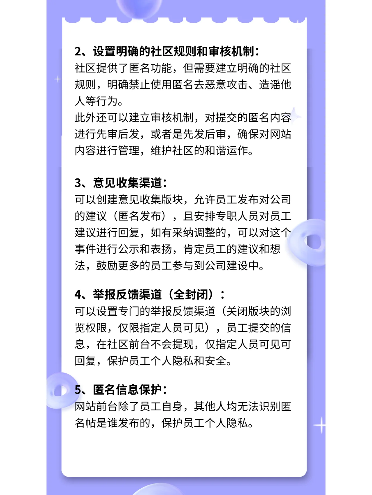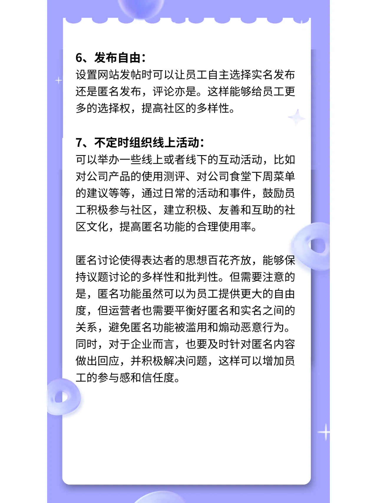 本文是关于如何运营公司内部社区以及如何激发员工互动的。 作为运营商,必须首先明确公司内部员工培养的目的。通常是创建和推广公司内部文化,发布公司政策通知和行业趋势,组织公司关键活动,分享员工经验和资源,与员工互动,提供员工建议的反馈等。 除了运营商需要发布的通知和政策外,运营商在建立企业社区后面临的最大挑战是如何消除员工的担忧,鼓励他们在社区中发声。由于各种因素,员工不愿意在公司内部社区表达自己的意见或建议,也不愿意参加社区活动。 如果网站运营商不采取相应措施进行调整,企业内部员工群体就很难生存。 员工不愿意发帖的原因也很简单,那就是他们不想或不敢在公司表达自己的真实想法,害怕被追究责任或被其他同事定义和批评。 在这一点上,可以考虑引入匿名功能。匿名提供了一种安全感,让那些对公共言论感到紧张或担忧的人感到自由。他们可以自由表达自己的观点或情绪,而不必担心暴露自己的真实身份可能导致的尴尬、冲突或批评。这种匿名性在一定程度上缓解了社交焦虑,使他们能够在社交媒体平台上更自由地表达自己的观点和情绪,而不会受到他人的评判或压力。在匿名环境中,用户可以更直接地分享观点和体验,讨论敏感话题或个人问题,而无需担心被定义或标记。