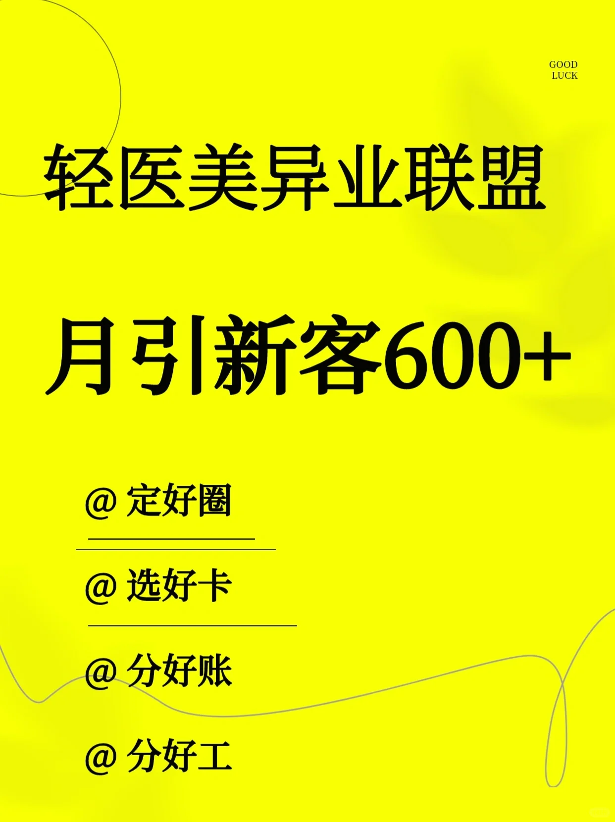 轻医美非常适合通过跨行业合作来推广客户,可以达到1+1>2的效果。今天,让我们举一个例子❤️ [One R]设置圆 找一个商圈,参与30家店铺,销售330张卡片,每家店铺有三个人参与销售。 [2R]选择正确的卡 一张99元的超值卡价值3999,所有商家都提供引流卡选项(这很重要) 【三个Rs】合理分配账目 一⃣ 庄家(医疗美容机构)10%-100000 二⃣ 联盟领袖(胜美店)20%-20000 三⃣ 店主(其他企业的所有者)10%-3000 四⃣ 员工(门店员工)50%-5000 五⃣ 教练(导师)5%-50000 六⃣ 软件(平台工具)5%-50000 【四个R】划分好任务 一⃣ 银行家:找到3-10家美容院的老板 二⃣ 领导:在这个商业区招聘30-50名店主 三⃣ 店主:提供有吸引力的礼物,并将图文交给联盟领导人 四⃣ 员工:在规定时间内完成售卡任务 五⃣ 教练:三次培训,一次指导 [5R]操作要点 一⃣ 设置排水卡折扣项目 二⃣ 进店后订单的转换 三⃣ 软件扩展客户裂变设计 【六R】构建社区联盟流量 一⃣ 建立赋能体系,帮助不同行业的企业做好内容 二⃣ 计划一个整体活动,激活粉丝并将他们转化为客户 三⃣ 优化服务体验,帮助客户转换和留住 四⃣ 创建一个合理的机制,将流量池转化为流量池 [7en R]七种策略 一⃣ 拉新 二⃣ 激活 三⃣ 过滤 四⃣ 服务 五⃣ 重新购买 六⃣ 裂变 七⃣ 合伙企业
