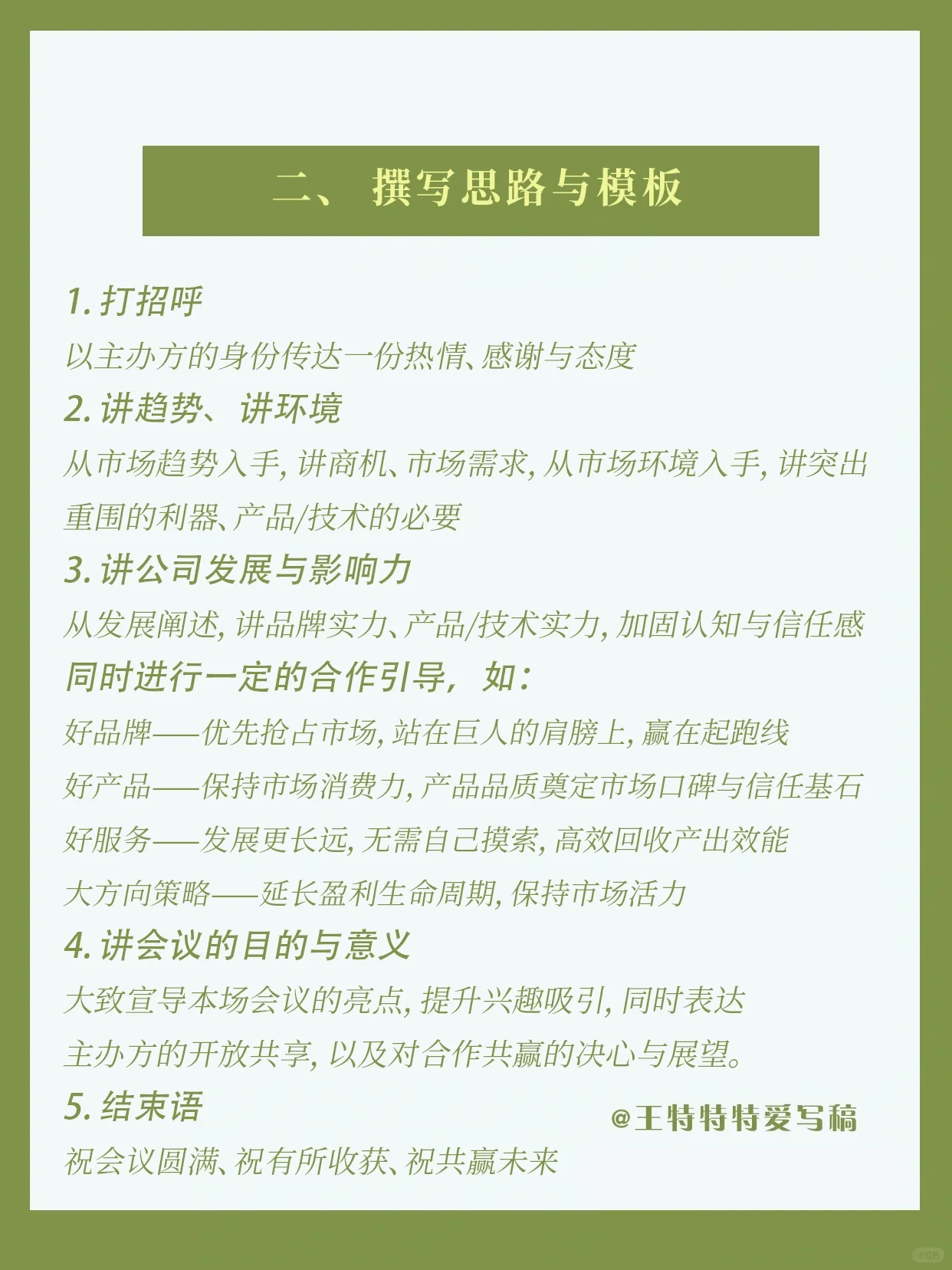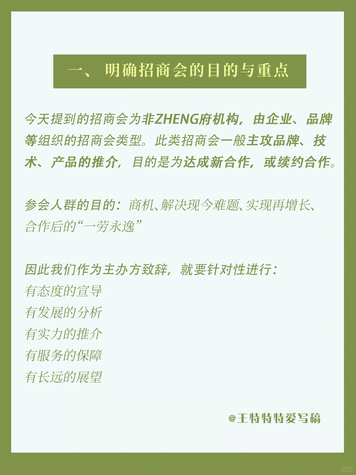 [Star R]首先,明确投资洽谈会的目的和重点 今天所说的招商会是由企业、品牌等组织的招商会,不是政府机构。这类投资促进活动通常侧重于推广品牌、技术和产品,目的是实现新的合作或更新合作。 [列表R]与会者的目的是创造商机,解决当前的挑战,实现进一步的增长,并在合作后实现“一劳永逸” [名单R]因此,作为组织者,我们需要发表有针对性的演讲: 有态度的晋升 发展分析 强大的推荐 有保证的服务 具有长期前景 [星号R]二。编写想法和模板 [一个R]打招呼 以组织者的身份表达热情、感激之情和态度 [2R]谈论趋势和环境 从市场趋势出发,探讨商机和市场需求,从市场环境出发,强调突出需要包围的利器、产品/技术的必要性 【三个R】谈公司的发展和影响力 精心发展,强调品牌力、产品/技术力,强化认知和信任 【私信R】同时提供一定的合作指导,如: 好品牌——优先市场份额,站在巨人的肩膀上,赢在起跑线上 好的产品-保持市场消费力,产品质量奠定市场信誉和信任的基础 良好的服务-长期发展,无需个人探索,高效回收和产出效率 大方向战略-延长利润生命周期,保持市场活力 【四个R】说明会议的目的和意义 大致宣传本次大会的亮点,增强兴趣吸引力,表达主办方的开放与分享,以及合作共赢的决心与展望。 结论 祝大会圆满成功,取得一定成果,共创双赢