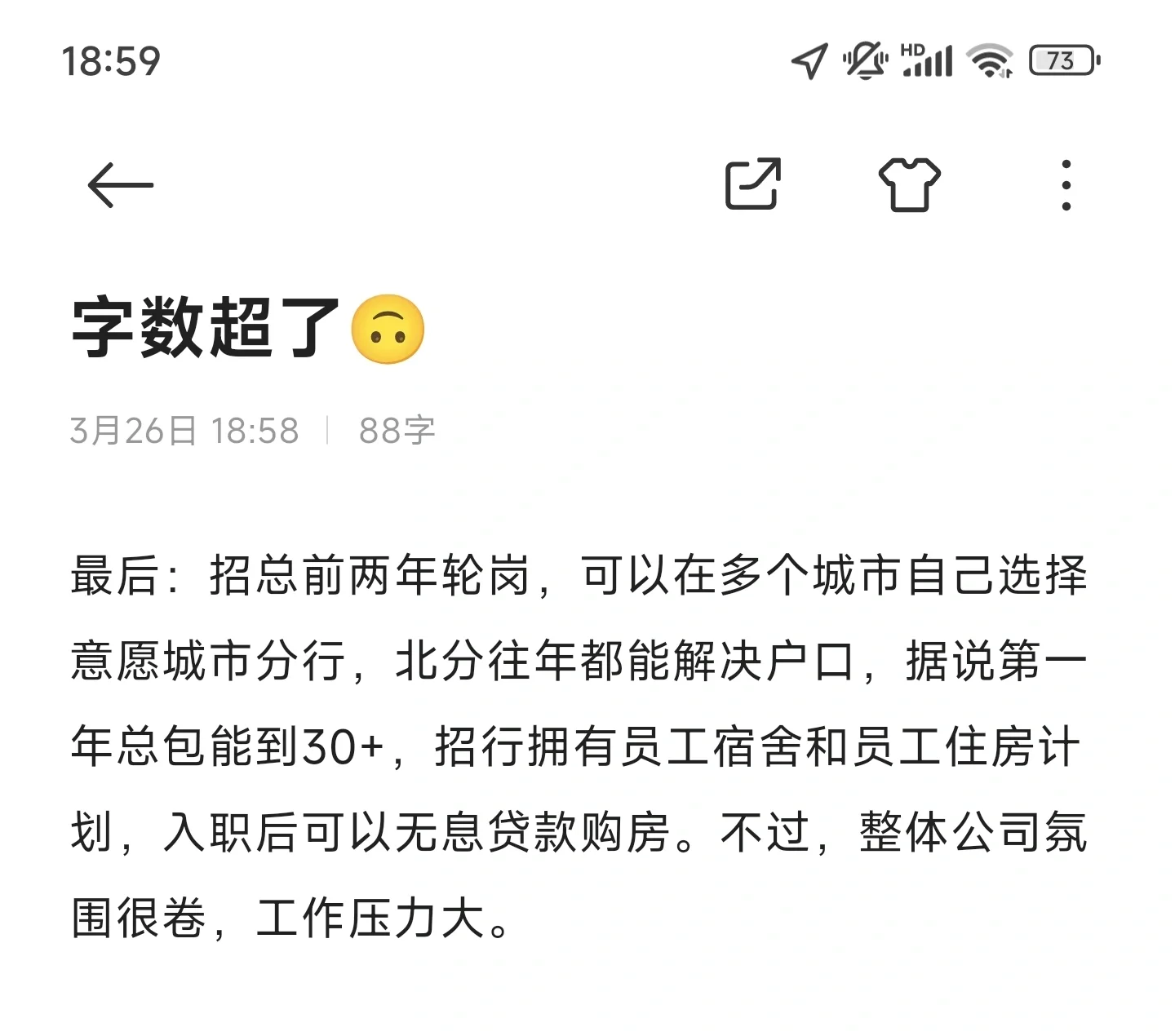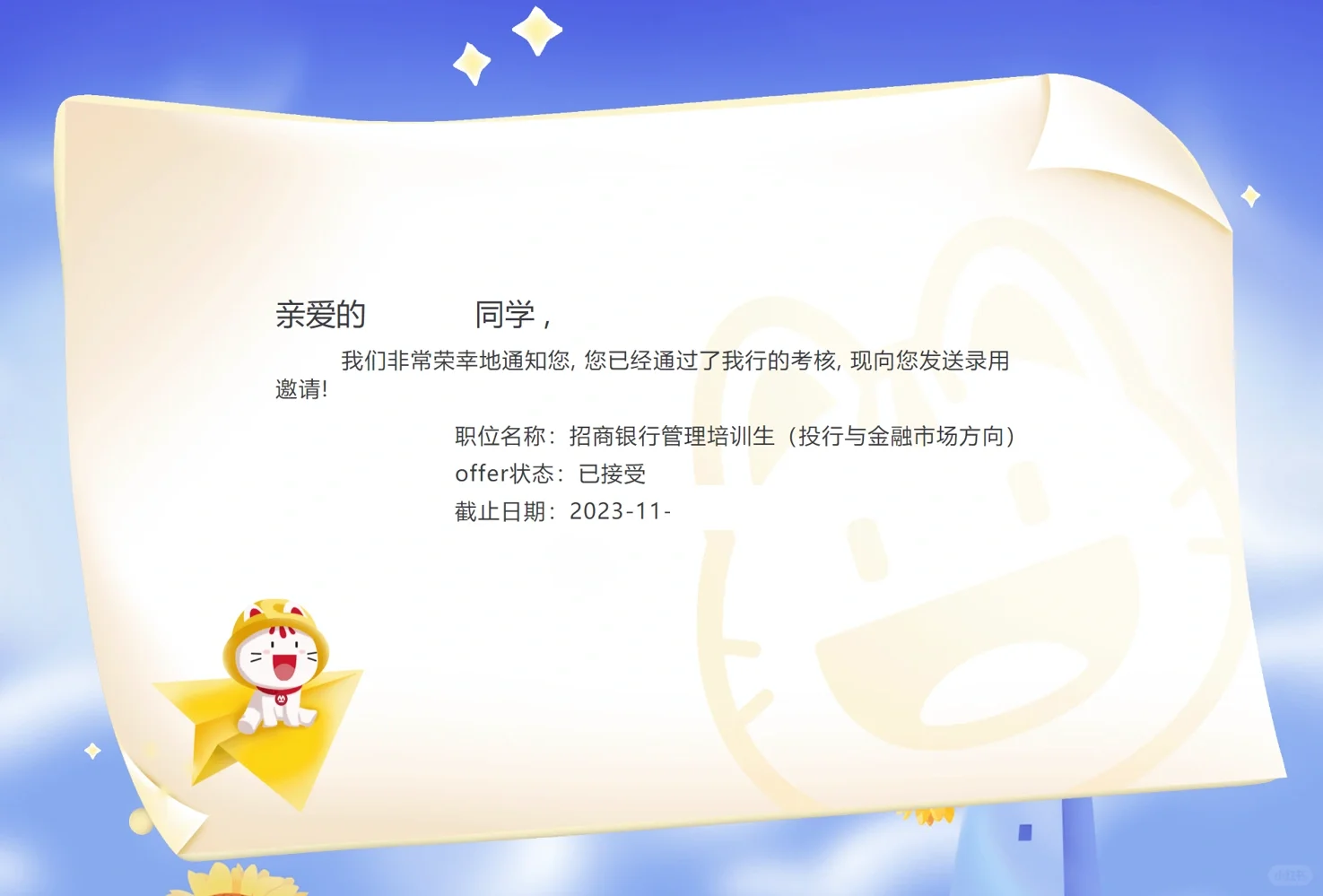 房东提交了2023年秋季招聘的总投资方向,并幸运地收到了报价。根据他当时收集的信息和他向高级同事询问的信息,秋季招聘的整个过程和相关信息总结如下: 从笔试到收到offer大约需要一个半月的时间,时间相当紧张。尤其是复试之后,还有连续一周的线下面试,需要提前做好准备。接下来,让我们简要介绍一下整个过程。欢迎大家收藏和点赞。 一⃣ 笔试:招聘团队的笔试采用简易测试系统。测试后,会有一个游戏部分,第一次遇到它时,你只能盲目选择。建议提前准备,笔试参与者不应太多。 二⃣ AI人脸(一侧):笔试后20天左右发AI人脸通知,AI人脸比较常规。 内容包括一个英语问题和一个汉语问题。这两个问题都在30秒内准备好,发言时间为1分钟。 TIPS:总体通过率很高,但也有一些被刷掉了。据说他们是由人力资源部手动筛选的,我们建议每个人都穿着正式服装回答。 三⃣ 双面:十三天后,人工智能方将发送双面通知,这是一种离线的多对多小组会议,每次大约需要一个小时。 《昭宗》组图极其丰富,是我在《秋昭宗》中参与的最具特色的组图。有几种形式的理解(一些游戏从2021年开始使用,有理由推测2024年也会遇到。例如,北京的150X房间和151X房间多年来一直是相同的游戏)。每个游戏的介绍如下: 1.纸牌游戏:每个玩家按顺序发三张牌,牌的总分必须达到目标分数。 2.盲猜图案:蒙上眼睛后,分发一块刻有图案的硬板,合作寻找与其他人不同的图案。 3.普通的小组会议,没有领导人讨论某个问题或辩论。 TIPS:基本上,每场比赛大约有15人,但实际上,大约有2-3人进入三方。刷脸的人很多,有必要找到表现出色的方法。如果国际学生不方便返回本国参加,他们可以申请冬季比赛并参加第二轮比赛,但那时HC相对较少,难度增加。 四⃣ 三张脸:第二张脸两天后,发三张脸通知。三面通知是一对一的简历,主要用于随意聊天,持续10-15分钟。 主要问题:气氛比较轻松,主要针对简历的行为方面。交付动机、个人经历、对招商银行的了解、过去的实习成绩等。 TIPS:大约50%的三位面试官可以进入四位,所有的面试官都是双面面试官。我们会在三方之前选择所需的工作轮换位置,这直接对应于后续报价上的工作轮换地点和进入后续流程的难度。建议谨慎选择。 五⃣ 四方:三方完成后两天内,将发送四方通知,主要用于项目的PPT答辩和面试。 最后的答辩将分为上午和下午两批,每批都会发送一个统一的主题截止日期。早上,要做好熬夜的准备,并立即报告。早期的防御时间很仓促,但相对来说还是新鲜的。该主题的难度适中,主要用于合规性测试。下午的防守时间更健康,精美的PPT也没有问题。 pre的主题与交付方向有关,后续问题将基于报告内容和个人经历。 简历提交、笔试材料、AI面、第二面、四边答辩材料都已打包。