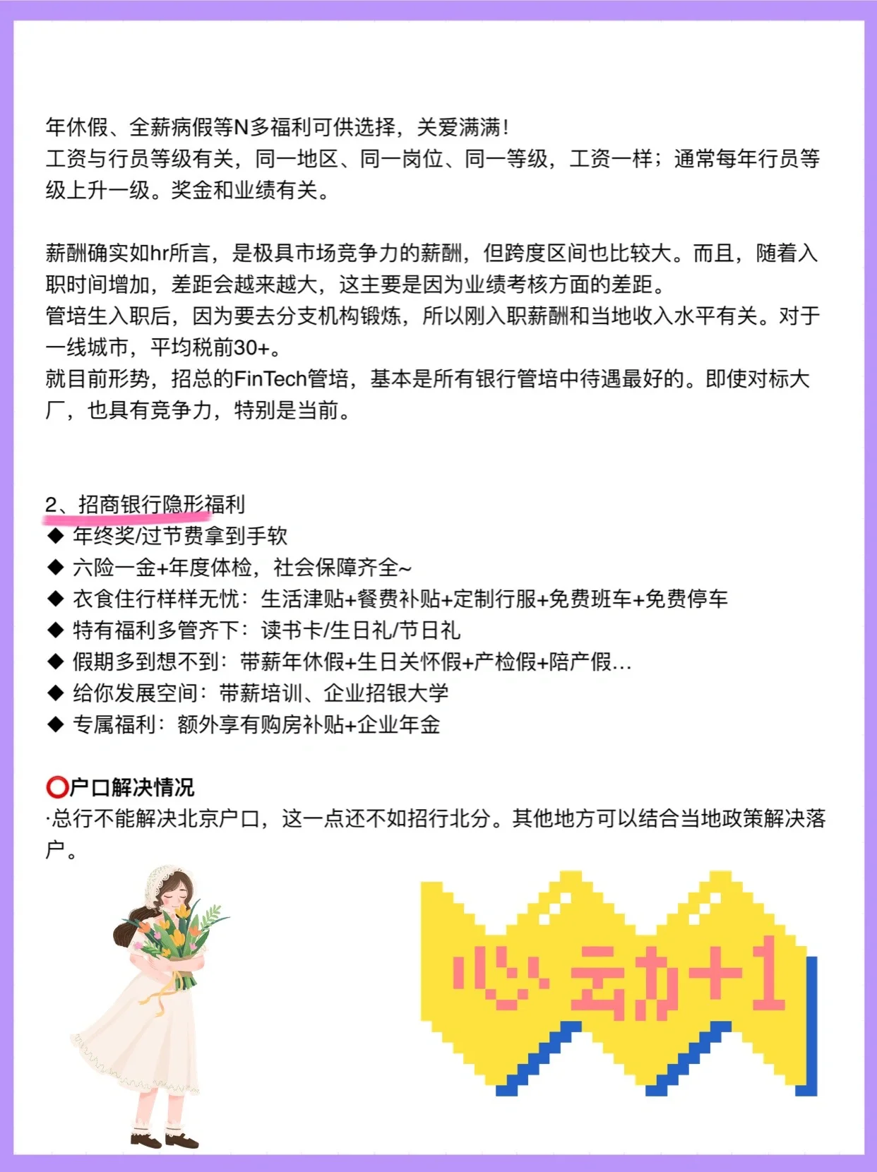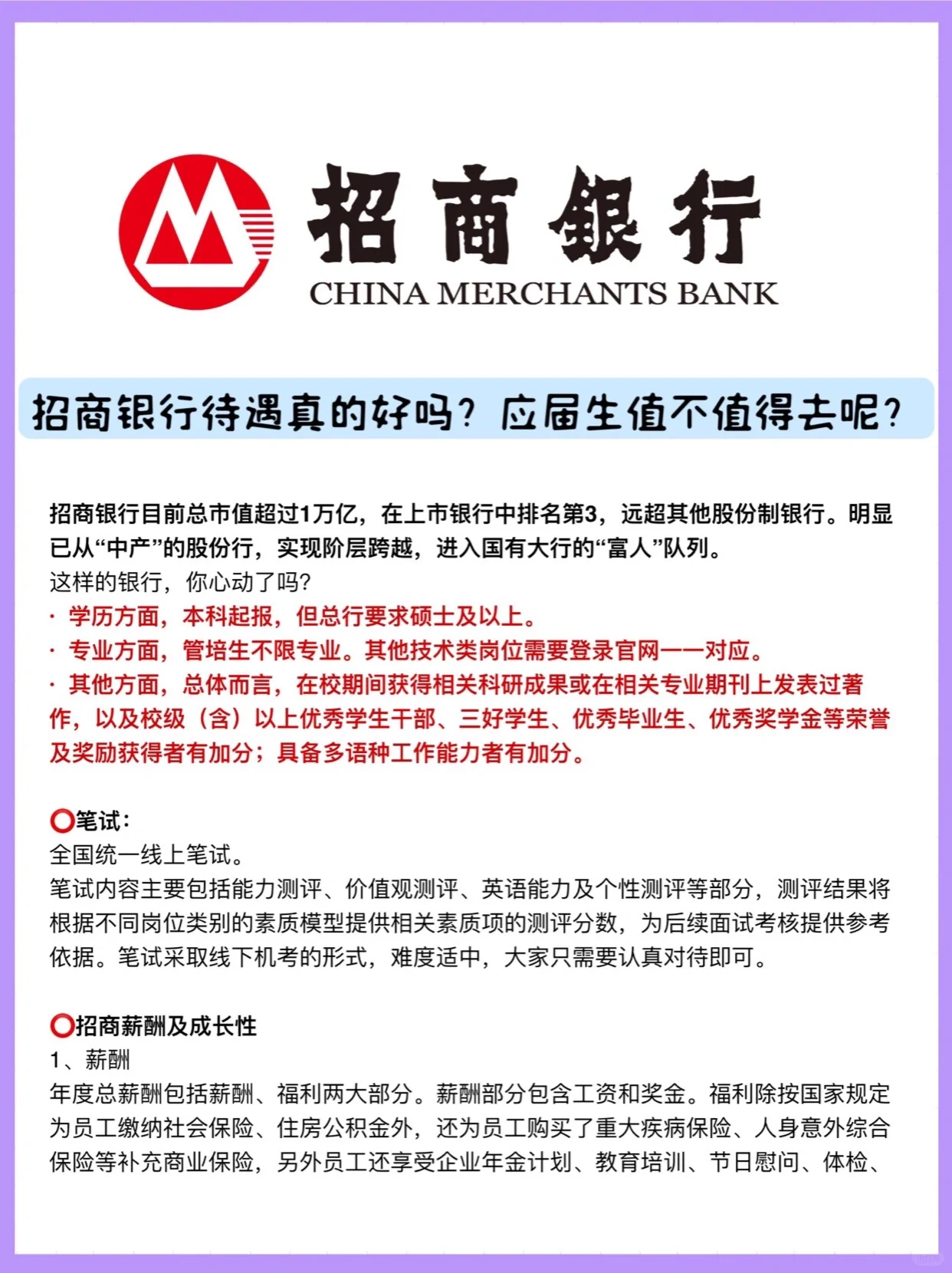 (1) 总部职位 1.管理培训生 通过2年的业务线轮换和3年的专业岗位经验,我已成为“价值银行”业务的专家人才,包括公司金融、零售金融、投资银行和金融市场、目标分支机构、财务会计、法律等领域。 2.金融科技专业学生 通过2年的金融科技项目轮岗和3年的专业岗位经验,我已成为“数字招行”技术专家人才。 3.职能职位(信息技术) 从事信息系统开发、建设和维护工作,成长为既懂IT又懂业务的复合型人才。 4.职能职位(国际结算) 负责审查和处理国际结算业务,提供审计意见反馈,控制操作风险,提供专业指导。通过在跨境文档职位上不少于3年的工作,我已被培训为跨境金融专家,负责跨境金融产品的推广、优化和迭代,并推动业务发展。 (2) 分支机构职位 全国44家分行将同步开展相关职位的招聘工作,此外,各一级分行管辖范围内的二级分行也将同步开展招聘工作。 1.市场营销职位 从事各种银行客户服务和营销职位,包括产品营销、市场拓展、客户关系维护等,成为精通银行业务的市场专家。 2.运营支持职位 从事各类经营结算业务,成长为精通银行业务的业务专家。 3.职能岗位 从事客户管理、风险管理、数据管理、合规管理等岗位,成长为熟悉银行业务的专业人才。 4.信息技术职位 从事软件开发、数据分析、网络及IT专业系统运维,成长为银行业IT专业人士。 (3) 信用卡中心位置 ·技术:包括软件开发工程师职位、系统管理职位/数据库管理职位。 ·数据类型:数据分析岗位,负责各类业务管理策略的数据挖掘和分析。 ·产品类别:产品经理职位,负责信用卡中心产品的研发和创新。 ·营销职位:负责制定信用卡中心的品牌传播策略。 ·职能类别:包括用户研究职位、人力资源职位、业务分析职位、战略规划职位。 (4) 在招商银行集团子公司任职 1.招商银行网络技术有限公司 包括软件开发工程师、前端开发工程师、数据研发工程师、测试与开发工程师、智能运维研发工程师、金融科技职位。 2.招商永隆银行 包括管理培训生和培训生项目。 3.招商银行国际金融有限公司 包括管理培训生项目。 4.招商银行融资租赁有限公司 包括业务营销方向的学员和业务支持方向的学员。 5.招商银行财富管理有限公司 包括研究和交易、风险合规、金融科技、产品销售和业务支持。