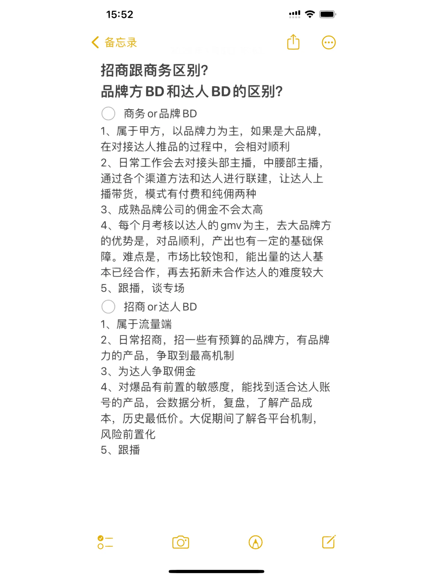 [Fireworks R]商业或品牌BD 1、属于甲方,品牌力是主要关注点。如果是一个大品牌,与有影响力的人联系推广产品的过程会相对顺利 2.在日常工作中,我会与顶级主播和中端主播对接,通过各种渠道和方法与有影响力的人合作,促进销售。有影响力的人有两种模式:付费和纯佣金 3.成熟品牌公司的佣金不会太高 4.月度评估主要基于专家的GMV。去大品牌方的好处是产品质量顺畅,产量也有一定的基础保障。困难在于,市场相对饱和,大多数能够批量生产的影响者已经合作。很难发掘出没有合作过的新影响者 5.跟进,谈论特别会议 [Balloon R]投资或影响者BD 1.属于交通侧 2.日常招商,招募有预算、有品牌力的品牌,争取最高机制 3.为有影响力的人争取佣金 4.之前对爆炸性产品有敏感度,能够找到适合有影响力的客户的产品,能够分析和审查数据,了解产品成本和历史最低价格。了解各种平台的机制,并在大促期间优先考虑风险 5.关注广播