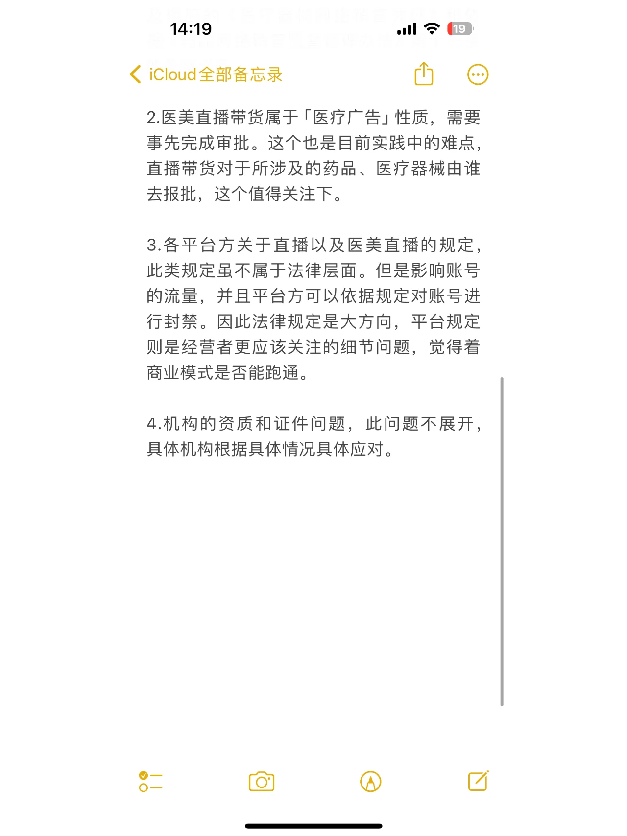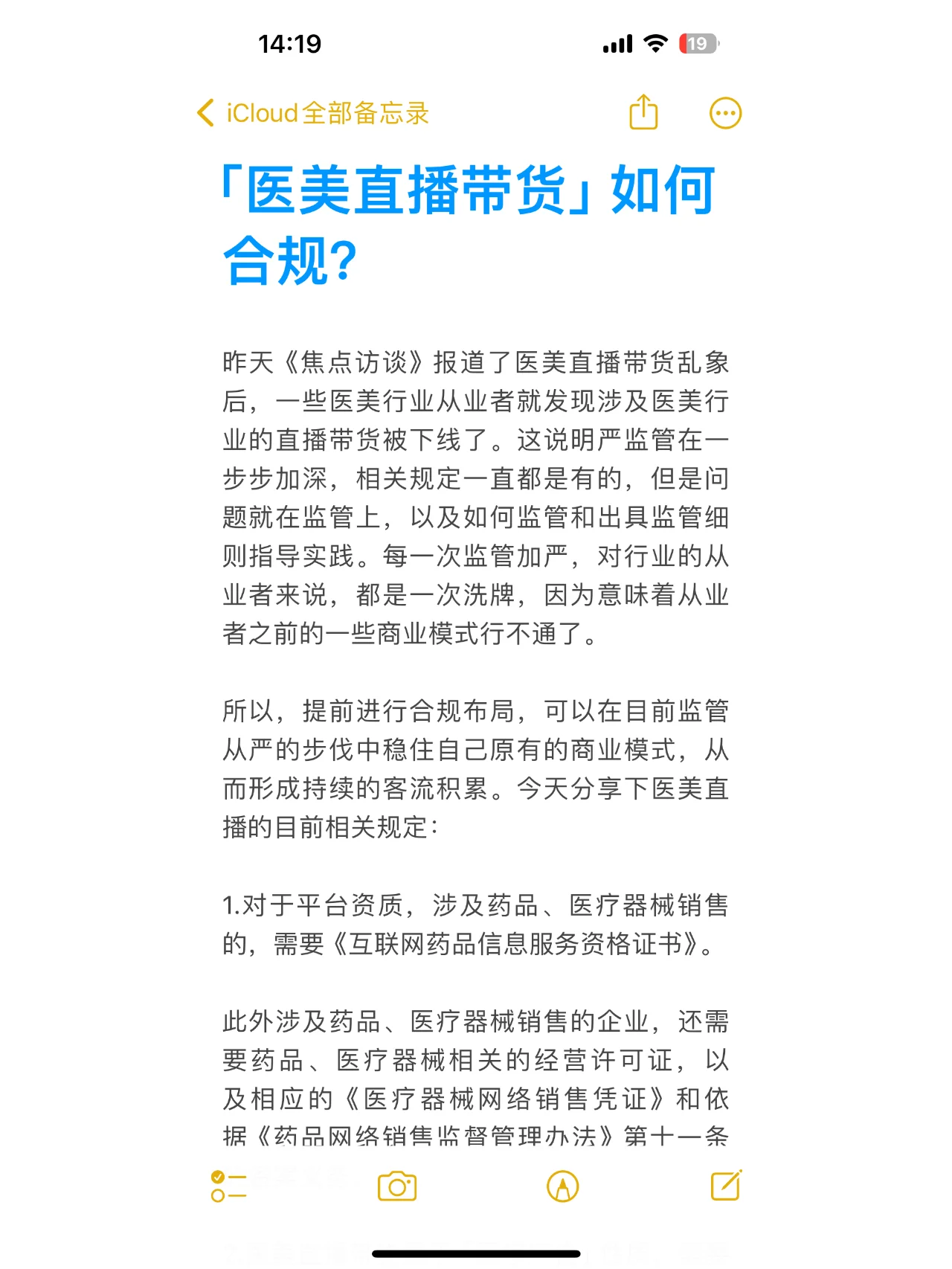 昨日,《焦点访谈》报道了医美直播销售乱象,部分医美行业从业者发现,与医美行业相关的直播销售已经下线。这表明严格的监管正在逐步深化,相关规定始终到位。然而,问题在于监管,以及如何监管和发布监管规则来指导实践。每次监管收紧,对行业从业者来说都是一次洗牌,因为这意味着他们以前的一些商业模式不再可行。 因此,通过提前进行合规布局,可以在当前严格监管的节奏中稳定原有的商业模式,从而形成持续的客流量积累。今天,我们就来分享一下目前医美直播的相关规定: 1.涉及药品、医疗器械销售的平台资质,需要《互联网药品信息服务资质证书》。 此外,参与药品和医疗器械销售的企业还需要与药品和医疗设备相关的营业执照,以及根据《药品网络销售监督管理办法》第十一条规定的相应的《医疗器械网络销售证书》和备案义务。 2.医美直播销售属于“医疗广告”性质,需要事先审批。这也是当前实践中的一个难点。直播销售涉及的药品和医疗器械由谁来申请审批,值得关注。 3、各平台方对直播、医美直播的规定,虽然不属于法律层面。但这会影响该账号的流量,平台可以根据规定对该账号进行封禁。因此,法律法规是大方向,而平台法规是运营商应该更加关注的细节,并考虑商业模式能否顺利运行。 4.不讨论机构的资质和认证问题,具体机构将根据具体情况作出回应。