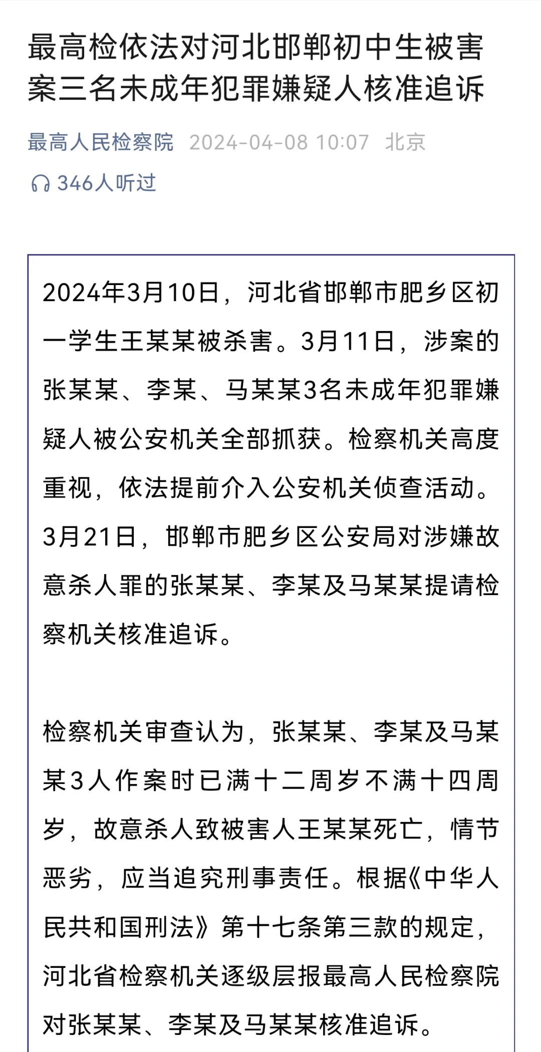 据河北省人民检察院今天(4月8日)消息:河北邯郸初中生被害案件三名未成年犯罪嫌疑人被核准追诉。