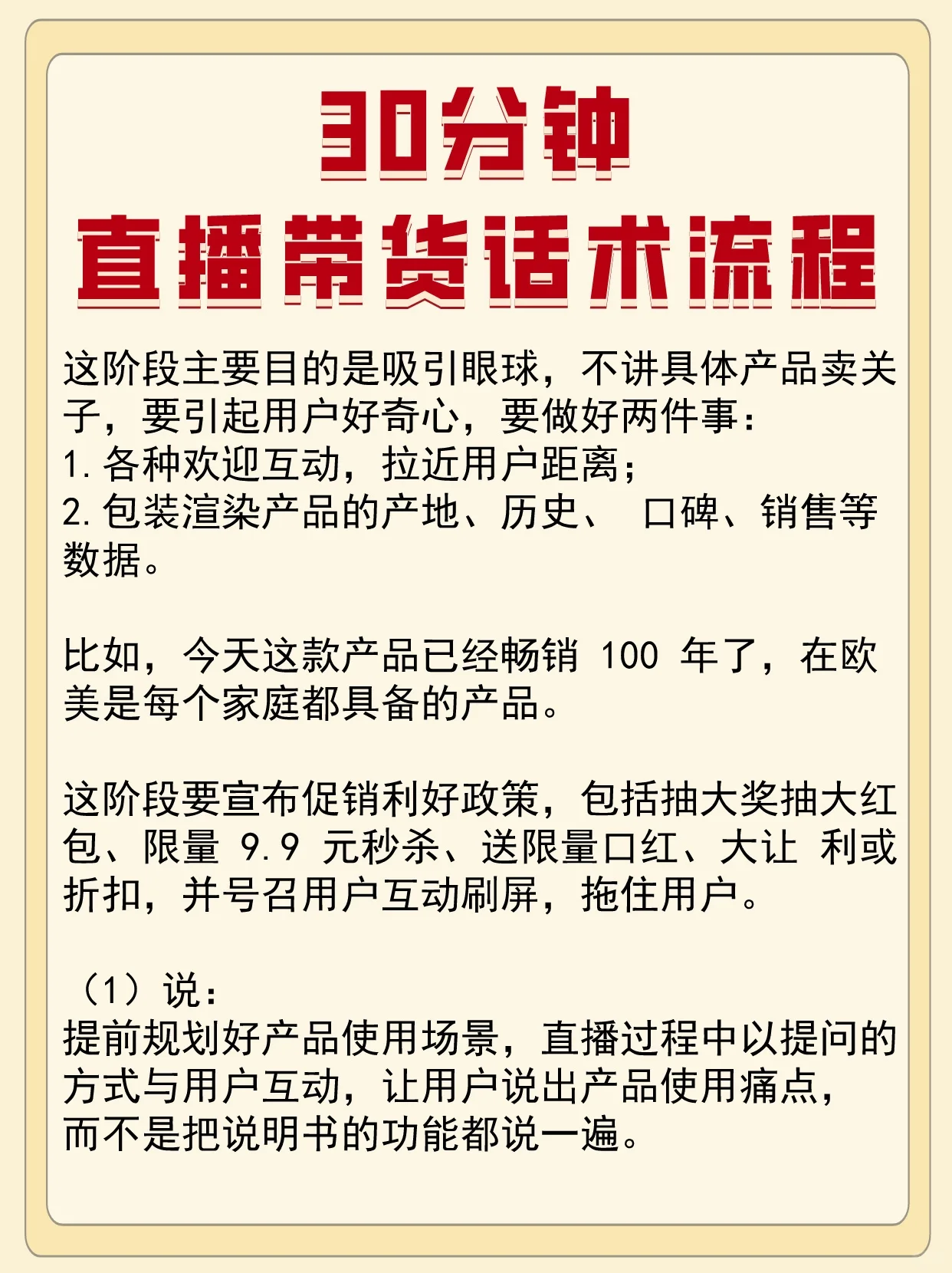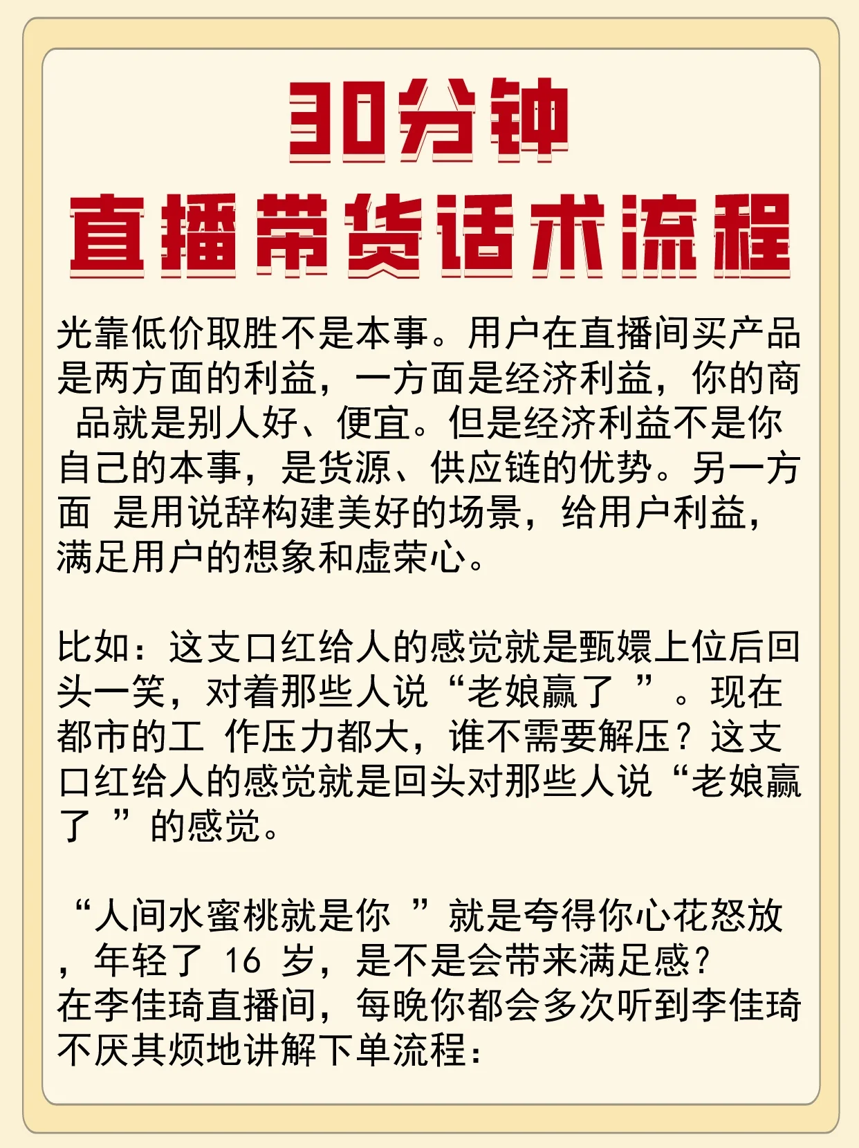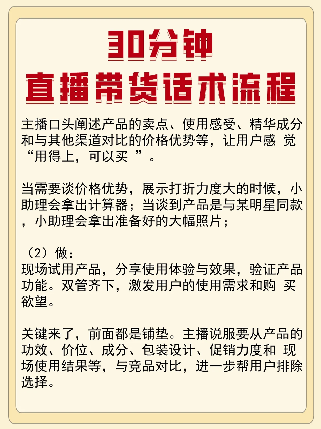 这个阶段的主要目的是吸引眼球,更不用说具体的产品卖点了。为了激发用户的好奇心,需要做好两件事: 1.各种欢迎互动,拉近用户之间的距离; 2.包装渲染产品的来源、历史、声誉、销售等数据。 例如,今天这种产品已经畅销了100年,是欧洲和美国每个家庭都有的产品。 现阶段,有必要宣布优惠的促销政策,包括赢得大奖和红包、限量版9.9元快闪、赠送限量版唇膏、大折扣或折扣,以及呼吁用户互动和刷屏,将其拖下来。 (1) 说: 提前规划产品使用场景,在直播过程中通过提问与用户互动,让用户指出产品使用的痛点,而不是解释手册中的所有功能。 主播口头解释了产品的卖点、使用感受、精华成分以及与其他渠道相比的价格优势,让用户感到“有货可买”。 当谈到讨论价格优势和展示大折扣时,助理会拿出一个计算器;当涉及到与某位名人型号相同的产品时,助理会拿出准备好的大照片; (2) 执行: 产品的现场试用,分享用户体验和效果,验证产品功能。采用双重方式刺激用户需求和购买欲望。 关键在这里,前面都是打基础。主播说服用户根据他们的功效、价格、成分、包装设计、促销力度和现场使用结果将他们的产品与竞争对手进行比较,以进一步消除他们的选择。 1.为了满足用户的胃口,这个时候正式公布价格,让用户觉得“物有所值”。 2.再次强调促销政策,包括限时折扣、前XX下单等价礼品、现金退款、随机免费下单、抽奖等促销活动,达到用户热情的高潮,促使用户集体下单。 例如,如果现在直播间有5000人,我们今天会给前600名的等价礼物。倒计时到5、5(请助理配合,还有200单)、4(请助理合作,还有100单)、3(请助理协作,没有了) 这就是抢购和狂欢的氛围。在直播间卖货需要购物氛围,未来直播销售将以娱乐为导向,不同于购物。直播销售应该让用户感到欣喜若狂,增加他们的荷尔蒙,并创造可预测的惊喜。