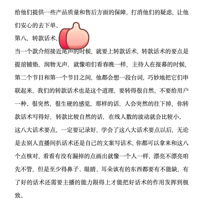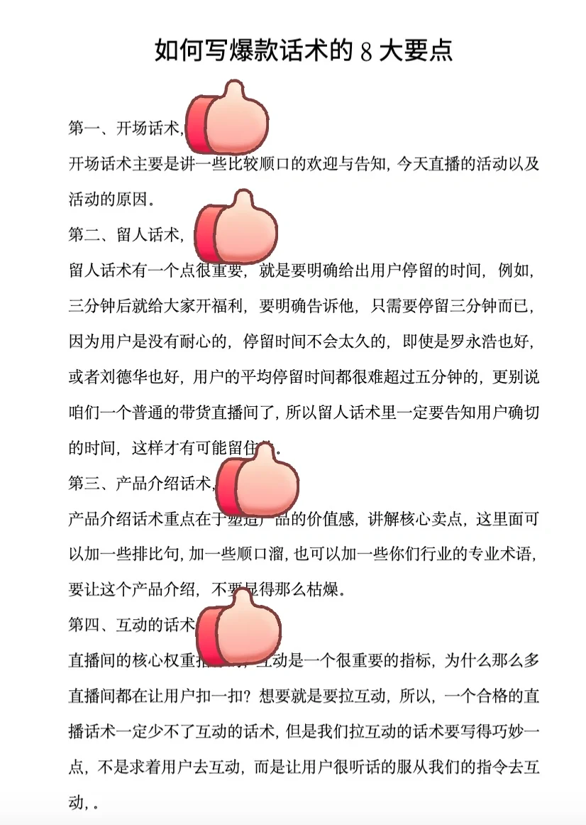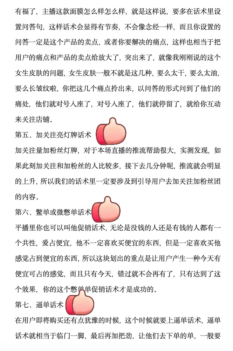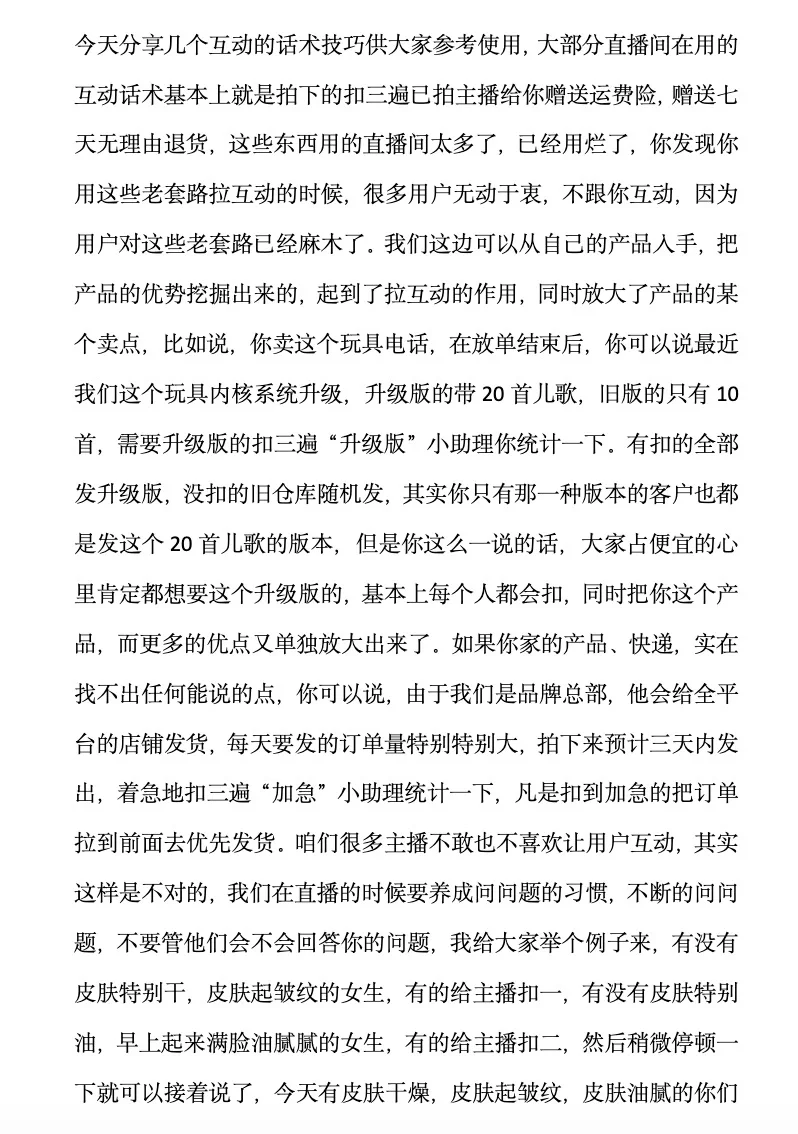 1.开场指导: 开幕词应包括愉快的欢迎词以及关于当天直播活动和原因的信息,以确保保留观众的兴趣。 2. 吸引人的站点: 在保留语中,明确告知用户他们的停留时间,例如,三分钟后会有好处,这样用户就可以理解只需要三分钟就可以避免失去耐心。 3. 产品亮点: 在产品介绍中,重点展示产品价值,突出核心卖点,运用排比、押韵等方法,使介绍更加生动有趣。 4. 巧妙的互动: 当涉及到互动时,避免无聊的日常生活,并引导用户以非强制性的方式遵循说明。分享一些巧妙的互动技巧,确保它们能引起用户的兴趣。 5. 引导注意事项: 在直播过程中引导用户关注和加入粉丝群对流媒体非常有帮助。确保脚本中包含指导用户执行这些操作的内容。 6. 推广指导: 在使用促销语言时,让用户感觉到今天有独家折扣,强调只有今天才有这个折扣,并为用户创造心理优势。 7. 订单强制技巧:当用户犹豫是否购买时,使用订单强制语言强调产品质量和售后服务,解决用户疑虑,让用户安心下单。 8. 过渡到最后: 当我们接近尾声时,巧妙地使用迁移语言提前做好准备,使过渡自然,避免让用户感到突兀。这有助于减少在线用户数量的波动。 无论是学习他人的语言还是创建自己的副本,它都可以用于验证,以确保不会遗漏任何关键元素。最重要的是,优秀的语言技能需要与主播的能力相辅相成。只有将两者结合起来,才能充分利用语言技能。