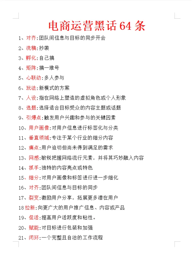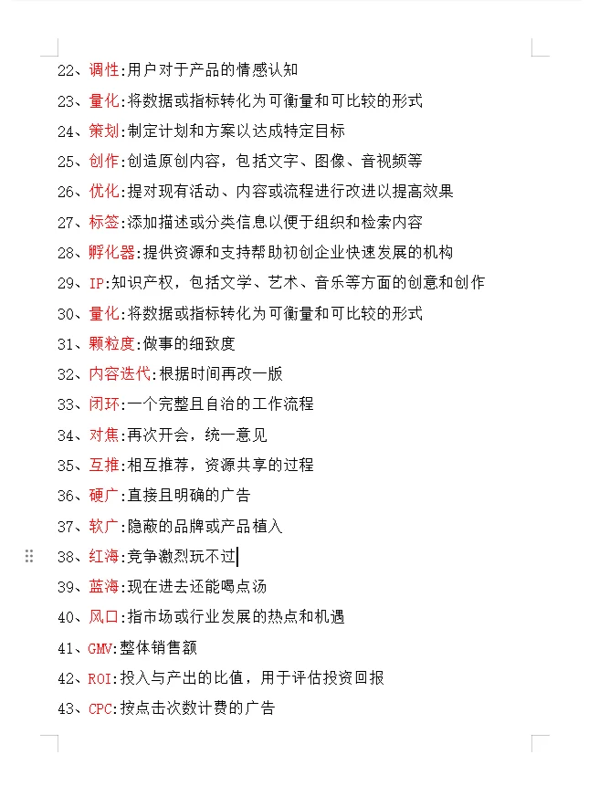 1.一致性:开会以同步团队之间的信息和目标 2.滚动:抄袭 3.孵化:自营 4.矩阵:创建一堆数字 5.心连心协作:多个参与者 6.游戏玩法:新模式解决方案 7.个性:指在互联网上塑造的虚拟人物或个人形象 8.选题:选择适合目标受众的内容主题或话题 9.触发点:触发用户兴趣和参与的关键因素 10.用户档案:标记和分类用户信息 11.垂直领域:专注于某一行业的细分内容 12、痛点:用户需求迫切但未得到满足 13.网络敏感性:敏锐地把握网络流行元素,并将其巧妙地融入内容 14.抓取:独特的内容亮点或功能 15.细分:进一步完善用户档案和标签 16.一致性:团队之间的信息和目标同步 17.裂变:激励用户分享并扩大更多潜在用户 18招聘:向更广泛的受众推广信息、内容或产品 19.提高用户参与度和粘性。 20.赋权:包装和加强目标 28.孵化器:提供资源和支持,帮助初创企业快速发展的机构 29.知识产权:知识产权,包括文学、艺术、音乐和其他领域的创意和创作 30.量化:将数据或指标转化为可衡量和可比的形式 31.精细:做事的精细 32.内容迭代:根据时间修改版本 33.闭环:一个完整和自主的工作流程 34.重点:再次召开会议,统一意见 35.相互推荐:相互推荐和资源共享的过程 36.硬广告:直接清晰的广告 37.软广告:隐性品牌或产品植入 38.红海:激烈的竞争无法进行 39.蓝海:你现在还可以在里面喝汤 40.风向:指市场或行业发展的热点和机遇 41.GMV:总销售收入 42.投资回报率:投入与产出的比率,用于评估投资回报 43.CPC:按点击量计费的广告 44.CPS:根据实际销售收入计费的广告 45.KOL:主要意见领袖 46.KOC:积极宣传自己的老用户 47.B2C:企业对消费者是指企业直接向消费者销售产品或服务。 48.B2B:企业对企业,指企业之间的交易和合作 49.PGC:由专业团队创建的内容 50.UGC:用户创建和共享的内容