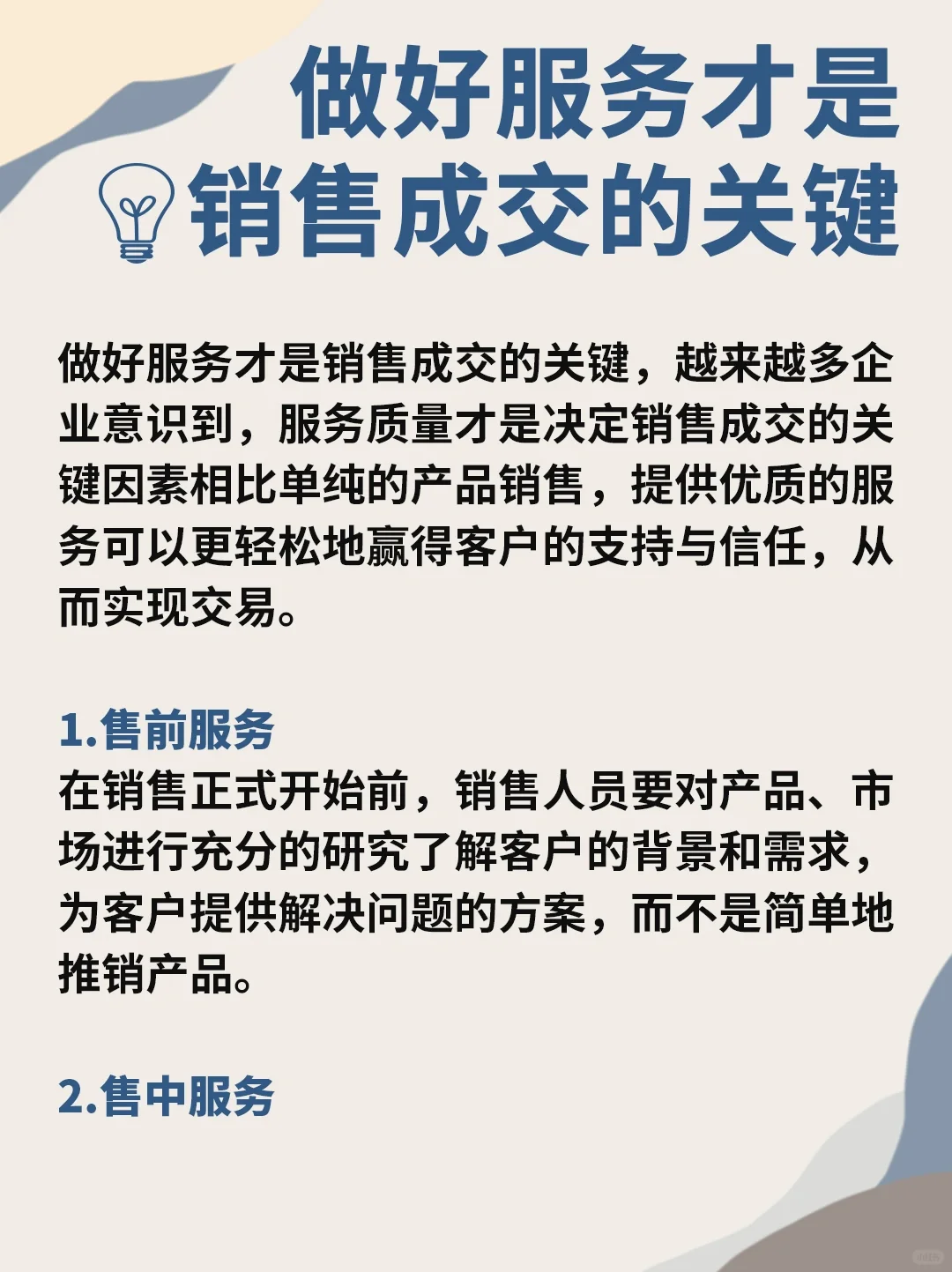 良好的服务是销售和交易的关键,越来越多的企业意识到服务质量是决定销售和交易成败的关键因素。 与简单的产品销售相比,提供高质量的服务更容易赢得客户的支持和信任,从而实现交易。 1.售前服务 在正式开始销售之前,销售人员应该对产品和市场进行彻底的研究,以了解客户的背景和需求,并为他们的问题提供解决方案,而不是简单地宣传产品。 [右R]2。在售服务 在销售过程中,重要的是倾听客户的意见,引导他们,与他们建立良好的关系,让他们感觉到作为合作伙伴而不是被动买家的尊重。 [拳击R]3。售后服务 交易完成后,要主动提供安装、培训、维护等各种售后服务,解决客户在使用过程中可能遇到的任何问题,确保客户获得良好的产品体验。 [举手R]4。综合服务 实现售前、售中、售后服务的无缝集成,让客户在整个购买周期中感受到服务的连续性 [拥抱R]5。有针对性的服务 不同的客户有不同的需求,有必要研究他们的个性并制定有针对性的服务计划。精准的个性化服务可以更好地满足客户的需求。 6.主动式服务 积极主动地关心客户的反馈,等待客户发言后再提供服务。习惯于主动服务的企业更有可能获得客户的信任。良好的服务是销售和交易的关键 [掌声R]7。准时服务 我们必须按时履行对客户的服务承诺,不能夸大。不履行我们的承诺可能会导致客户失去信心。 【葡萄R】提供专业周到的服务,让客户有回头的欲望。服务是销售中最强大的软实力,企业应优先考虑服务,坚持以客户需求为导向,才能在市场中占据优势。