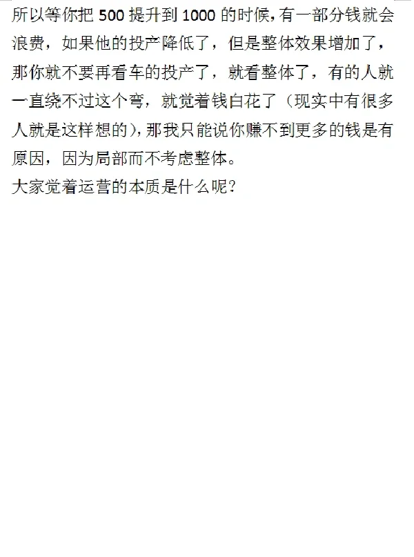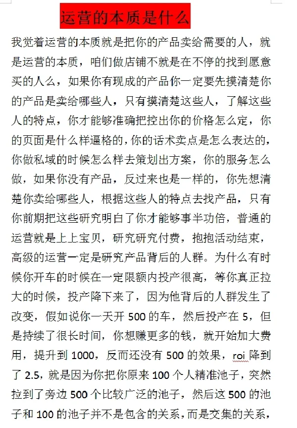 运营的本质是什么 我认为运营的本质是把你的产品卖给有需要的人,这就是运营的本质。当我们经营一家商店时,我们会不断地找到愿意购买的人。如果你有现成的产品,你必须首先了解你的产品卖给了谁。只有了解这些人和他们的特点,你才能准确地控制你如何定价,你的页面是什么样的,你的语言和卖点是如何表达的,你在做私域时如何规划你的计划,以及你如何提供服务。如果你没有产品,反之亦然。你首先想一想你卖给了谁,并根据他们的特点找出他们,你就可以找出你卖给了哪些人。产品,只有在早期了解这些研究,才能达到事半功倍的效果。普通的操作就像高档的珍宝,研究付费,拥抱活动结束。高水平的操作必须是研究产品背后的受众。为什么有时你在驾驶时会在一定的限度内获得高产量,而当你真的提高产量时,产量就会下降因为它背后的观众已经改变了。如果你每天开500辆车,然后在5点开始生产,但这种情况持续很长一段时间,而且你想赚更多的钱,你开始将成本提高到1000辆,但还没有达到500辆的效果。投资回报率降低到2.5,因为你突然把原来的100人精密人才库拉到了旁边的500个相对较宽的人才库,而这500个人才库和100个人才库并不是一种包容性的关系,而是一种交叉关系。因此,当你增加500到1000时,有一部分钱会被浪费掉。如果产量减少了,但总体效果增加了,那么你就不需要再看汽车的产量了。你只需要看看全局。有些人就是无法绕过这条曲线,觉得钱被浪费了(事实上,很多人是这么认为的)。所以,我只能说,你赚不到更多的钱是有原因的,因为你没有考虑全局,而不是具体方面。