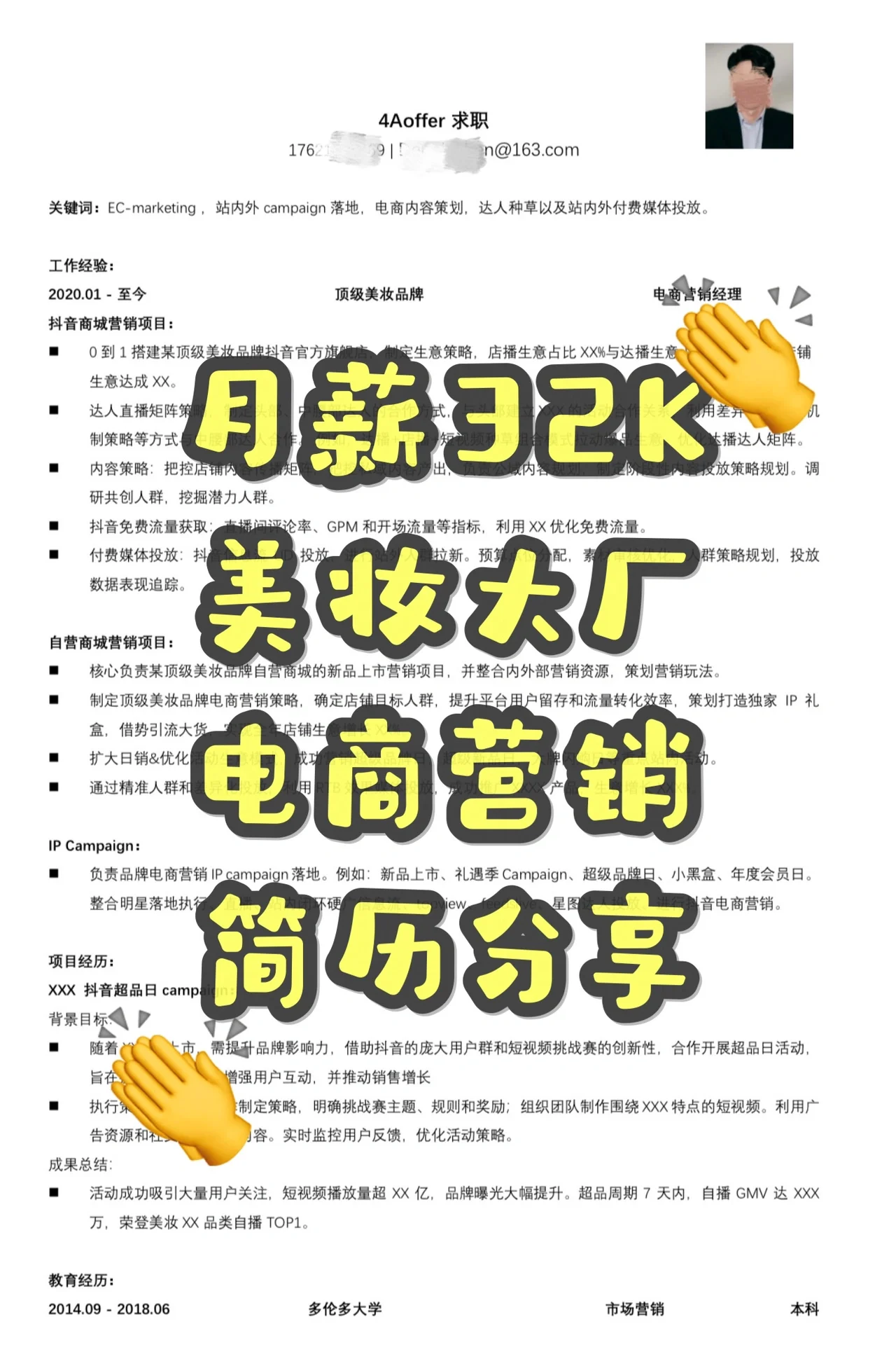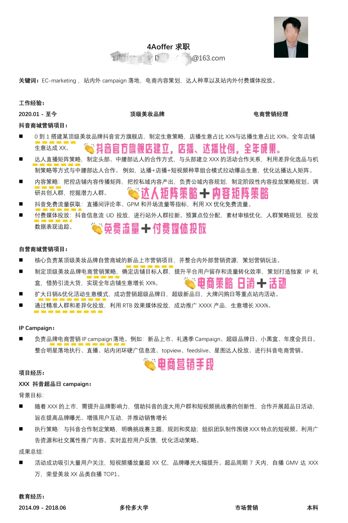 做4A offer的好朋友,提高简历通过率,优化要求 - ? 4 offer分享:如何写一份跳槽薪水翻倍的电商营销简历 对电子商务营销感兴趣的姐妹‼️ - 简历背景:长期服务于顶级美容品牌,电子商务营销经理。 - 电商营销的内容分为三个模块:DY商城营销项目、自营商城营销项目和IP战役。 抖音商城营销项目: 从0到1,抖音官方旗舰店将建成。 DY官方开店,门店直播 实现广播率和年度业绩。 为有影响力的人制定直播矩阵战略,并为顶级和中级有影响力的人士制定合作方法。 大Bo商店广播在短视频中种草。 内容战略。 内容传播矩阵战略。 免费获取流量。 直播间评论率➕ GPM➕ 开放交通。 【四卢比】付费媒体植入。 信息流➕ 车站外的新兵 自营商城营销项目: 自营商场新品首发营销项目, 整合内外部营销资源➕ 制定营销策略。 电子商务营销策略、留存与转化, 打造专属IP礼盒➕ 利用这种情况吸引大批货物。 拓展日常销售,优化活动商业模式, 超级品牌日、超级新品日、大品牌抢购日等重点现场活动成功营销。 通过精准定位和差异化广告, 利用RTB效果媒体进行广告宣传。 IP运动: 负责品牌电商营销IP活动的实施。例如:新品发布会、礼品季活动、超级品牌日、小黑盒、年度会员日。集明星落地执行、直播、站内闭环硬播信息流、topview、feedslip、星图达人投放、抖音电商营销于一体。 电子商务营销方法。 - 提示: 简历的关键词:电子商务营销、现场和场外活动落地、电子商务内容规划、影响者营销以及现场和场外的付费媒体广告。
