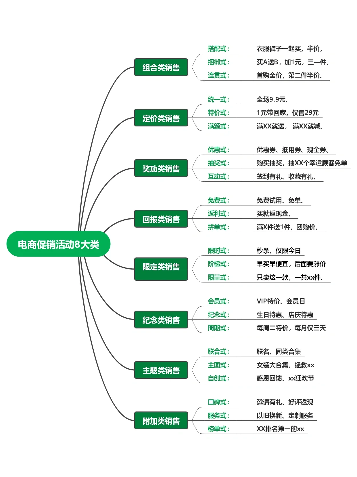1.组合销售 匹配样式: 衣服和裤子一起半价买, 捆绑: 买A送B,外加1元钱,三个一件 连贯的 第一次购买全价,第二次购买半价 2.定价销售 统一: 整个场地9.9元 特别优惠: 带回家1元,只需29元 全额: XX满时免费,XX满时减少 3.有奖销售 折扣 优惠券、代金券、现金代金券 彩票格式: 购买彩票,免费抽取XX名幸运客户 互动的 礼貌登录,礼貌领取 4.退货销售 自由的 免费试用,免费订购 回扣类型: 购买后退还现金 拼音: 获得1个免费的X项目,团购价 5.限制销售 时间限制: 快闪销售,仅限于今天 举步: 早买早便宜,以后价格会上涨 限量版: 只卖这一款,共xx件 6.纪念销售 会员风格: VIP特惠、会员日 纪念: 生日特辑、店庆特辑 周期性 每周二特价,每月仅三天 7.主题销售 组合: 联名和类似系列 主要模式: 女装系列,节省xx 自行创建: 感恩回馈,xx嘉年华 8.追加销售额 口头传述的: 邀请礼物和现金返还的正面反馈 以服务为导向: 服务贸易和定制 列表格式: XX在XX排名第一