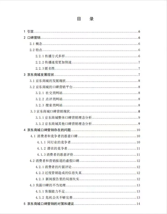 题目:电子商务——口碑营销策略优化研究——以京东为例 目录 1简介6 2口碑营销6 2.1概念6 2.2特点6 2.2.1多样化的传播方式6 2.2.2传播速度更快7 2.2.3匿名7 3、京东的发展现状7 3.1京东的发展现状8 3.2 JD。com的口碑营销平台8 3.2.1社交网站8 3.2.2评论网站8 3.2.3搜索网站8 3.3京东商城口碑营销现状8 3.3.1京东商城整体口碑营销理念分析9 3.3.2京东其他口碑营销概念分析9 4.京东商城口碑营销存在的问题10 4.1消费者和竞争对手的恶意口碑10 4.1.1同行业竞争对手10 4.1.2潜在竞争对手11 4.1.3恶意消费者评论11 4.2消费者和营销报告中的虚假口碑12 4.2.1消费者的单方面评论12 4.2.2过度营销造成的信息失真12 4.2.3新闻报道中的部分不准确12 4.3负面口碑处理不当13 4.3.1客户服务能力不足13 4.3.2危机公关不足13 5、京东口碑营销策略与建议14 5.1建立信誉平台14 5.1.1改进技术方面14 5.1.2优化评价体系14 5.1.3建立严格的奖惩机制15 5.2改进选择标准15 5.2.1优化供应链质量15 5.2.2提高产品质量和服务15 5.2.3增加产品种类和数量16 5.3增加口碑传播的渠道和方式16 5.3.1加强口碑传播管理16 5.3.2引导消费者发布口碑信息16 5.3.3提高应急能力16 6结论16 参考文献18 谢谢20