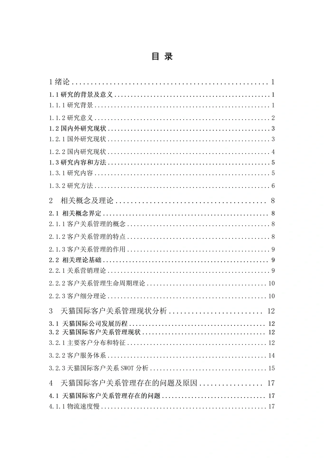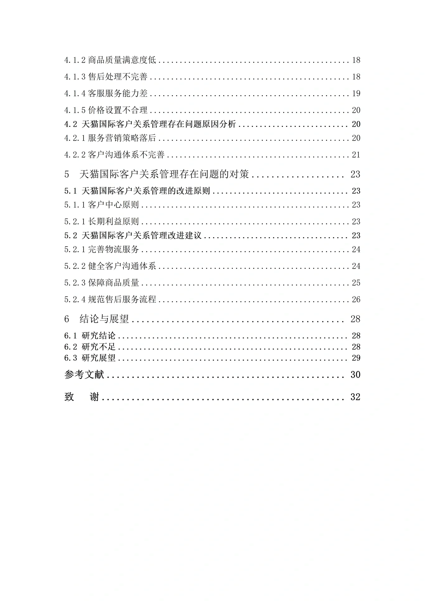 目录 1简介1 1.1研究的背景和意义1 1.1.1研究背景1 1.1.2研究意义2 1.2国内外研究现状3 1.2.1国外研究现状3 1.2.2国内研究现状4 1.3研究内容和方法5 1.3.1研究内容5 1.3.2研究方法6 2相关概念和理论8 2.1相关概念的定义8 2.1.1客户关系管理理念8 2.1.2客户关系管理的特点8 2.1.3客户关系管理的作用9 2.2相关理论基础9 2.2.1关系营销理论9 2.2.2客户关系管理生命周期理论10 2.2.3客户细分理论10 天猫国际12号客户关系管理现状分析 3.1天猫国际公司发展历程12 3.2天猫国际客户关系管理现状12 3.2.1主要客户分布及特点12 3.2.2客户服务体系14 3.2.3天猫国际客户关系SWOT分析15 4.天猫国际客户关系管理存在的问题及原因17 4.1天猫国际客户关系管理存在的问题17 4.1.1物流速度慢17 4.1.2产品质量满意度低18 4.1.3售后处理不完善18 4.1.4客户服务能力差19 4.1.5定价不合理20 4.2天猫国际客户关系管理出现问题的原因分析20 4.2.1服务营销战略滞后20 4.2.2客户沟通系统不完善21 5.天猫国际客户关系管理存在问题的对策23 5.1天猫国际客户关系管理改进原则23 5.1.1以客户为中心的原则23 5.2.1长期效益原则23 5.2天猫国际客户关系管理改进建议23 5.2.1改善物流服务24 5.2.2建立健全的客户沟通体系24 5.2.3确保产品质量25 5.2.4规范售后服务流程26 6结论与展望28 6.1研究结论28 6.2研究不足28 6.3研究展望29 参考文献30 谢谢32