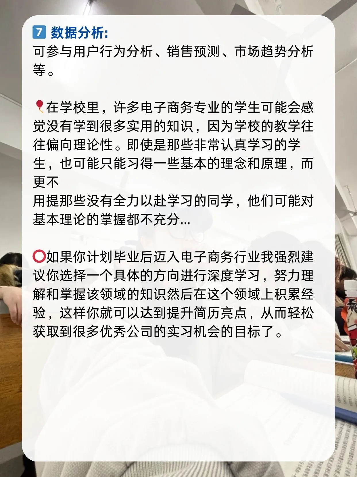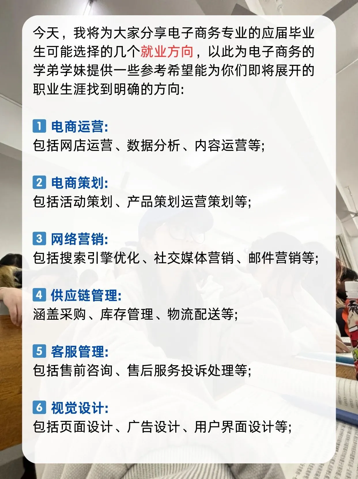 在电子商务专业找工作没有方向吗这就足够读这本了 ! 随着毕业季的临近,许多电子商务专业的年轻学生最近一直在向我寻求职业发展方向。 他们对未来的职业感到非常焦虑,不知道应该选择什么职业来实现个人发展。 许多学生担心自己在学校里似乎没有掌握任何实质性的技能,甚至在求职时也感到担忧,不敢轻易提交简历 今天,我将与大家分享电子商务专业应届毕业生可能选择的几个就业方向,以便为电子商务专业的年轻学生提供一些参考。我希望为你即将到来的职业生涯找到一个明确的方向: 电子商务运营: 包括网店运营、数据分析、内容运营等; 电子商务规划: 包括活动策划、产品策划、运营策划等; 在线营销: 包括搜索引擎优化、社交媒体营销、电子邮件营销等; 供应链管理: 涵盖采购、库存管理、物流配送等; 客户服务管理: 包括售前咨询、售后服务投诉处理等; 视觉设计: 包括页面设计、广告设计、用户界面设计等; 数据分析: 可以参与用户行为分析、销售预测、市场趋势分析等。 ? 在学校里,许多电子商务专业的学生可能会觉得他们没有学到很多实用知识,因为学校的教学往往倾向于理论方面。即使是认真学习的学生,也只能掌握一些基本的概念和原则,更不用说了 那些没有尽力学习的人可能对基本理论掌握不够 如果你打算在毕业后进入电子商务行业,我强烈建议你选择一个特定的方向进行深度学习,努力了解和掌握该领域的知识,并积累该领域的经验。这样,你就可以达到提高简历亮点的目的,并轻松获得优秀公司的许多实习机会。 对于那些不确定选择哪个方向或如何选择学习机构的学生,我在电子商务领域有着丰富的经验,并评估了许多不同机构的优势、劣势和目标受众。