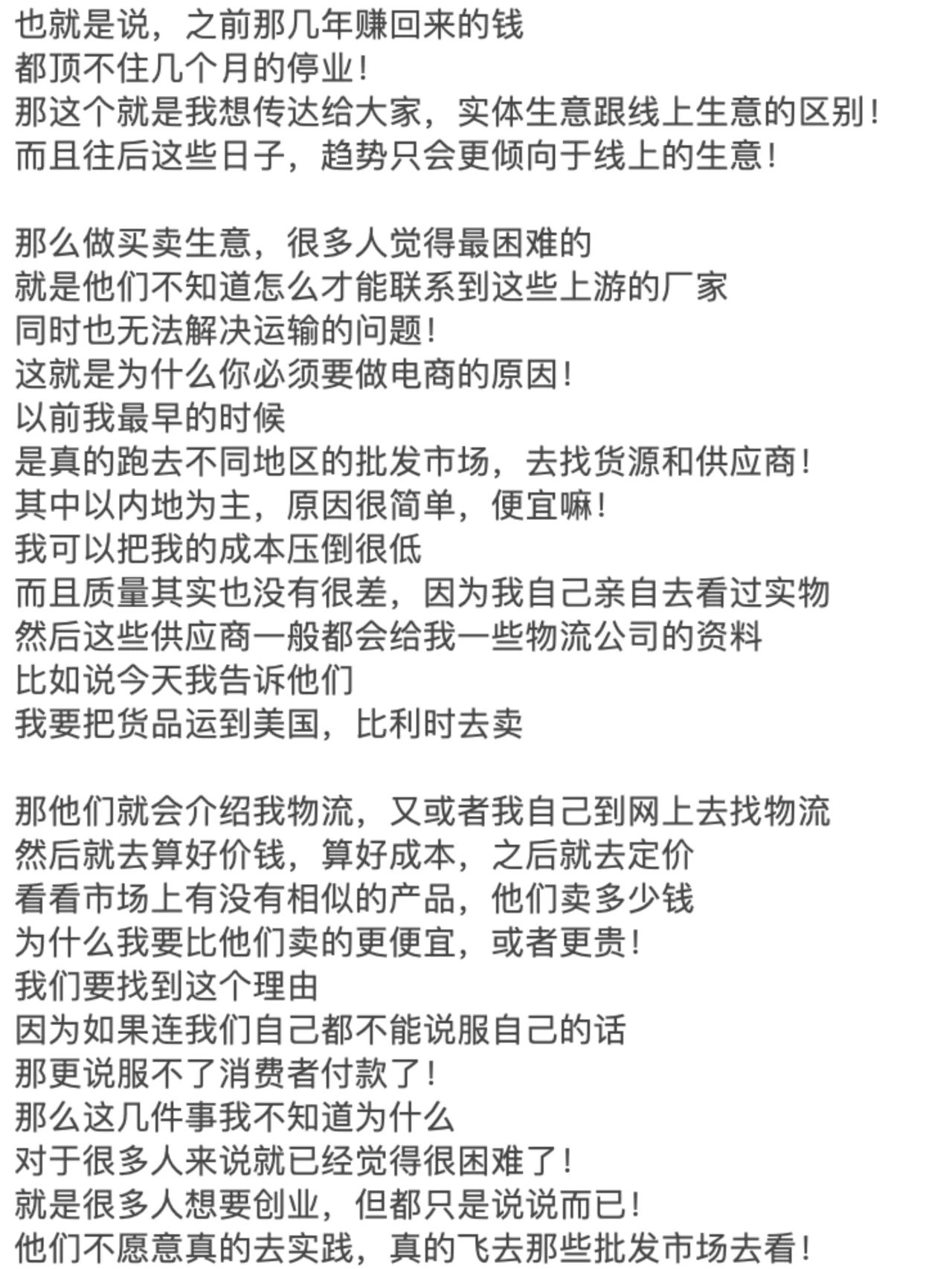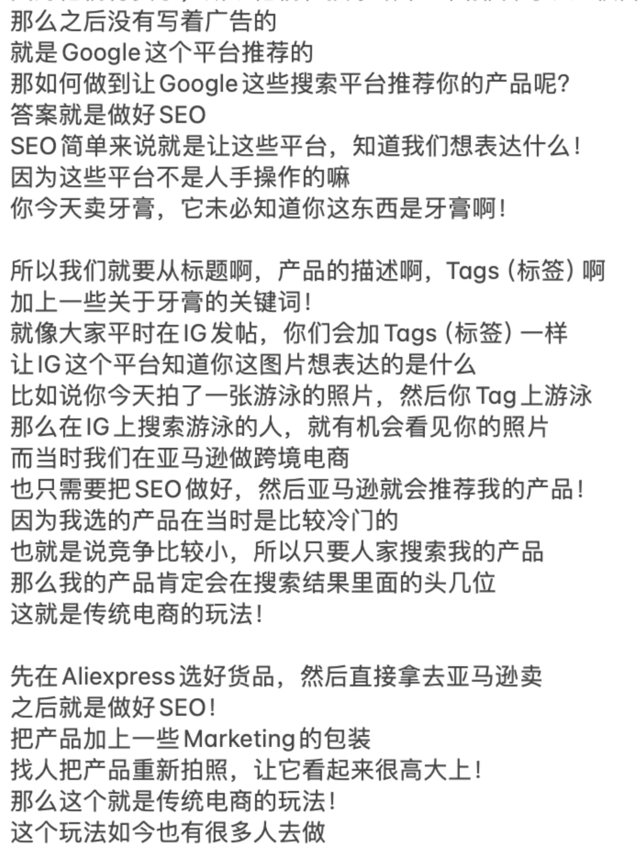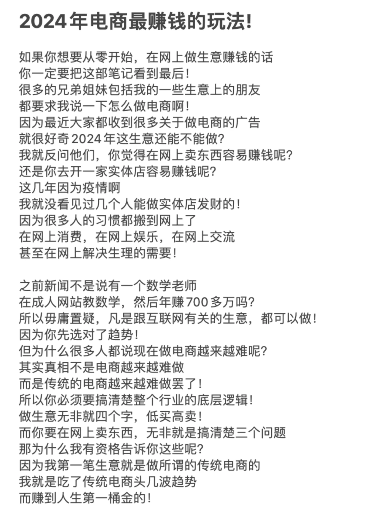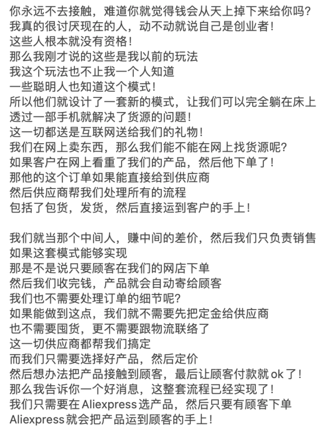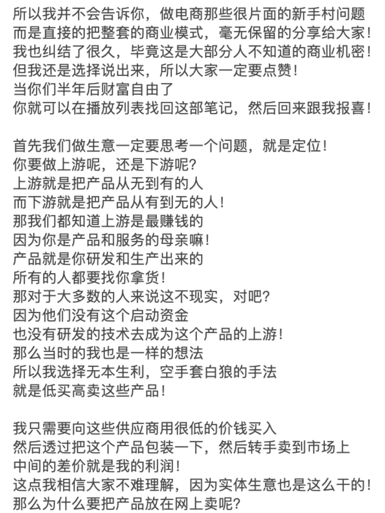 ? 如果你想从头开始,通过在线做生意赚钱 你一定要看到这张纸条的末尾! 许多兄弟姐妹,包括我的一些商业朋友 每个人都让我解释一下如何做电子商务! 因为最近每个人都收到了很多关于做电子商务的广告 我很好奇2024年这项业务还能做吗 - ? 我反过来问他们,你认为在网上卖东西容易赚钱吗 你开实体店更容易赚钱吗 近年来,由于疫情 我还没见过谁能通过经营实体店发大财! 因为很多人的习惯已经转移到了网上 在线消费、在线娱乐和在线交流 甚至在线解决生理需求! - ? 之前的新闻没有说有数学老师 在成人网站上教数学,年收入超过700万元 因此,毫无疑问,任何与互联网相关的业务都可以做! 因为你首先选择了正确的趋势! 但为什么很多人说现在做电子商务越来越难了 事实并不是电子商务变得越来越难做 但这只是传统的电子商务越来越难做了! 所以你必须了解整个行业的基本逻辑! - ? 做生意无非是四个字:低买高卖! 如果你想在网上销售东西,只需要解决三个问题 那么,为什么我有资格告诉你这些事情呢 因为我的第一笔生意是做所谓的传统电子商务 我刚刚了解了传统电子商务的前几大趋势 还有那些制造人生第一桶金的人! - ? 所以我不会告诉你电子商务中片面的新手村问题 但直接与大家毫无保留地分享整个商业模式! 我也挣扎了很久,毕竟这是一个大多数人都不知道的商业秘密! 但我还是选择大声说话,所以每个人都必须竖起大拇指! 当你的财富在六个月后变得免费时 你可以在播放列表中检索到这张纸条,然后回来祝贺我! - ? 首先,在做生意的时候,我们必须思考一个问题,那就是定位! 你想往上游走还是往下游走 上游是从头开始构建产品的人 下游是那些从有产品到没有产品的人! 所以我们都知道上游是最赚钱的 因为你是产品和服务之母! 产品是你开发和生产的 每个人都在找你来提货! - ? 这对大多数人来说是不现实的,对吧 因为他们没有启动资金 没有任何技术开发成为该产品的上游! 所以当时我也有同样的想法 所以我选择了无利可图的手法,用空手套白狼 这是关于这些产品的低买高卖! - ? 我只需要以很低的价格从这些供应商那里购买 然后通过包装该产品并转售给市场 中间的差价就是我的利润! 我相信每个人都能理解这一点,因为实体业务也是这样做的! 那么,为什么要在网上销售产品呢 当时我看到了一个商机 外国人对产品的成本没有概念!
