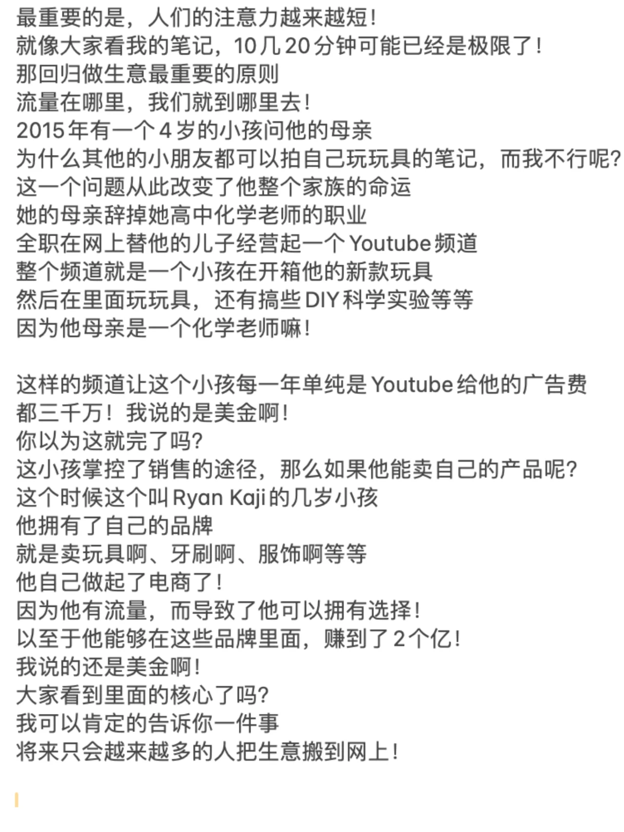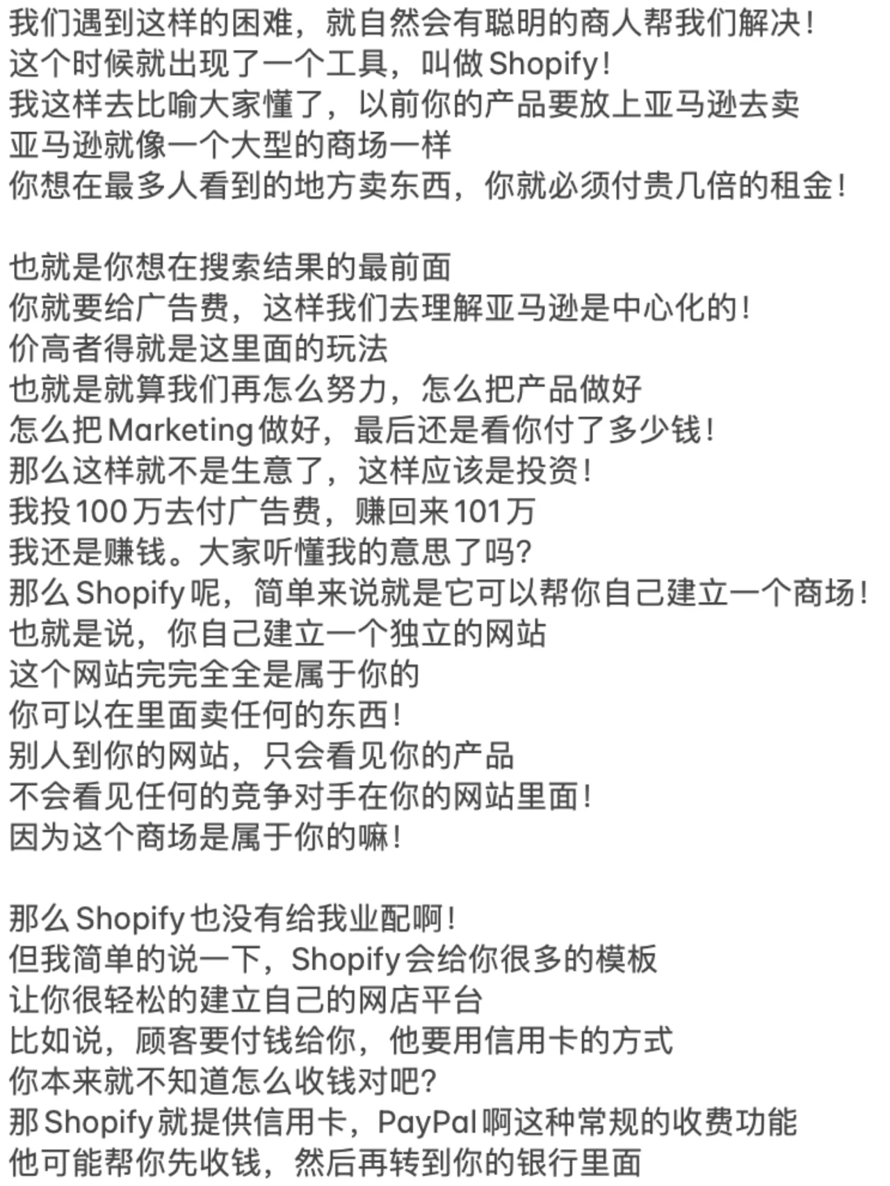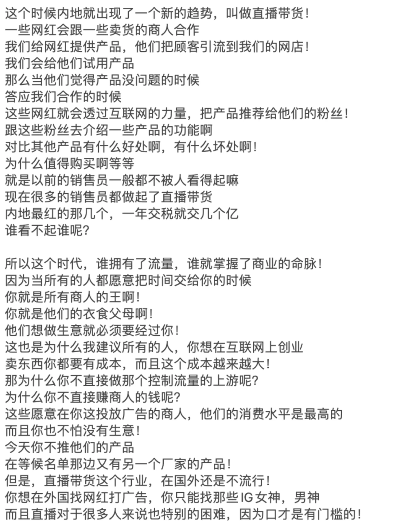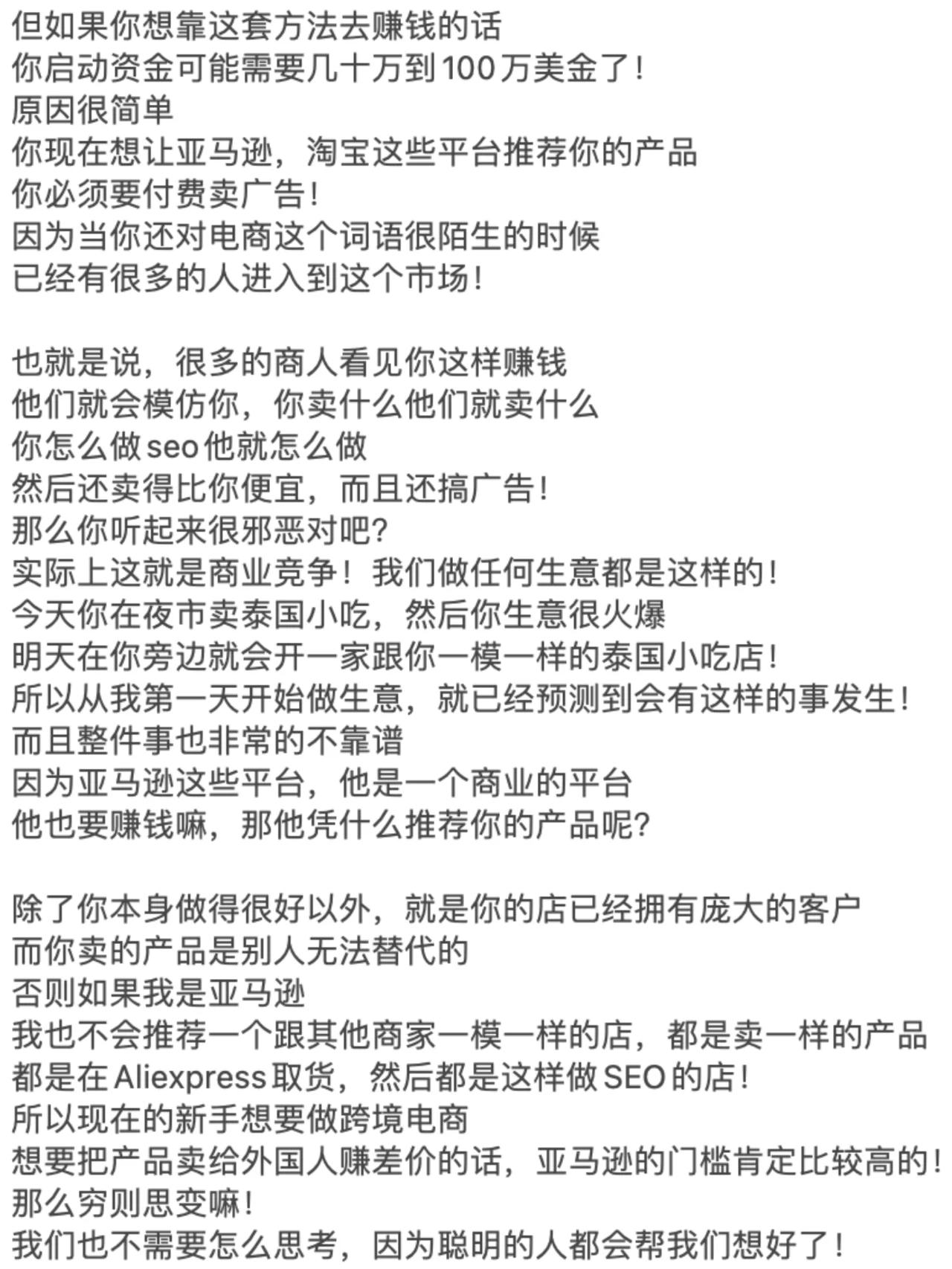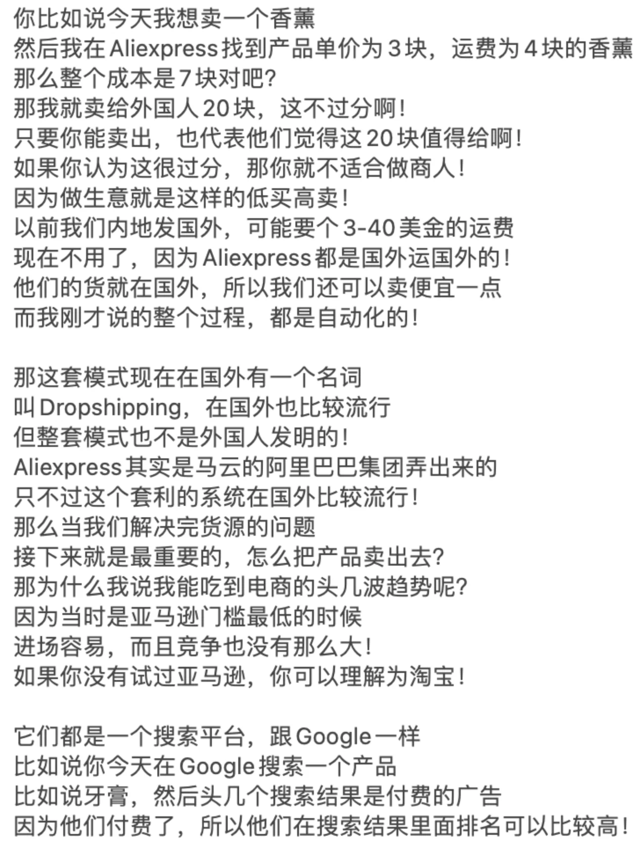 ? 如果你想从头开始,通过在线做生意赚钱 你一定要看到这张纸条的末尾! 许多兄弟姐妹,包括我的一些商业朋友 每个人都让我解释一下如何做电子商务! 因为最近每个人都收到了很多关于做电子商务的广告 我很好奇2024年这项业务还能做吗 - ? 我反过来问他们,你认为在网上卖东西容易赚钱吗 你开实体店更容易赚钱吗 近年来,由于疫情 我还没见过谁能通过经营实体店发大财! 因为很多人的习惯已经转移到了网上 在线消费、在线娱乐和在线交流 甚至在线解决生理需求! - ? 之前的新闻没有说有数学老师 在成人网站上教数学,年收入超过700万元 因此,毫无疑问,任何与互联网相关的业务都可以做! 因为你首先选择了正确的趋势! 但为什么很多人说现在做电子商务越来越难了 事实并不是电子商务变得越来越难做 但这只是传统的电子商务越来越难做了! 所以你必须了解整个行业的基本逻辑! - ? 做生意无非是四个字:低买高卖! 如果你想在网上销售东西,只需要解决三个问题 那么,为什么我有资格告诉你这些事情呢 因为我的第一笔生意是做所谓的传统电子商务 我刚刚了解了传统电子商务的前几大趋势 还有那些制造人生第一桶金的人! - ? 所以我不会告诉你电子商务中片面的新手村问题 但直接与大家毫无保留地分享整个商业模式! 我也挣扎了很久,毕竟这是一个大多数人都不知道的商业秘密! 但我还是选择大声说话,所以每个人都必须竖起大拇指! 当你的财富在六个月后变得免费时 你可以在播放列表中检索到这张纸条,然后回来祝贺我! - ? 首先,在做生意的时候,我们必须思考一个问题,那就是定位! 你想往上游走还是往下游走 上游是从头开始构建产品的人 下游是那些从有产品到没有产品的人! 所以我们都知道上游是最赚钱的 因为你是产品和服务之母! 产品是你开发和生产的 每个人都在找你来提货! - ? 这对大多数人来说是不现实的,对吧 因为他们没有启动资金 没有任何技术开发成为该产品的上游! 所以当时我也有同样的想法 所以我选择了无利可图的手法,用空手套白狼 这是关于这些产品的低买高卖! - ? 我只需要以很低的价格从这些供应商那里购买 然后通过包装该产品并转售给市场 中间的差价就是我的利润! 我相信每个人都能理解这一点,因为实体业务也是这样做的! 那么,为什么要在网上销售产品呢 当时我看到了一个商机 外国人对产品的成本没有概念!