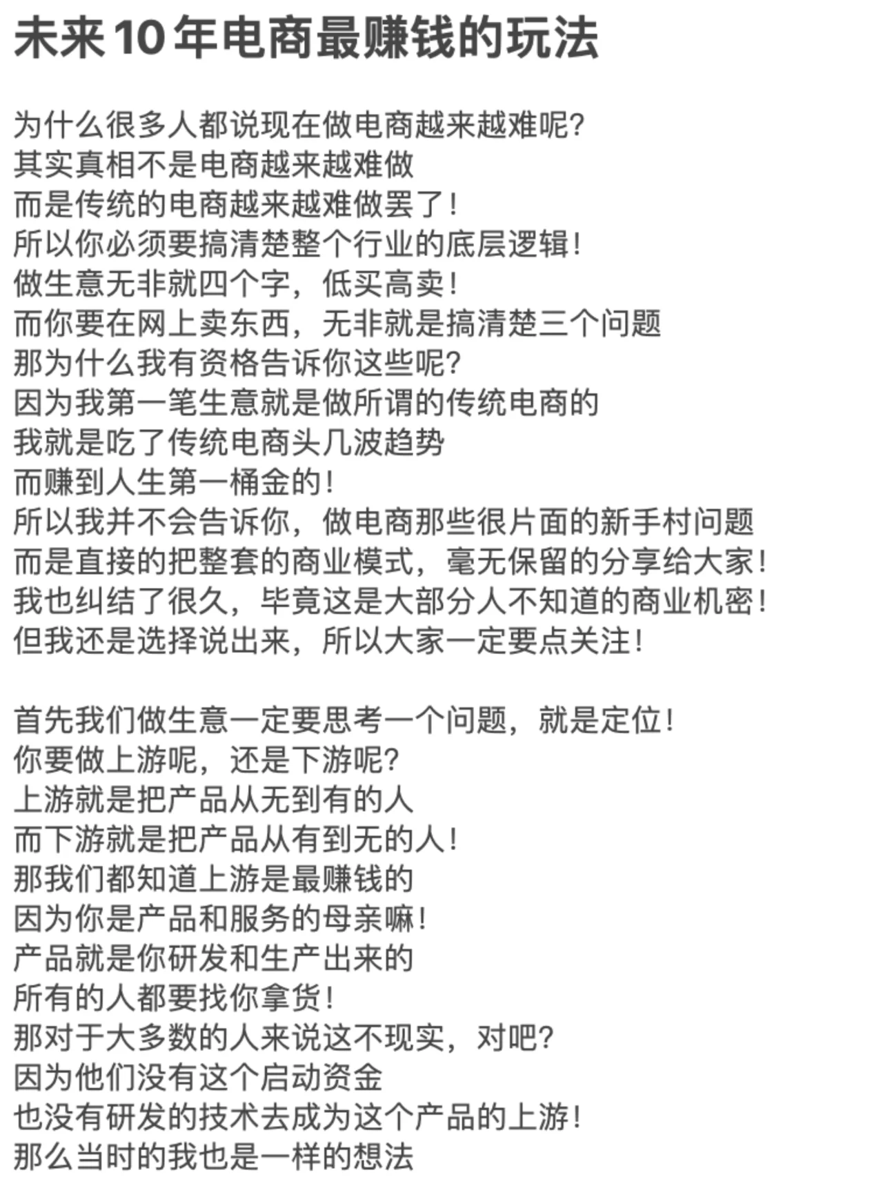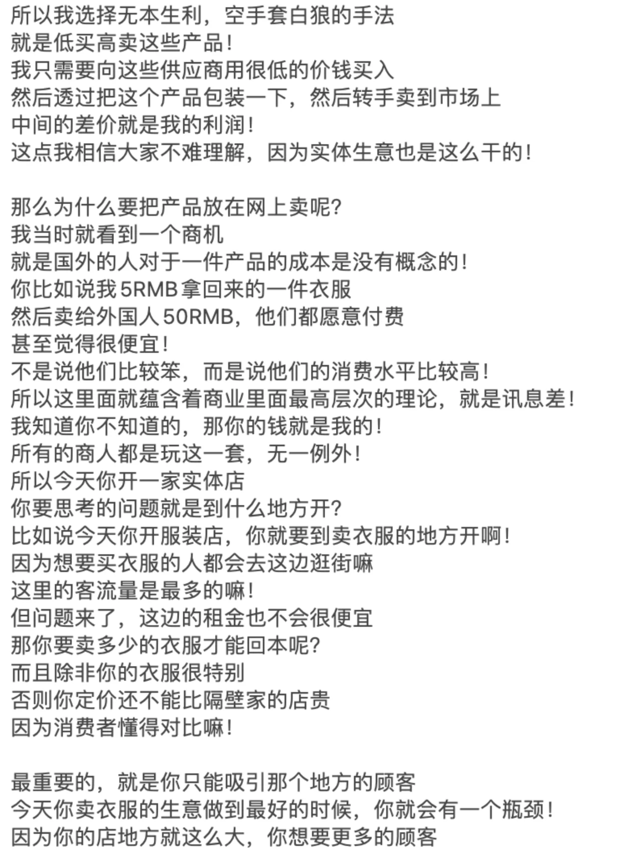 ? 为什么很多人说现在做电子商务越来越难了 事实并不是电子商务变得越来越难做 但这只是传统的电子商务越来越难做了! 所以你必须了解整个行业的基本逻辑! 做生意无非是四个字:低买高卖! 如果你想在网上销售东西,只需要解决三个问题 - ? 那么,为什么我有资格告诉你这些事情呢 因为我的第一笔生意是做所谓的传统电子商务 我刚刚了解了传统电子商务的前几大趋势 还有那些制造人生第一桶金的人! 所以我不会告诉你电子商务中片面的新手村问题 但直接与大家毫无保留地分享整个商业模式! 我也挣扎了很久,毕竟这是一个大多数人都不知道的商业秘密! 但是我还是选择大声说出来,所以大家一定要注意! - ? 首先,在做生意的时候,我们必须思考一个问题,那就是定位! 你想往上游走还是往下游走 上游是从头开始构建产品的人 下游是那些从有产品到没有产品的人! 所以我们都知道上游是最赚钱的 因为你是产品和服务之母! 产品是你开发和生产的 - ? 每个人都在找你来提货! 这对大多数人来说是不现实的,对吧 因为他们没有启动资金 没有任何技术开发成为该产品的上游! 所以当时我也有同样的想法 所以我选择了无利可图的手法,用空手套白狼 - ? 这是关于这些产品的低买高卖! 我只需要以很低的价格从这些供应商那里购买 然后通过包装该产品并转售给市场 中间的差价就是我的利润! 我相信每个人都能理解这一点,因为实体业务也是这样做的! - ? 那么,为什么要在网上销售产品呢 当时我看到了一个商机 外国人对产品的成本没有概念! 例如,我花5元带回的一件衣服 然后以50元人民币卖给外国人,他们愿意付钱 我甚至觉得它很便宜! - ? 并不是说他们笨,而是他们的消费水平比较高! 所以这包含了商业中最高层次的理论,那就是信息不对称! 我知道你不知道的,那你的钱就是我的了! 所有商家都玩这个游戏,无一例外! 所以今天你开了一家实体店 你需要思考的问题是在哪里开车 - ? 例如,如果你今天开了一家服装店,你必须去卖衣服的地方! 因为想买衣服的人会在这里购物 这里的客流量最高吗! 但问题是,这里的租金也不会很便宜 你需要卖多少衣服才能盈利 除非你的衣服很特别 否则,你的价格不能高于隔壁的商店 - ? 因为消费者知道如何比较! 最重要的是,你只能从那个地方吸引顾客 当你的服装生意今天做得最好的时候,你就会遇到瓶颈! 因为你的店太大了,你想要更多的顾客 你只能开一家分店或找一个更大的地方!