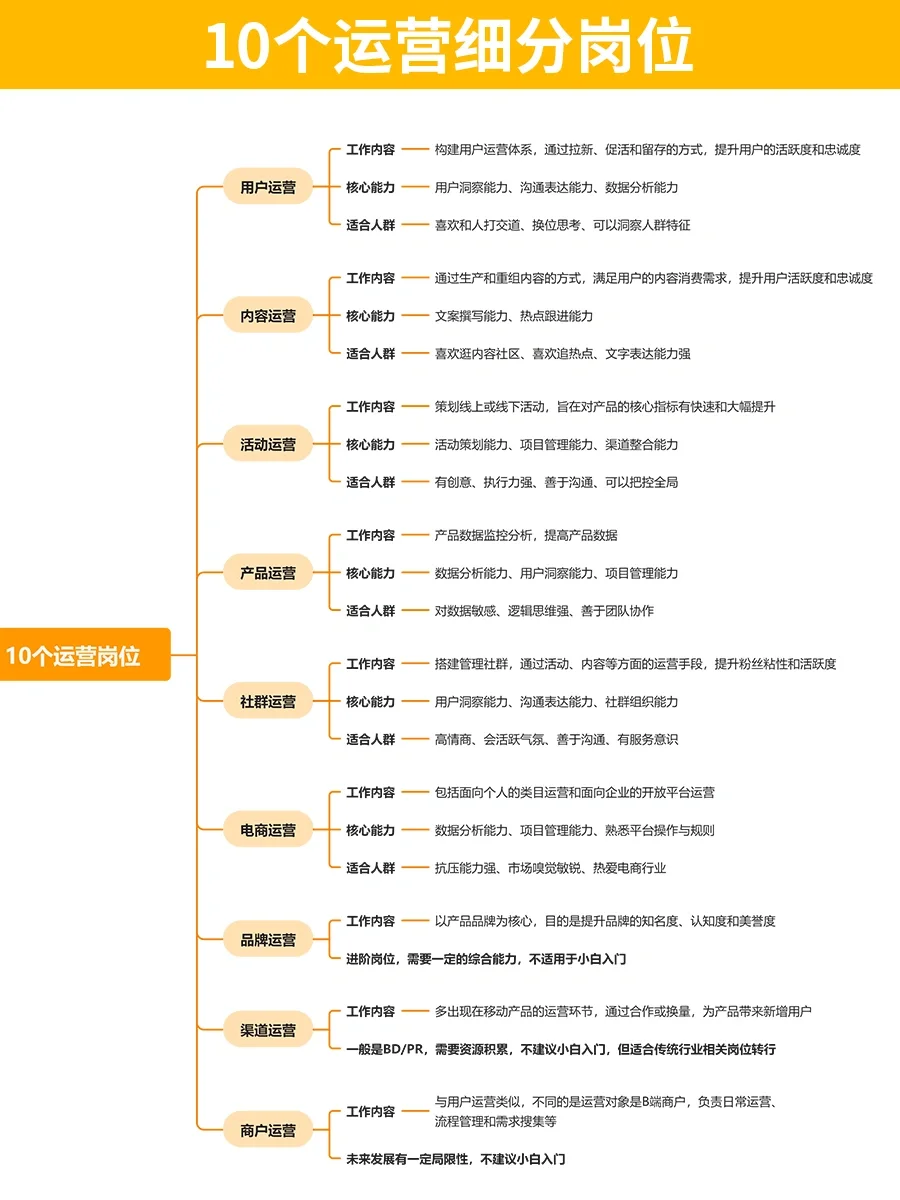 ? 下面,我将为您提供每个职位的工作职责、核心能力和合适受众的详细描述 什么 用户操作 工作职责:通过招聘、晋升和保留方法提高用户参与度和忠诚度 核心能力:用户洞察力、沟通和表达能力、数据分析能力 适合的受众:喜欢与人互动,与他人感同身受,能够洞察群体的特点 介绍难度: 内容操作 工作职责:通过制作和重组内容,满足用户的内容消费需求,提高用户活跃度和忠诚度 核心能力:文案能力、热点跟进能力 适合的受众:喜欢浏览内容社区,喜欢关注热点话题,文字表达能力强 介绍难度: 事件操作 工作职责:规划旨在快速显著提高产品核心指标的活动 核心竞争力:活动策划能力、项目管理能力、渠道整合能力 适合的受众:有创造力、执行力强、善于沟通、能掌控全局 介绍难度: 产品运营 工作职责:产品数据监测和分析,改进产品数据 核心能力:数据分析能力、用户洞察能力、项目管理能力 适合的受众:对数据敏感,逻辑思维强,善于团队合作 介绍难度: 新媒体运营 工作职责:以运营小红书等新媒体平台为主体,以品牌推广或吸引新客户为目标 核心能力:热点跟进能力、渠道整合能力、文本表达能力 适合的受众:精通互联网,乐于接受新事物 介绍难度: 社区运营 工作职责:建立管理社区,使用运营方法提高粉丝粘性和活跃度 核心能力:用户洞察力、沟通和表达能力以及社区组织能力 适合:高情商、活跃的氛围、良好的沟通能力和服务意识 介绍难度: 电子商务运营 岗位职责:包括个人分类运营、企业开放平台运营 适合人群:抗压能力强,市场意识强,热爱电子商务行业 介绍难度: 品牌运营 工作职责:专注于产品品牌,旨在提高品牌知名度、知名度和声誉 渠道运营 工作职责:经常出现在移动产品的运营中,通过合作或批量交换为产品带来新用户 商户运营 岗位职责:与用户运营类似,只是目标受众是B端商家,负责日常运营、流程管理、需求收集