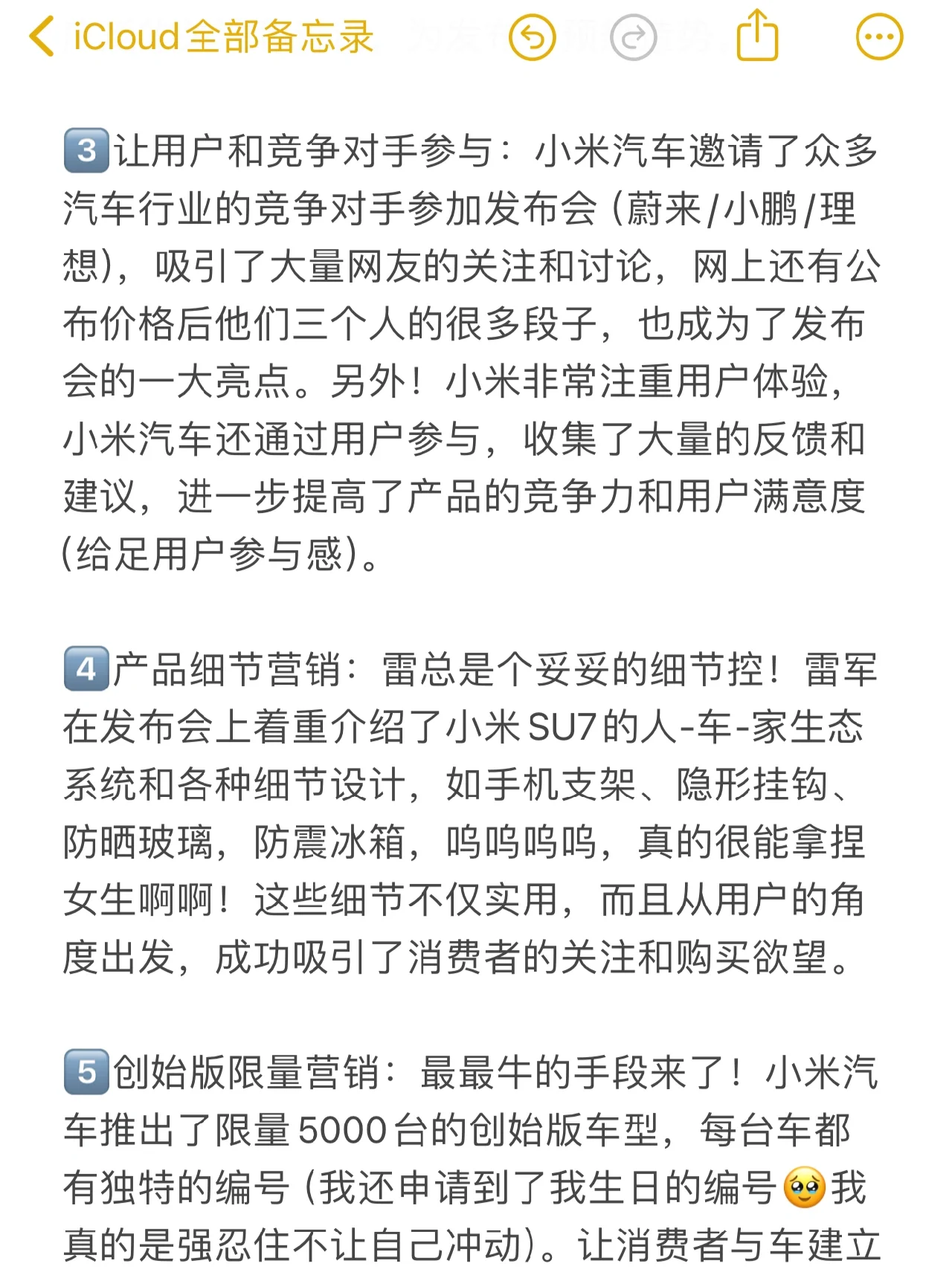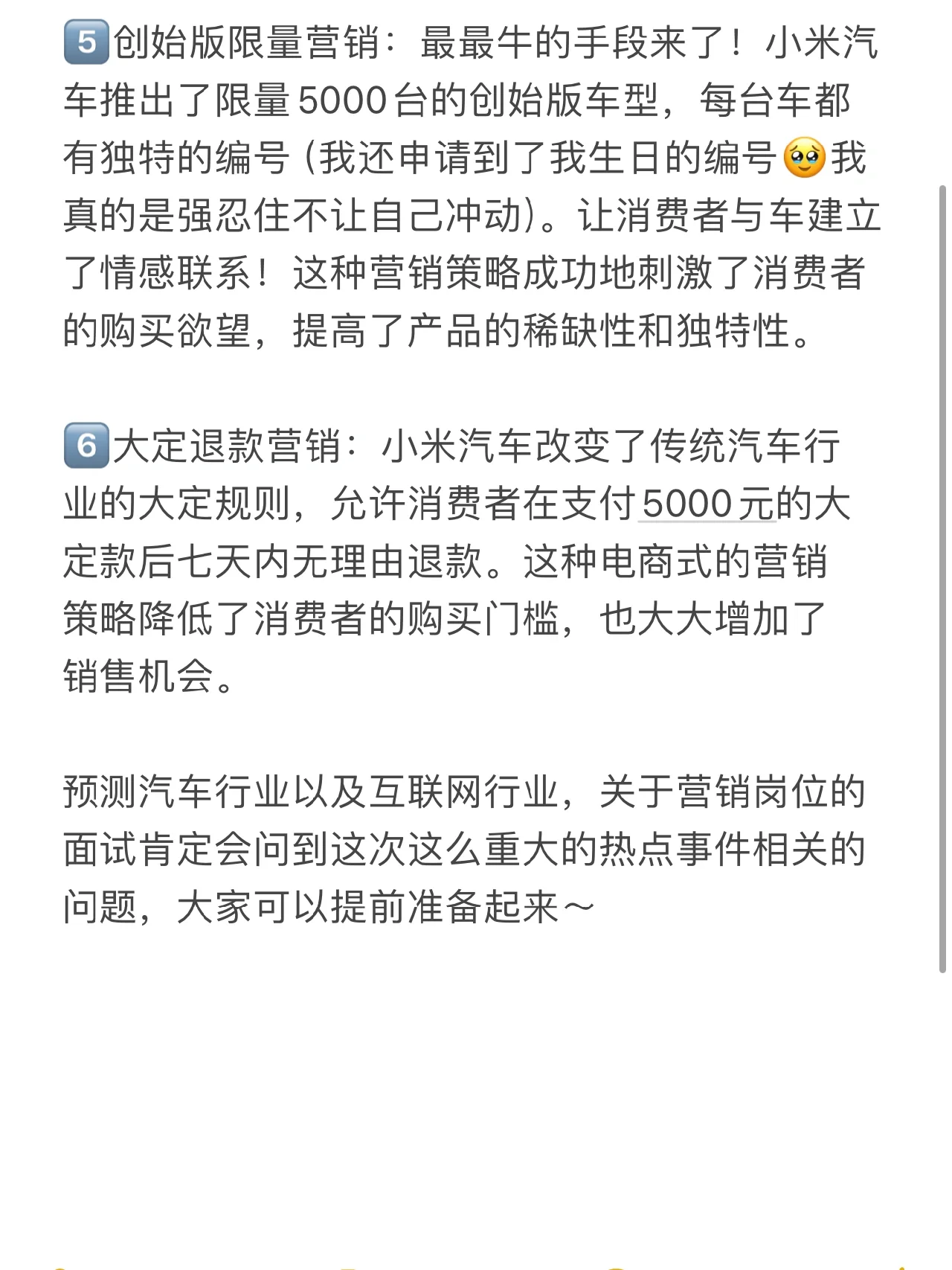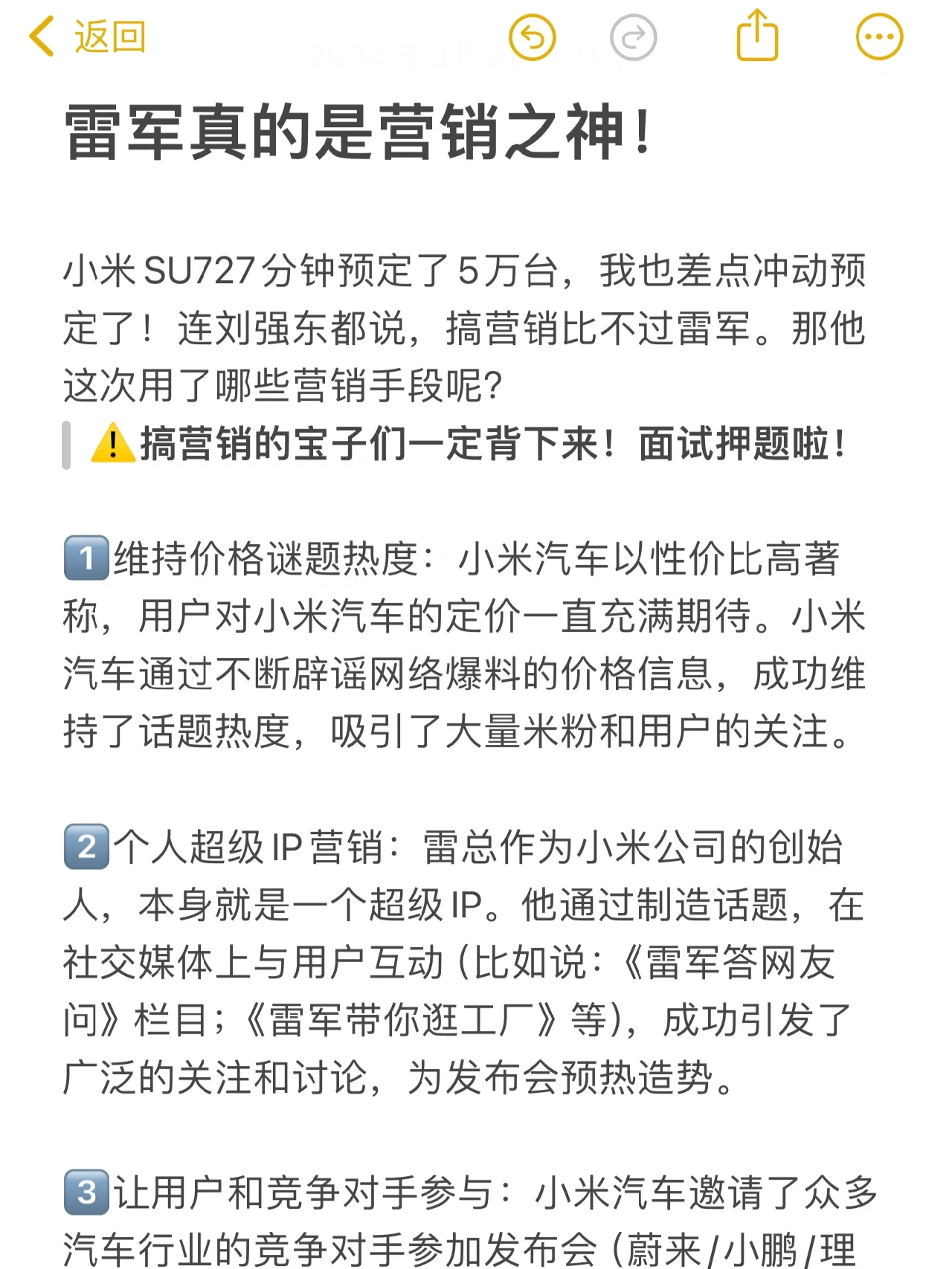雷军真是营销之神!小米SU727在短短7分钟内预订了5万台,我几乎是冲动地预订了!就连刘强东都说营销不如雷军,这次他用了什么营销策略 营销专家一定要记住!面试延期了! 一️⃣ 保持价格拼图的热度:小米以高性价比著称,用户一直期待小米的定价。小米汽车通过不断驳斥网络上披露的价格信息,成功保持了话题热度,吸引了大批米粉和用户的关注。 二️⃣ 个人超级IP营销:作为小米的创始人,雷本人就是一个超级IP。他通过在社交媒体上创造话题和与用户互动(如“雷军答网友问”专栏和“雷军带你去工厂”等),成功引发了广泛的关注和讨论,为发布会预热。 三️⃣ 允许用户和竞争对手参与:小米汽车邀请了众多汽车行业的竞争对手参加发布会(NIO/小鹏/理想),吸引了大量网友的关注和讨论。网上公布价格后,也有很多关于他们三人的笑话,成为发布会的一大亮点。而且小米非常重视用户体验,小米汽车也通过用户参与收集了大量的反馈和建议,进一步提高了产品的竞争力和用户满意度(给用户参与感)。 四️⃣ 产品细节营销:雷始终是一个可靠的细节控制者!雷军在发布会上重点介绍了小米SU7的人车家庭生态系统以及各种细节设计,如手机支架、隐形挂钩、防晒玻璃、减震冰箱等等!这些细节不仅实用,而且站在用户的角度,成功吸引了消费者的注意力和购买欲望。 五️⃣ 方正限量版营销:最神奇的方法来了!小米汽车推出了5000台的限量版车型,每台都有一个唯一的号码(我甚至申请了我的生日号码我真的忍不住了)。在消费者和汽车之间建立情感联系!这种营销策略成功地激发了消费者的购买欲望,提高了产品的稀缺性和独特性。 六️⃣ 大鼎退款营销:小米汽车改变了汽车行业大鼎的传统规则,允许消费者在支付5000元的大额订单后七天内无理由退款。这种电子商务式的营销策略降低了消费者的购买门槛,大大增加了销售机会。 据预测,在汽车行业和互联网行业,营销职位的面试肯定会对这样一个重大的热点事件提出疑问。