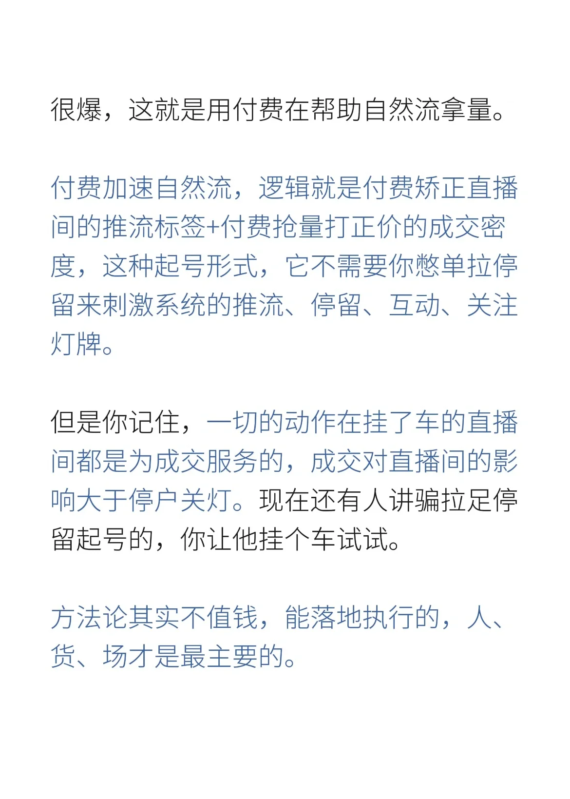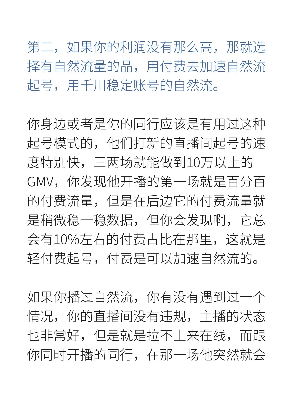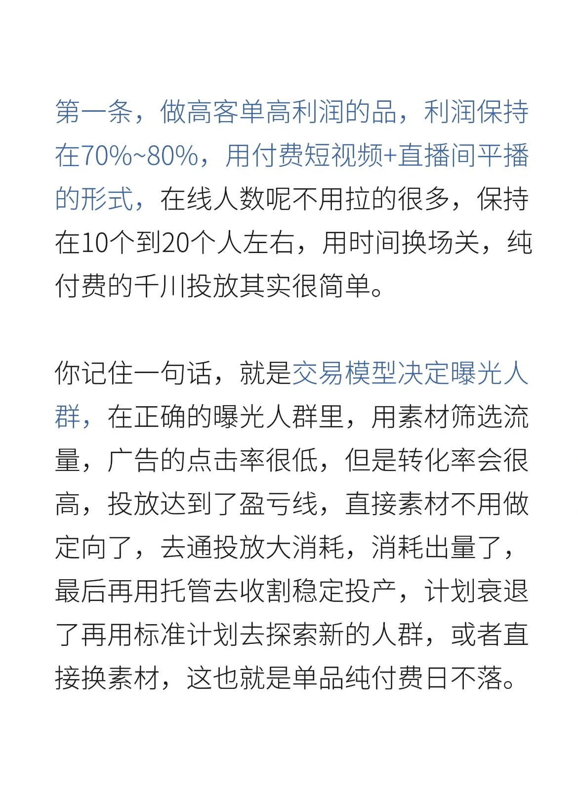 《鸿华广告经营札记》 2024年直播销售只有两种方式 第一点是生产高客户订单、高利润的产品,利润率在70%到80%之间,使用付费短视频和直播间直播的形式 没有必要将在线用户数量增加约10至20人,而且切换级别需要时间。纯粹的付费钱川广告其实很简单。记住一件事,交易模式决定了曝光受众。在正确的曝光受众中,用素材过滤流量,广告的点击率很低,但转化率会很高。当广告达到盈亏线时,就没有必要直接针对素材了。相反,去铜头增加消费,消耗数量,最后使用托管来收割和稳定生产。当计划被拒绝时,使用标准计划来探索新的受众,或者直接交换材料。这也被称为单一产品的纯支付,日不落。 其次,如果你的利润率没有那么高,那么选择具有自然流量的产品,并使用支付来加速自然流量的起点。使用钱川的稳定账户自然流量,你或你的同行之前应该使用过这个起点模型。他们以非常快的速度开设了新的直播间,可以在三到两个时段内实现超过100000的GMV。你会发现,他们开播的第一期是100%的付费流量,但最终,他们的付费流量略有稳定。但是,你会发现,那里总是会有10%左右的付费流量比例,这是轻付费的起点。支付可以加速自然流动。如果你玩过自然流媒体,Flow,你有没有遇到过这样的情况:你的直播间没有违反任何规则,主持人的状态也很好,但无法上线。和你同时开播的那位同事,在那一幕里突然火了起来。这是通过支付来帮助自然流量增加流量,并通过支付来加速自然流量。其逻辑是付费更正直播间的流媒体标签+付费抢量并为交易密度设定正价格,这是一种启动形式,不需要你退缩和拉动来刺激系统的推送流、暂停、互动和对灯光的关注, 但请记住,挂车的直播间里的所有动作都是为了交易服务,交易对直播间的影响要大于停车时关灯。有些人仍然在谈论欺骗某人在停车时停车。你让他们把车挂了。试试看,说实话,今年非法交易纯支付的破产率是78.32。 方法论实际上不值钱。最重要的是货场,它是能够有效实施它的人。
