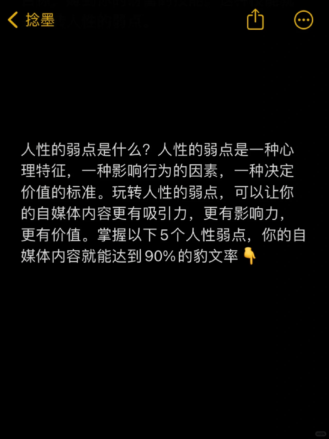 为什么有些人的自媒体能流行起来 但是,有些人的自我媒体会被忽视吗 他们的秘密是利用人性的弱点 : 人性的弱点是一种心理特征,是影响行为的因素,是决定价值的标准。 利用人类的弱点可以使你的自媒体内容更具吸引力、影响力和价值。你可以看看以下五个个人弱点的例子: 懒惰心态:人们都想节省时间和精力,花最少的时间,享受最好的结果。例如 ? 3元做酒店级牛排 ? 我花5块钱买的这个东西可以做很多美味的东西 ? 吃一顿10元的早餐给我一种100元的感觉 好奇心:人们都想探索未知,满足自己的好奇心,看到别人看不到的东西。例如 ? 这座城市实际上蕴藏着一个地下王国 ? 这个岛上的人都是这样生活的,你敢去吗 ? 你听说过这个景点背后有这样一个故事吗 恐惧心理:人们都想避免危险,防止伤害,保护自己。例如 ? 你每天都吃这些食物,但你不知道它们会导致癌症 ? 你每天都有这些习惯,但你不知道它们会损害你的大脑 ? 你每天都用这些东西,但你不知道它们会让你变老 嫉妒心理:人们都想追求完美,模仿偶像,拥有自己的东西。例如 ? 你有这些名人正在使用的口红吗 ? 你用过这些名人都在用的护肤品吗 ? 你知道这些名人使用的化妆品品牌吗 自卑感:人们都想提高自己,超越他人,克服自卑感。例如 ? 你学会了这些顶尖学生使用的记忆方法吗 ? 你能使用这些顶尖学生正在使用的思维导图吗 ? 你掌握了这些顶尖学生使用的时间管理方法吗 最后,我们推荐一些顶级博主常用的运营资源,帮助您学习运营思维,提高运营效率和质量: 文案资源:顶级文案(公众号):有很多与文案相关的内容素材,非常适合不会写文案的包子 封面资源:黄油相机,唤醒,可绘画 编辑资源:剑英、碧剑、爱编辑