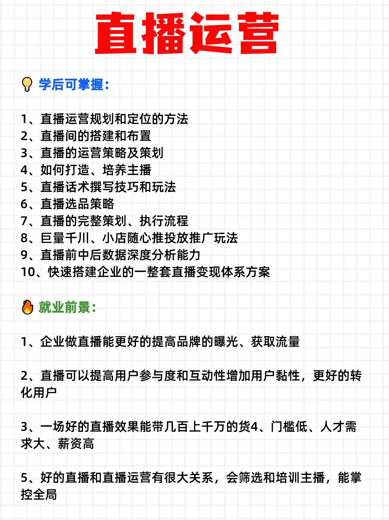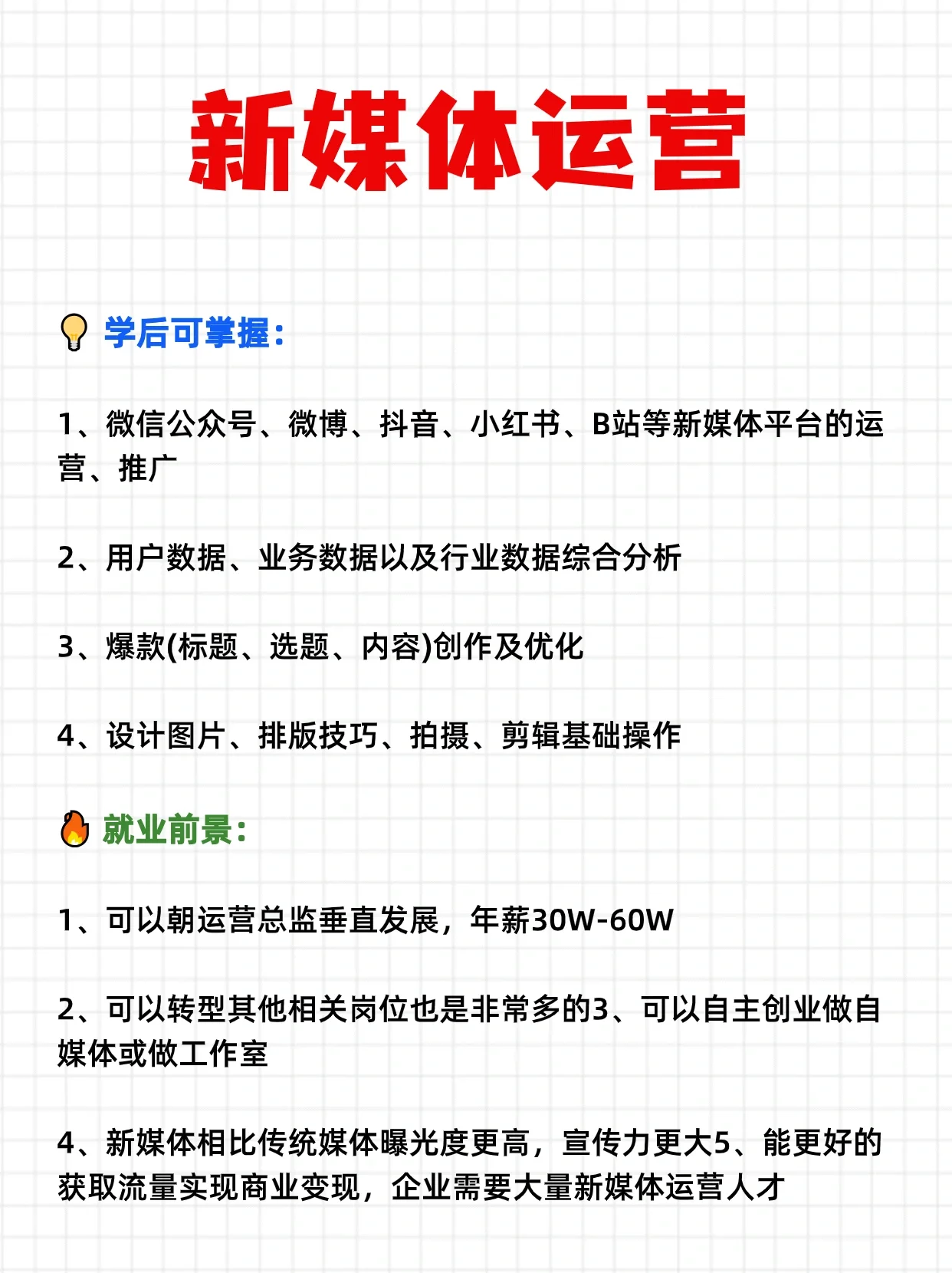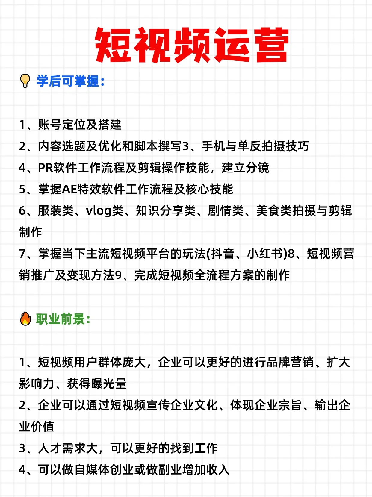总结新媒体运营的本质 大师级平台运营:微信公众号、微博、抖音、小红书、B站等 数据分析:用户、业务和行业数据的综合分析️ 热门创作:标题、选题和内容优化 设计技巧:图像布局、拍摄和编辑的基本操作 就业前景 年薪30W-60W的运营总监 是否过渡到相关职位 创业:自媒体还是工作室 新媒体>传统媒体曝光 商业货币化,企业需求 短视频运营介绍 学习成果 帐户定位和设置: 选题和写剧本 拍摄技巧:手机和单反 公关软件编辑技巧 AE特效软件核心技能 多种类型的拍摄和制作:服装、视频博客、知识分享、情节、食物 如何在短视频平台上玩:抖音、小红书 营销推广和货币化 全流程计划生产 职业前景 品牌营销和扩大影响力 传达企业文化和价值观 人才需求大 自我媒体创业还是副业机会 小红书的运营重点是什么 掌握技能: 帐户设置: 爆炸性文章的选题和脚本结构 视频场景拍摄 如何将引流货币化 数据分析和获得追随者的技术 广告投放策略 如何开设和经营店铺 品牌企业账户运营 就业机会 新手友好,爆炸几率高 全面的技能提升: 低成本高效率的流量获取 直播运营核心 技能掌握 运营规划和定位 直播间布局 运营战略和规划 建造和培养锚 脚本编写和游戏: 产品选择策略: 完成计划和执行 广告投放策略 数据分析 企业直播货币化系统 职业前景 品牌曝光和流量获取 用户参与度和转化率 高效低门槛的直播 高需求高薪水 重要性:筛选培训主播