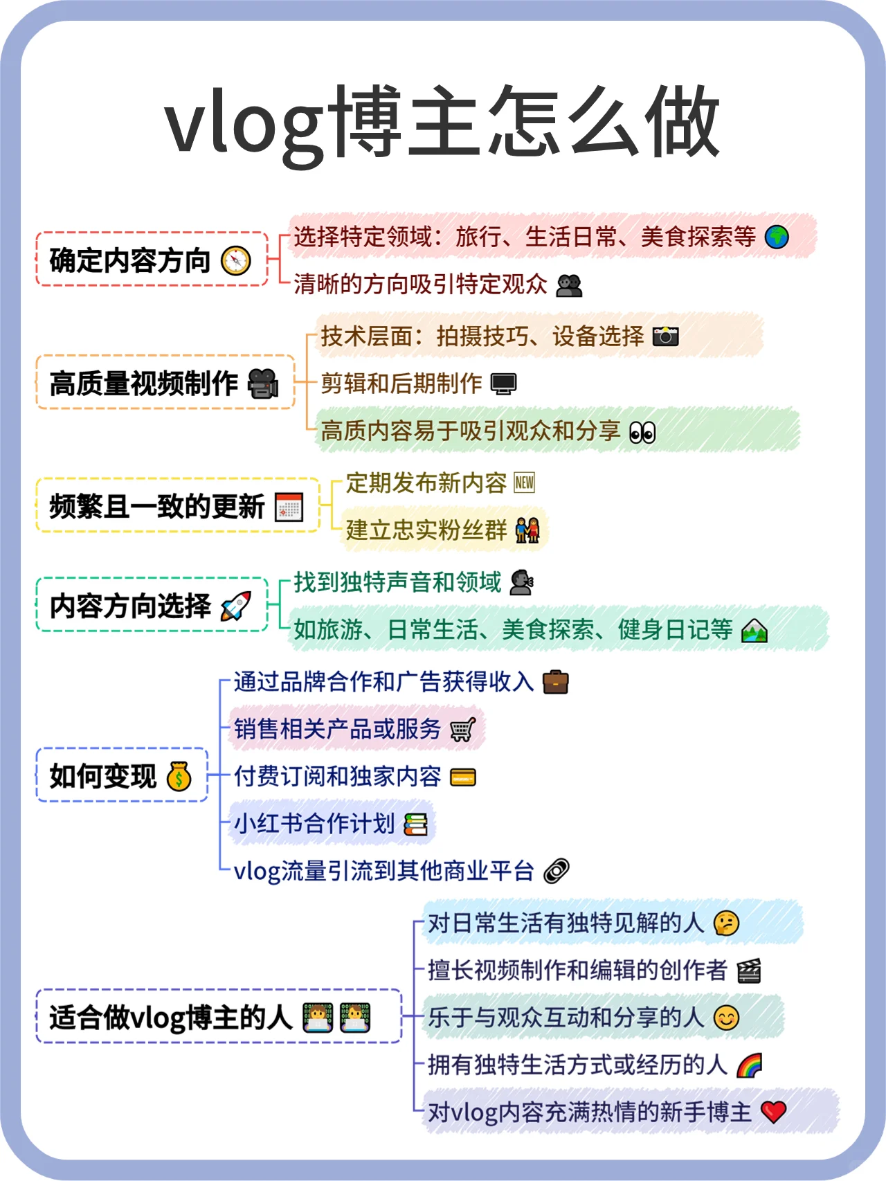 很多朋友都想去vlog博主领域工作,但做得越多,数据就越差,于是开始放弃。我从2018年开始做运营,从零开始陪伴了许多新博主,包括个人和企业。今天,让我们来谈谈这件事。 如何成为vlog博主 vlog博主在小红书运营中的崛起,证明了视频内容的巨大吸引力。Vlog作为一种生动展示日常生活和见解的方式,为博主提供了一种独特的展示自我和吸引观众的方式。以下是成为一名成功的vlog博主的一些要点: ① 首先,确定内容的方向。它是专注于旅行、日常生活、美食探索还是其他领域明确的方向将有助于吸引特定的受众。 ② 利用高质量的视频制作来增强观众体验。这不仅包括视频拍摄的技术方面,还包括剪辑和后期制作。高质量的内容更有可能吸引观众并促进分享。 ③ 保持频繁和一致的更新。定期发布新内容对于在运营中建立忠实的粉丝群至关重要。 ④ 互动和观众。回复评论,参与讨论,甚至根据粉丝的反馈调整内容。 ⑤ 通过讲故事建立个人品牌。分享你独特的观点和经验,让观众感受到与你个人的联系。 内容方向选择 作为一个vlog博主,选择正确的内容方向是成功的关键。这可以是你的专业领域或激情所在,如旅游、日常生活、美食探索、健身日记等。找到你独特的声音,并围绕它创作内容。 如何盈利 ① 通过品牌合作和广告创收。 ② 销售相关产品或服务。 ③ 通过付费订阅和独家内容吸引支持。 ④ 参与小红书的合作计划。 ⑤ 利用vlog流量吸引流量到其他商业平台。 什么类型的人适合做 ① 对日常生活有独特见解的人。 ② 擅长视频制作和编辑的创作者。 ③ 愿意与观众互动和分享的人。 ④ 具有独特生活方式或经历的人。 ⑤ 一个对vlog内容充满热情的新手博主。 总结 作为一个vlog博主,最重要的是找到自己的声音,与观众建立真正的联系。持续学习和提高内容质量,同时保持与观众的互动。记住,每一个成功的博主背后都有很多努力和不断的学习。我希望这封信能对大家有所帮助。通过这些年的学习,我积累了一本《操作与职称技能手册》,我的主页也有了更多的知识。我之前合作过的一个博客作者,他在做vlog,数据很差。后来,我让他用这种方法来改进数据。