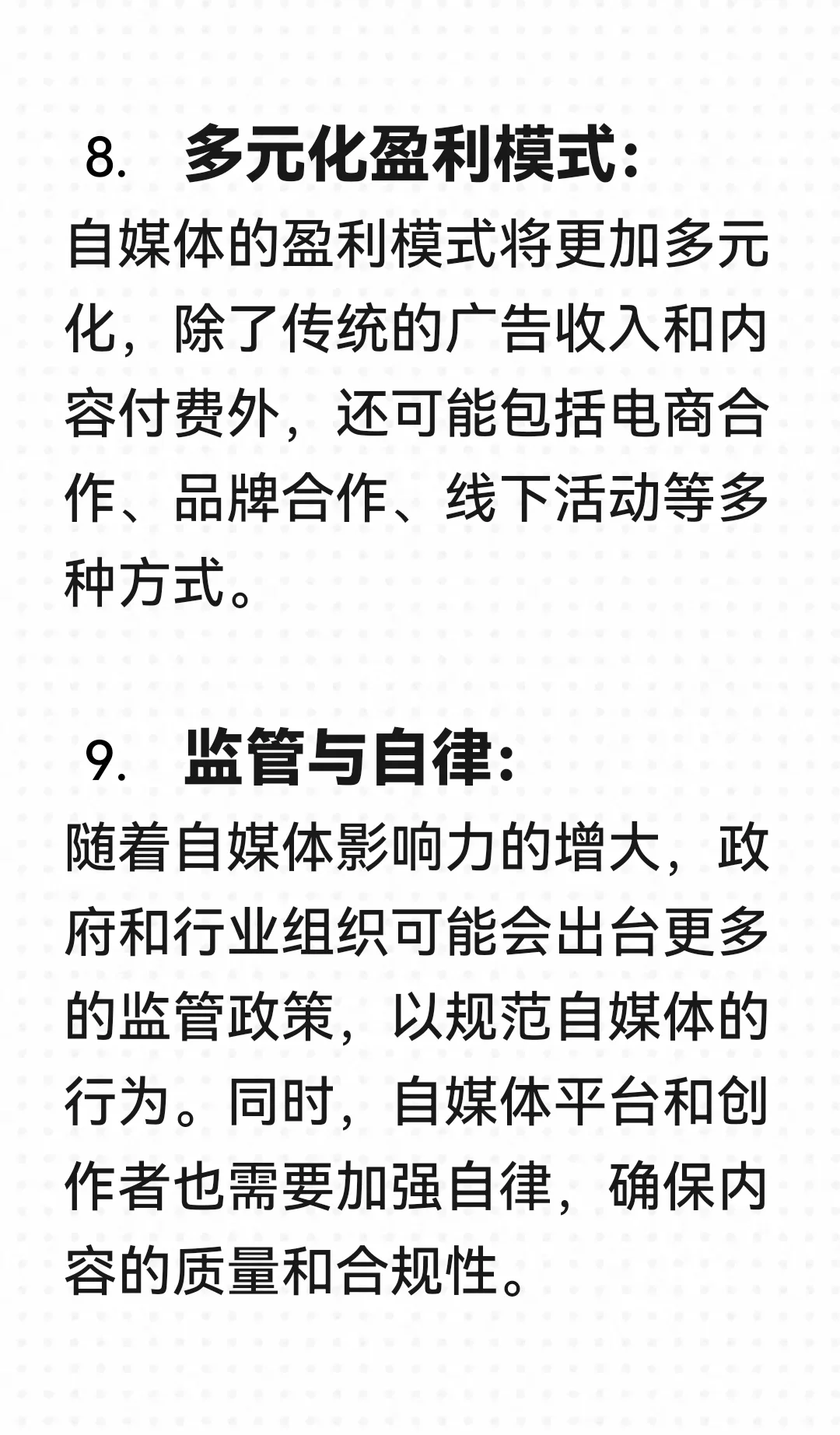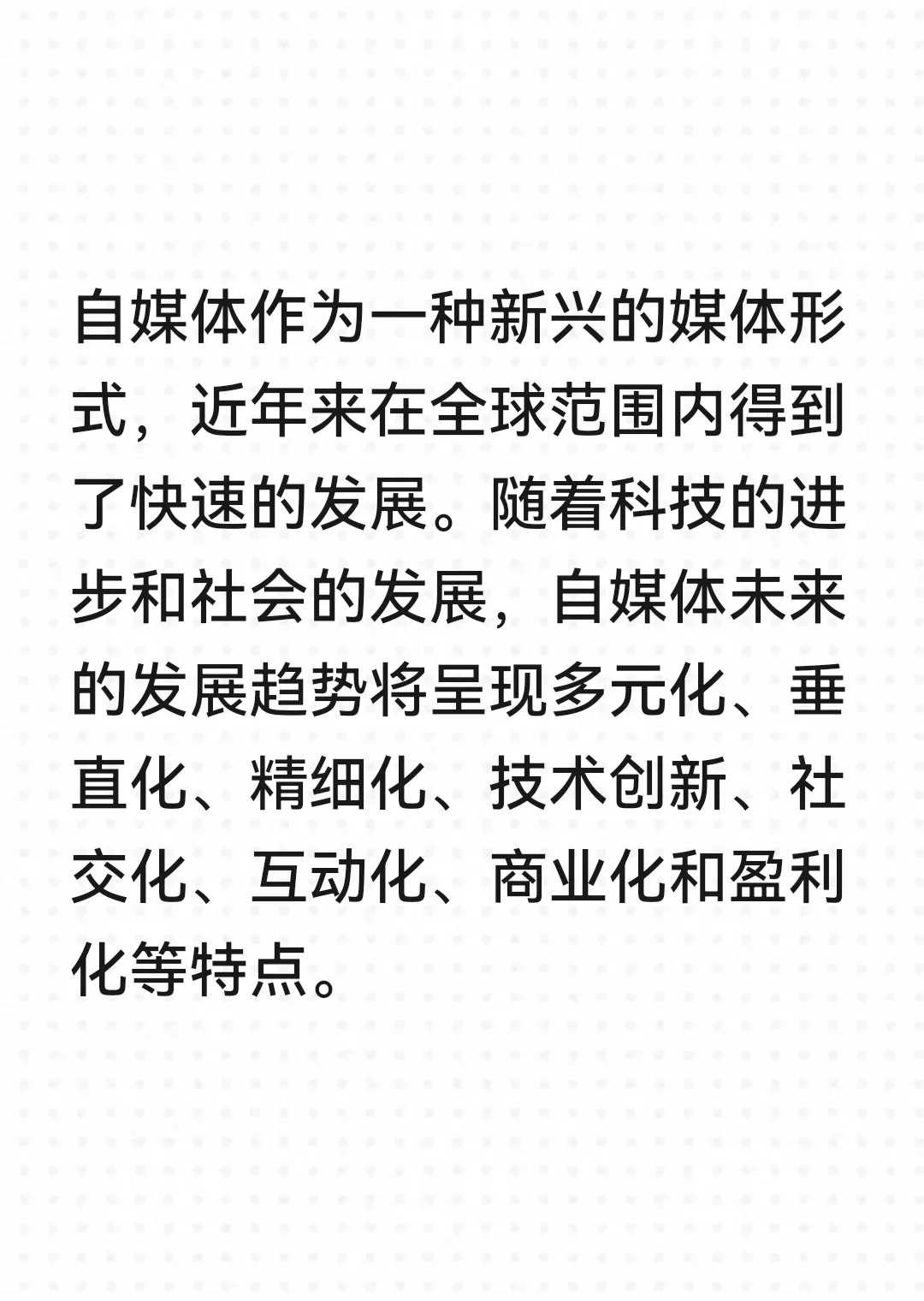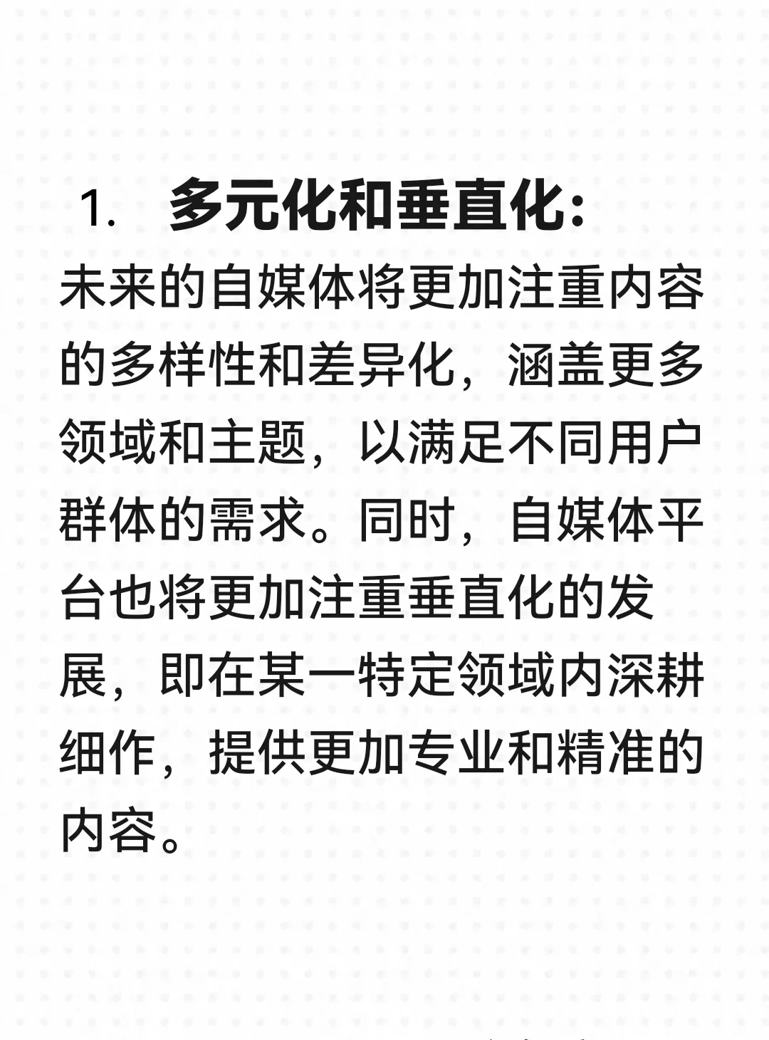 自媒体作为一种新兴的媒体形式,近年来在世界范围内得到了快速发展。随着技术的进步和社会的发展,自媒体未来的发展趋势将呈现出多样化、垂直化、精细化、技术创新、社会化、互动化、商业化、盈利化等特点。 1.多元化和垂直化: 未来,自媒体将更加注重内容的多样性和差异化,覆盖更多领域和主题,满足不同用户群体的需求。同时,自媒体平台也会更加注重垂直发展,即在特定领域深耕细作,提供更专业、更精准的内容。 2.精细化和技术创新: 未来,自媒体将更加注重内容的精细化和个性化,通过技术创新和数据分析,为用户提供更符合其需求的内容。例如,使用人工智能和机器学习技术,自媒体平台可以分析用户的兴趣和行为习惯,并向用户推荐更准确的内容。 3.社会化和互动性: 未来,自媒体将更加注重社会化和互动性,通过社交媒体等渠道建立更加亲密、互动、开放的用户关系,促进内容的传播和共享。同时,自媒体创作者也需要与读者进行更多的互动和交流,获得反馈和建议,不断提高创作水平。 4.商业化和盈利能力: 未来,自媒体将更加注重商业化和盈利,通过广告、付费阅读、会员制等手段实现商业化运营。同时,自媒体创作者也需要专注于自身的品牌建设和粉丝积累,以实现个人价值最大化和商业货币化。 5.内容创新与个性化: 自媒体将更加注重内容的创新和个性化定制,以吸引和保持观众的兴趣。这意味着自媒体创作者需要不断探索新的内容形式和主题,并提供更个性化的内容服务。 6.用户体验和互动性: 自媒体平台将更加注重用户体验,提供更便捷的互动方式,如直播、问答、评论等,以提高用户参与度和忠诚度。 7.技术和数据分析: 随着大数据和人工智能技术的发展,自媒体将利用这些技术分析用户行为,优化内容推荐,提高内容的针对性和吸引力。同时,技术进步也将提高内容的创作和分发效率。 8、多元化的盈利模式: 自媒体的盈利模式将更加多元化,除了传统的广告收入和内容付费外,还可能包括电商合作、品牌合作、线下活动等多种方式。 9.监督和自律: 随着自媒体影响力的不断增强,政府和行业组织可能会出台更多的监管政策来规范自媒体的行为。同时,自媒体平台和创作者也需要加强自律,确保内容的质量和合规性。