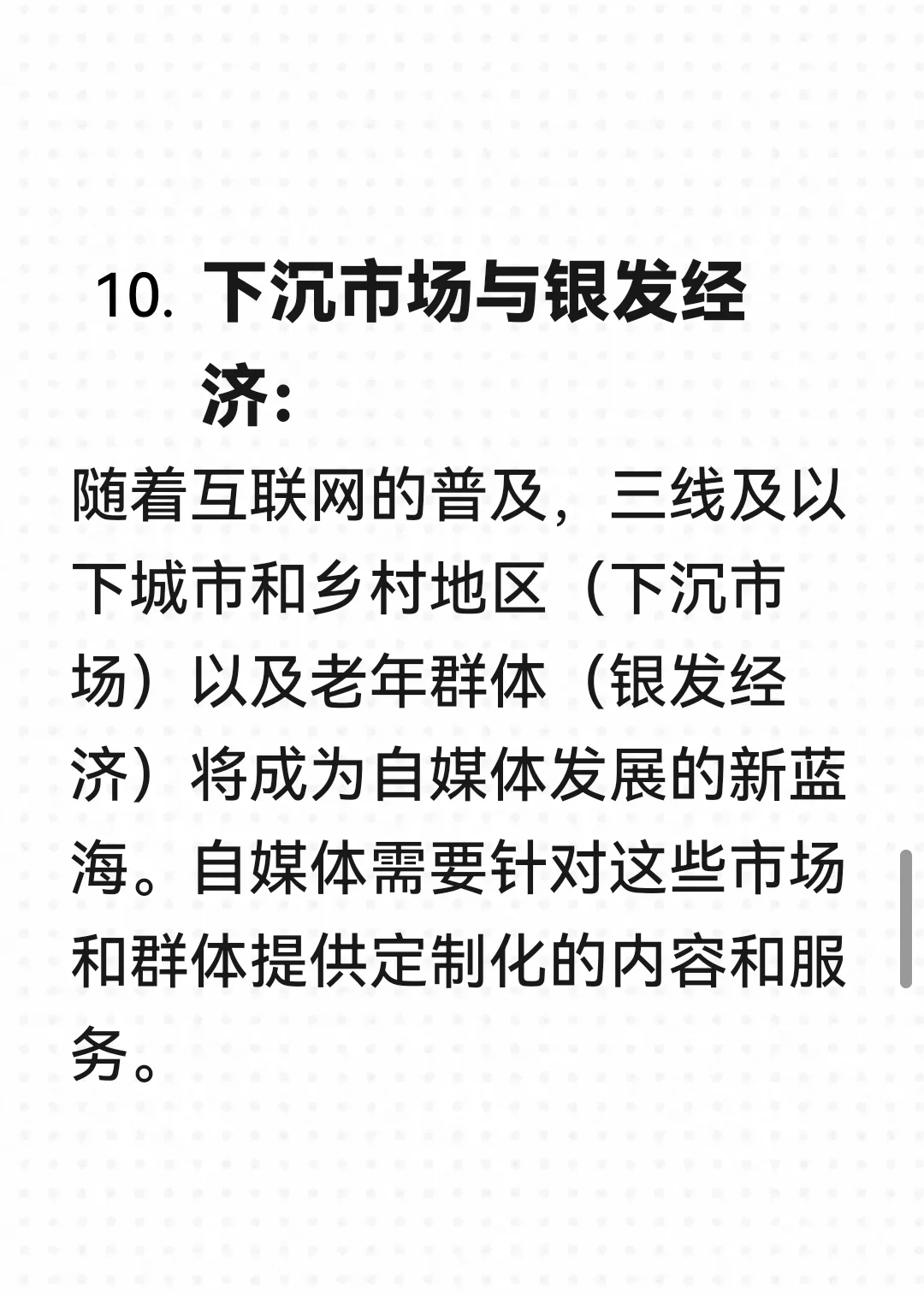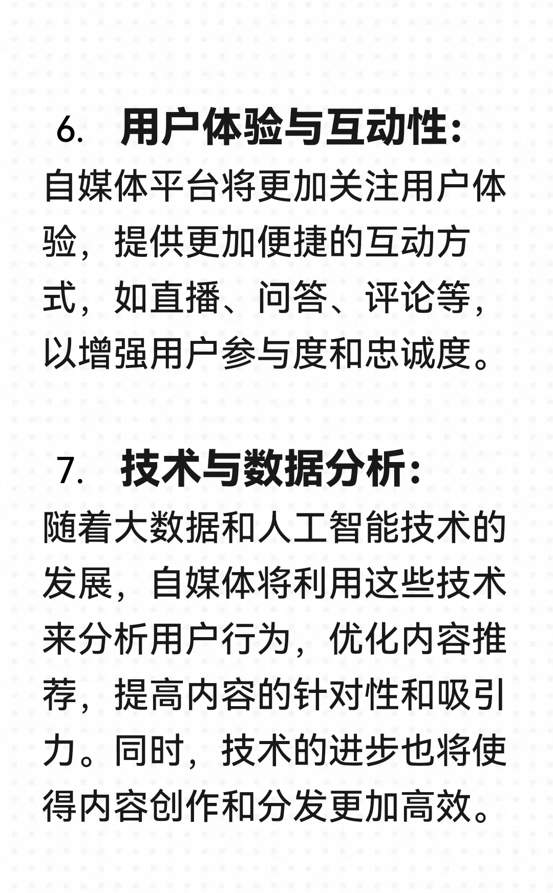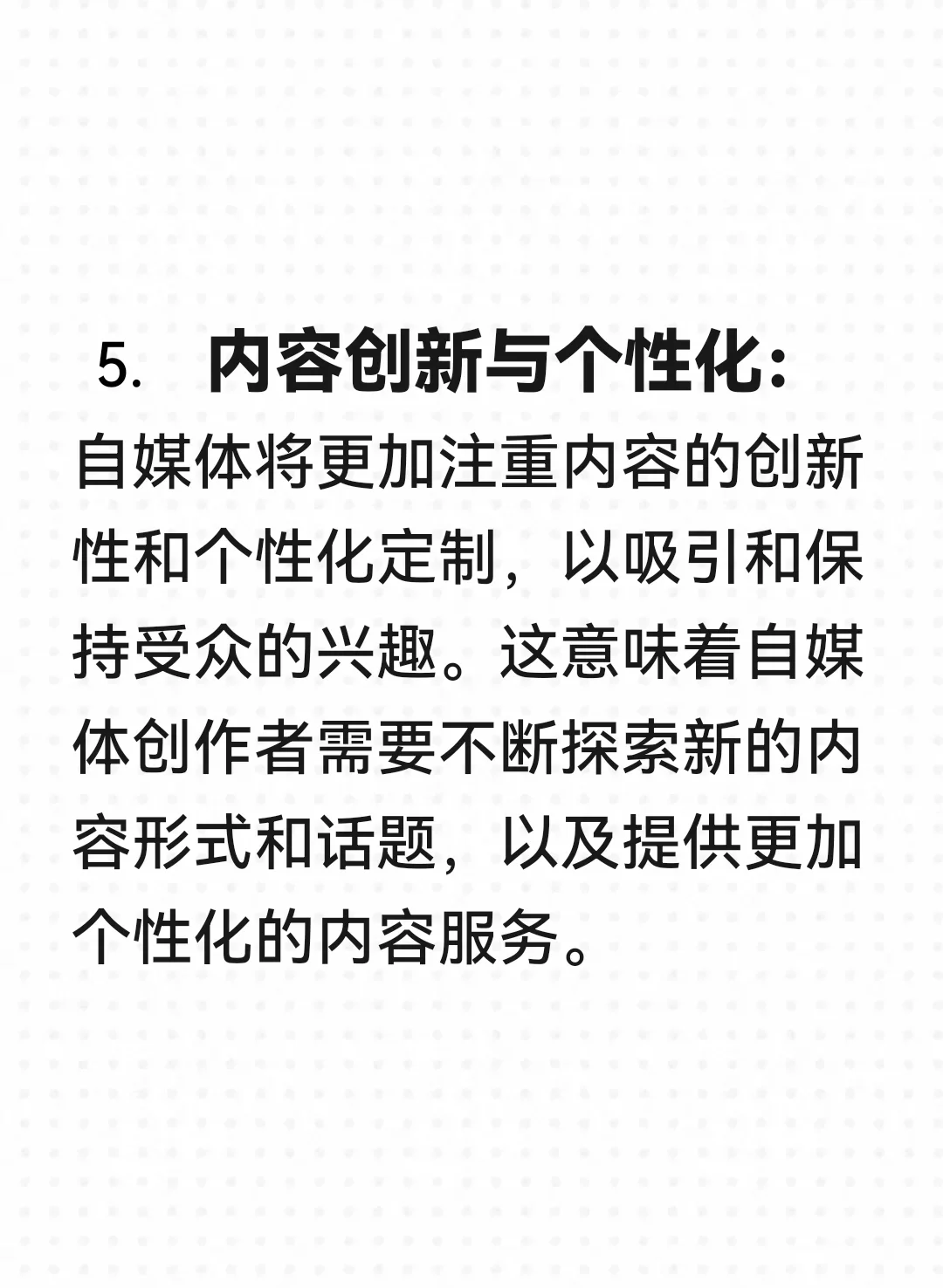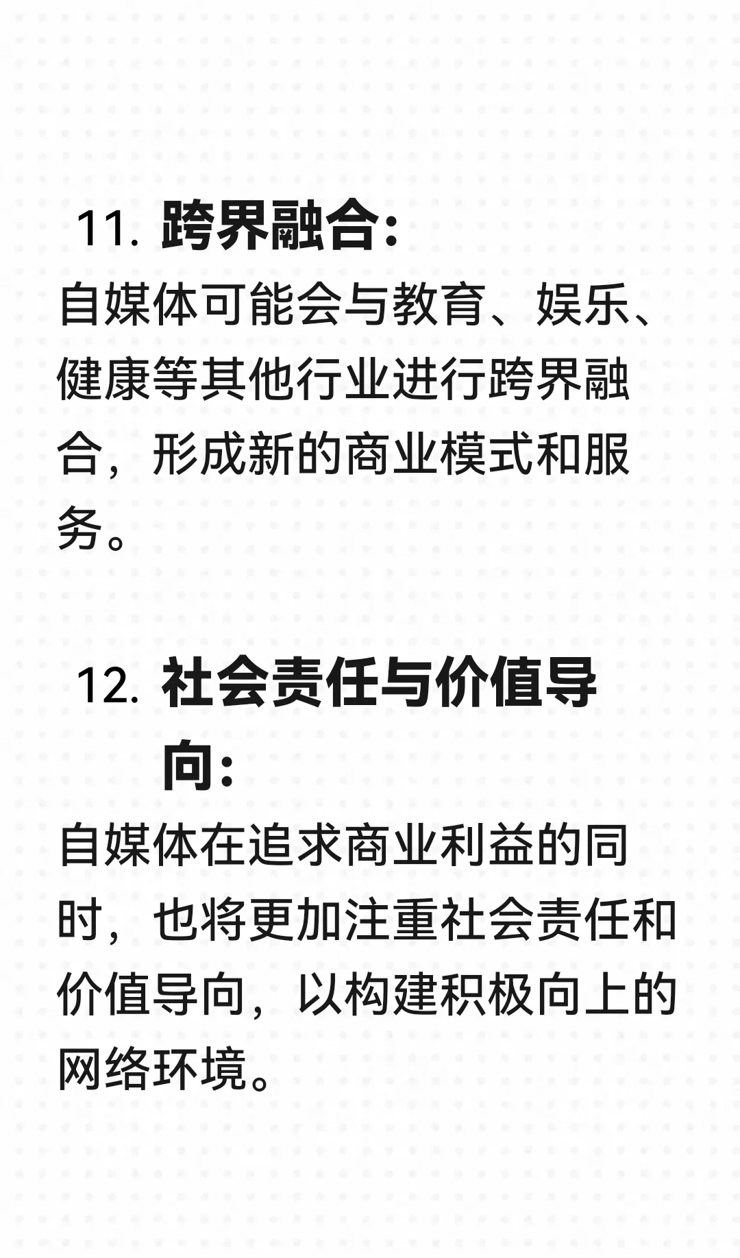 自媒体作为一种新兴的媒体形式,近年来在世界范围内得到了快速发展。随着技术的进步和社会的发展,自媒体未来的发展趋势将呈现出多样化、垂直化、精细化、技术创新、社会化、互动化、商业化、盈利化等特点。 1.多元化和垂直化: 未来,自媒体将更加注重内容的多样性和差异化,覆盖更多领域和主题,满足不同用户群体的需求。同时,自媒体平台也会更加注重垂直发展,即在特定领域深耕细作,提供更专业、更精准的内容。 2.精细化和技术创新: 未来,自媒体将更加注重内容的精细化和个性化,通过技术创新和数据分析,为用户提供更符合其需求的内容。例如,使用人工智能和机器学习技术,自媒体平台可以分析用户的兴趣和行为习惯,并向用户推荐更准确的内容。 3.社会化和互动性: 未来,自媒体将更加注重社会化和互动性,通过社交媒体等渠道建立更加亲密、互动、开放的用户关系,促进内容的传播和共享。同时,自媒体创作者也需要与读者进行更多的互动和交流,获得反馈和建议,不断提高创作水平。 4.商业化和盈利能力: 未来,自媒体将更加注重商业化和盈利,通过广告、付费阅读、会员制等手段实现商业化运营。同时,自媒体创作者也需要专注于自身的品牌建设和粉丝积累,以实现个人价值最大化和商业货币化。 5.内容创新与个性化: 自媒体将更加注重内容的创新和个性化定制,以吸引和保持观众的兴趣。这意味着自媒体创作者需要不断探索新的内容形式和主题,并提供更个性化的内容服务。 6.用户体验和互动性: 自媒体平台将更加注重用户体验,提供更便捷的互动方式,如直播、问答、评论等,以提高用户参与度和忠诚度。 7.技术和数据分析: 随着大数据和人工智能技术的发展,自媒体将利用这些技术分析用户行为,优化内容推荐,提高内容的针对性和吸引力。同时,技术进步也将提高内容的创作和分发效率。 8、多元化的盈利模式: 自媒体的盈利模式将更加多元化,除了传统的广告收入和内容付费外,还可能包括电商合作、品牌合作、线下活动等多种方式。 9.监督和自律: 随着自媒体影响力的不断增强,政府和行业组织可能会出台更多的监管政策来规范自媒体的行为。同时,自媒体平台和创作者也需要加强自律,确保内容的质量和合规性。