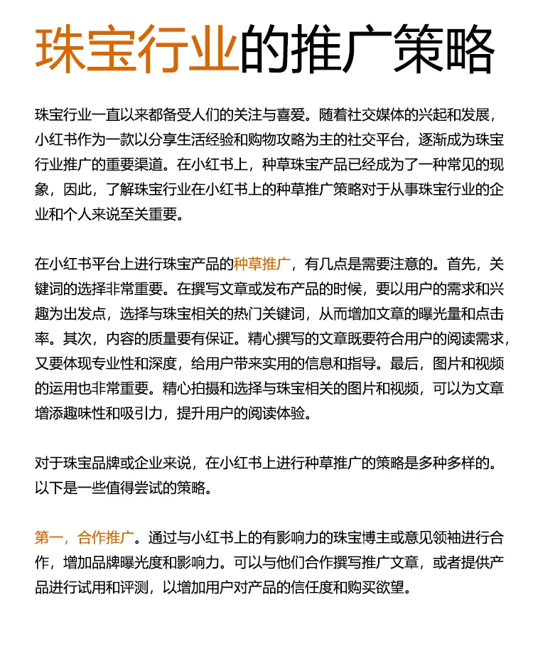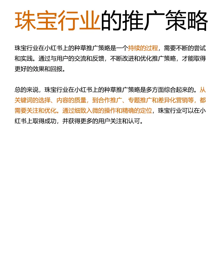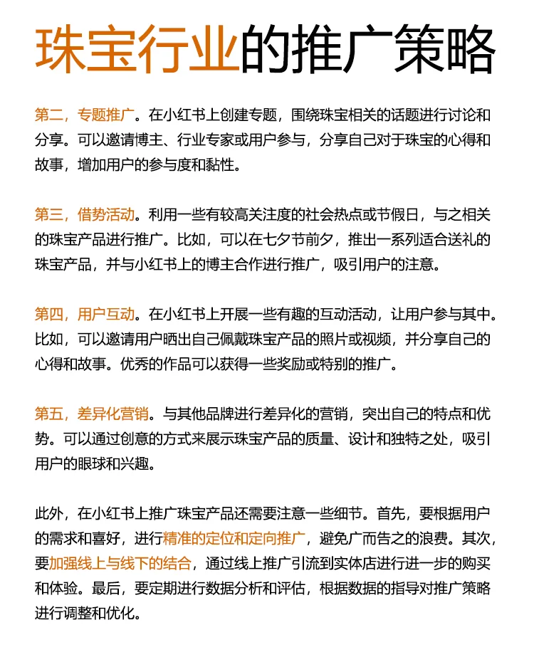 总体而言,珠宝行业在小红书上的推广策略是多方面的结合。通过精细的运营和精准的定位,珠宝行业可以在小红书上获得成功,获得更多的用户关注和认可。