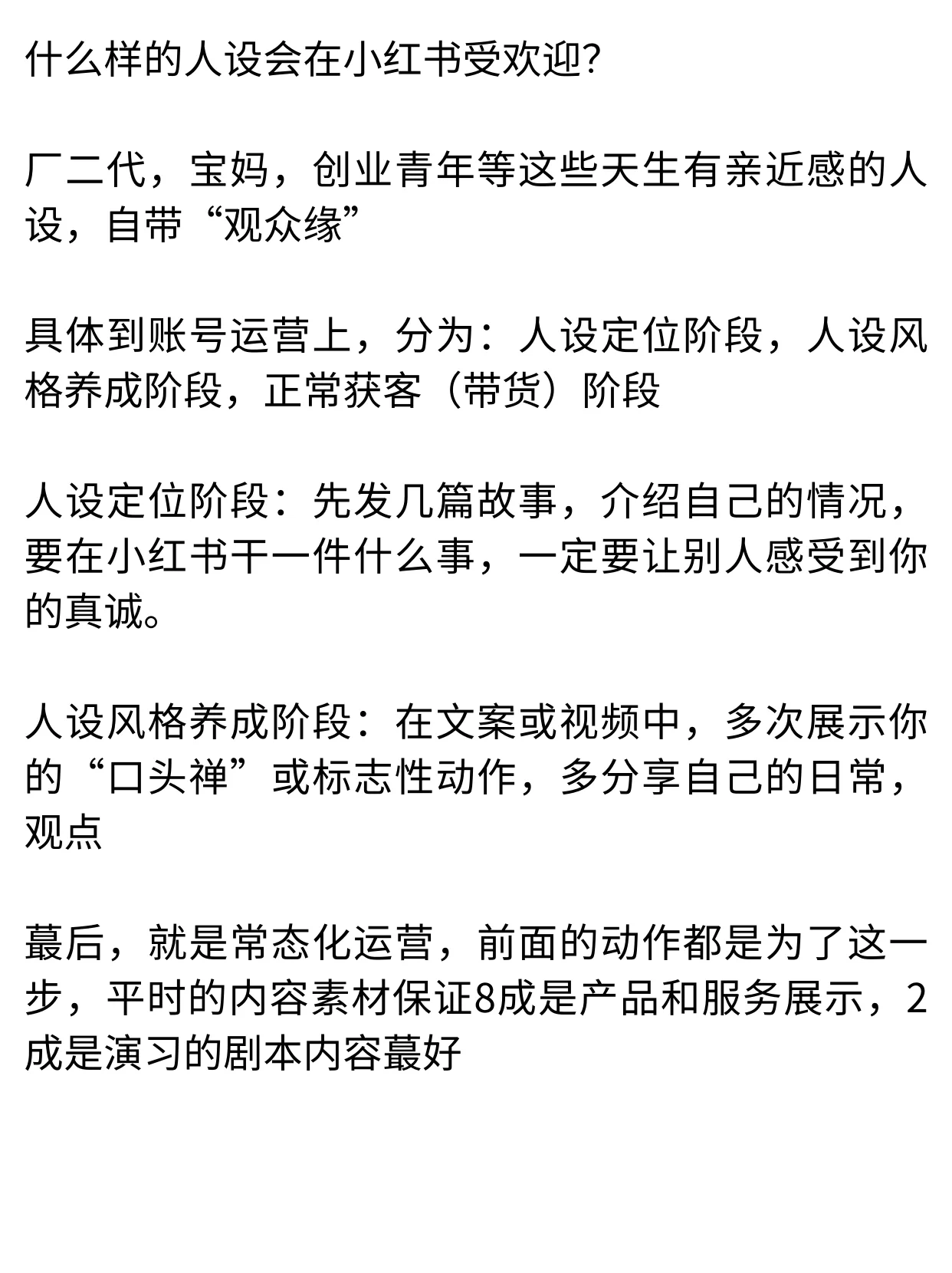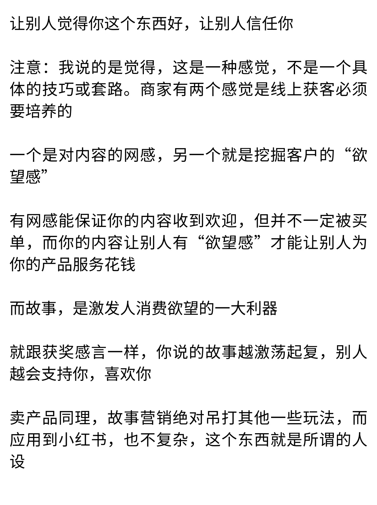 要在小红书做生意,你需要能够行动。在生活中进入戏剧完全取决于演技,做小红书也是如此。我们该怎么说呢 在昨天的笔记中,我提到了一个在小红书上找客户卖牛肉丸的案例。几个月前,我还分享了第二代工厂销售丝绸产品的案例。他们都有一个特点:擅长讲故事!! 小红书用户以女性为主,这意味着红书的消费群体是在购买东西或服务。你谈论的内容越具体、越客观,你可能会觉得越冗长。 当然,你需要对产品有基本的专业水平,但这不需要一直反映在你的笔记中。完成笔记后,实现一个目标就足够了: 让别人认为你是件好事,让他们信任你 注:我想说的是,这是一种感觉,而不是一种特定的技巧或惯例。为了在网上吸引客户,企业必须培养两种感情。一种是对内容的网络感,另一种是挖掘客户的欲望。拥有网络感可以确保你的内容受到欢迎,但不一定是付费的。你的内容可以让别人产生欲望,从而让别人在你的产品和服务上花钱 故事是激发人们消费欲望的有力工具,就像演讲和演讲一样。你讲的故事越精彩,别人就会越支持你,越喜欢你销售产品。同样,故事营销肯定胜过其他游戏,当应用于小红书时,它并不复杂。这就是所谓的人物设计 什么样的人物形象会在小红书上流行二代工厂、妈妈、创业青年等具有天然亲近感的人,都有自己的“受众吸引力”。具体来说,在账户运营方面,可以分为三个阶段:角色定位阶段、角色风格发展阶段和正常的获客(销售)阶段 个性定位阶段:首先,分享一些关于自己的故事,介绍自己的情况,在小红书上做点什么,确保别人感受到你的真诚。 个性风格发展阶段:在文案或视频中,多次展示你的“流行语”或标志性动作,更多地分享你的日常生活和观点 之后,它是规范化操作。前面的操作都用于此步骤,确保80%的内容和材料用于产品和服务显示,20%用于练习脚本。