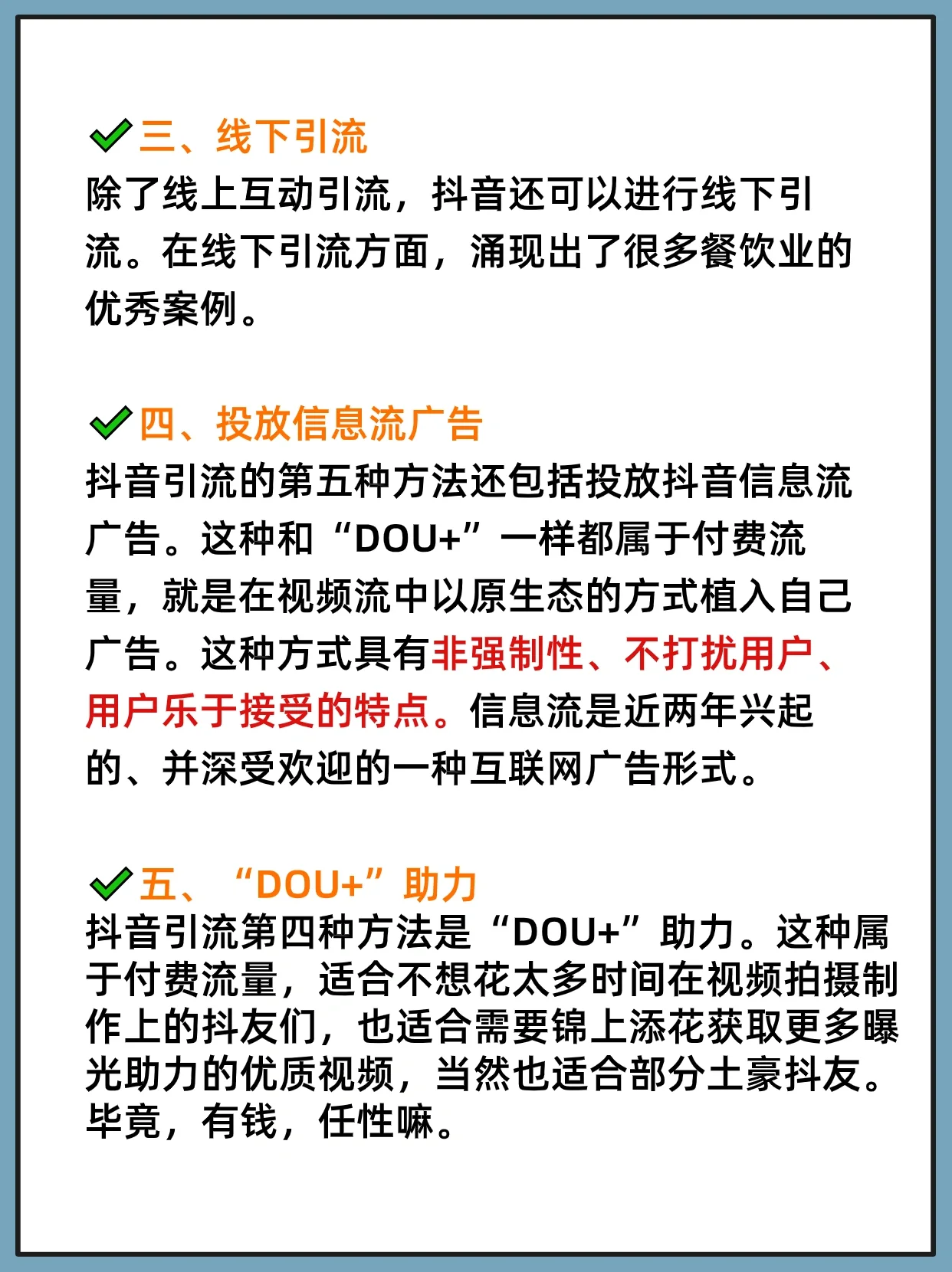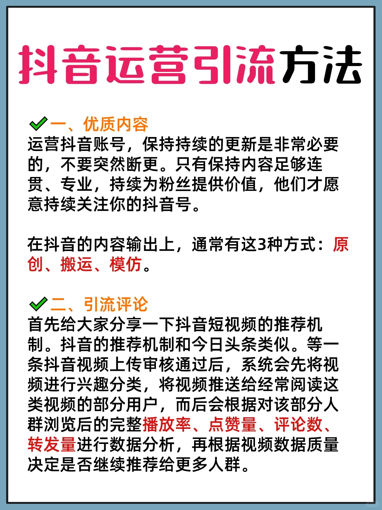 抖音运营引流方式 1、 高质量内容 运营抖音账号并不断更新是非常必要的。不要突然打破它。只有当内容足够一致和专业,能够继续为粉丝提供价值时,他们才会愿意继续关注你的抖音号码。 在抖音的内容输出中,通常有三种方式:原创、感动和模仿。 2、 吸引人的评论 首先,我们来分享一下抖音短视频的推荐机制。抖音的推荐机制与今日头条的推荐机制相似。在抖音视频上传并获得批准后,系统会首先将视频分类为兴趣类别,并将视频推送给一些经常阅读此类视频的用户。然后,系统会根据浏览视频后这部分观众的完整播放率、点赞、评论和转发量来分析数据,然后根据视频数据的质量决定是否继续向更多人推荐视频。 3、 离线排水 除了线上互动引流,抖音还可以进行线下引流。在线下流量方面,餐饮行业涌现出不少优秀案例。 4、 投放信息流广告 抖音引流的第五种方式还包括投放抖音信息流广告。这种类型与“DOU+”一样,属于付费流量,即在视频流中以原始方式植入自己的广告。这种方式具有非强制性、不打扰用户、用户愿意接受的特点。信息流是近年来出现的一种流行的互联网广告形式。 5、 “DOU+”协助 抖音引流的第四种方式是“DOU+”辅助。这个属 对于付费流量,它适合不想在视频拍摄和制作上花费太多时间的抖音用户,以及需要额外曝光辅助的高质量视频。当然,它也适合一些富裕的抖音用户。毕竟,钱是任性的。