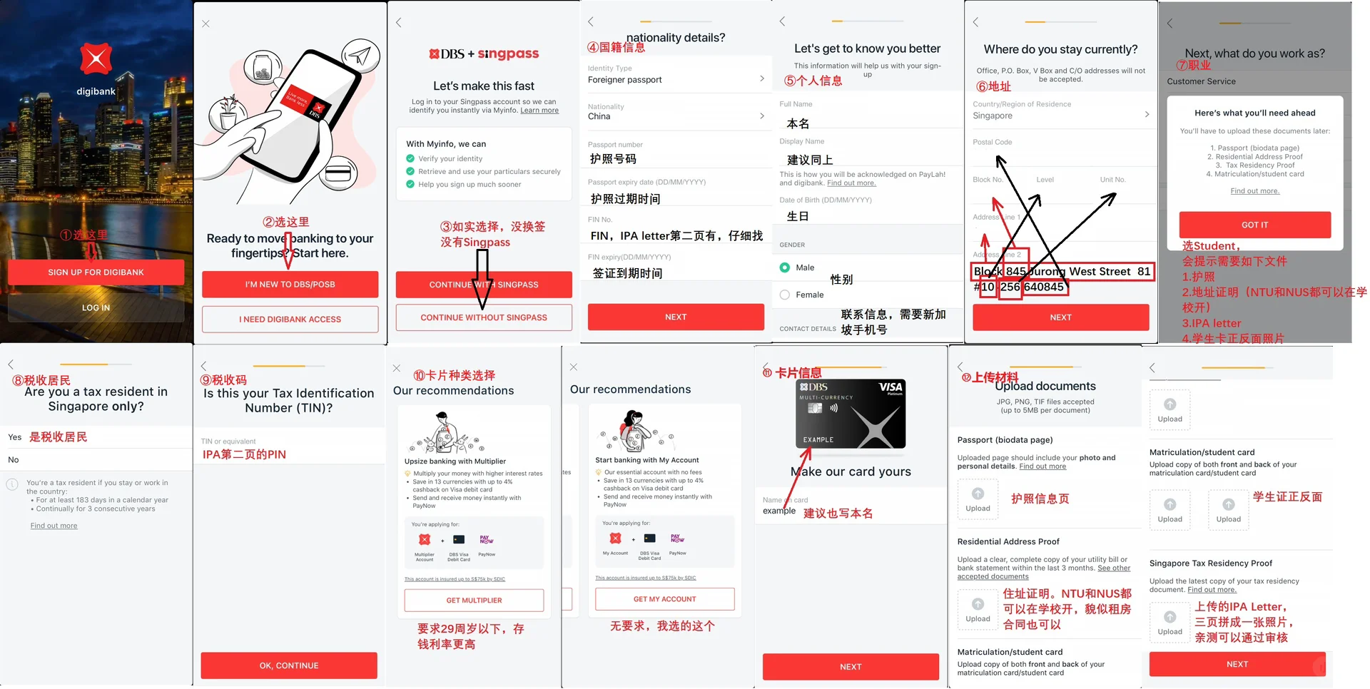 应用 ① 下载DBS Digibank,选择注册Digibank ② 选择我是DBS新手 ③ 如果有SingPass,请使用SingPass。对于那些没有更改签名的人,请选择No SingPass ④ 填写国籍信息 ⑤ 填写个人信息并要求提供新加坡电话号码 ⑥ 填写地址(重要!银行卡将来会发送到此地址),常见的新加坡地址格式如图所示 ⑦ 选择职业,选择学生 ⑧ 无论您是新加坡税务居民,请选择“是” ⑨ 税码,FIN编号,IPA第2页有 ⑩ 卡片类型选择,注意第一种类型要求29岁以下。 ⑪ 卡片信息,建议直接填写真实姓名 ⑫ 按以下顺序上传材料:a)护照信息页b)地址证明(可接受学校出具的证明和住房合同)c)学生证正面和背面d)税务证明。这是我上传的IPA。 在申请当天,您将收到一份成功提交的申请。第二天,您将收到一封“欢迎使用全新的银行方式”的邮件。在这里,应用程序将成功。大约一周后,您将收到四封信,包括Digibank说明、银行卡密码(PIN)和税务信。收到后激活卡: 激活: ① 扫描代码或输入网址。建议直接输入网址,因为有时休息时可能不会弹出界面。(go.dbs.com/sg-cardact)到图2所示的接口 ② 输入您的电话号码和卡号的最后4位数字,点击下一步,系统将弹出激活成功界面 ③ 下载或打开DBS digibank ④ 点击登录 ⑤ 立即采取行动 ⑥ 输入如图所示的信息 ⑦ 选择借记卡 ⑧ 输入卡片信息,PIN密码为邮寄信件中的六位密码 ⑨ 登录后,重置pin码并设置用户名。此时,重置的pin码不是在ATM上输入的密码(重要!)ATM上的pin码是字母中的原始六位数pin码。如果您想将其修改为ATM,请参阅图10 ⑩ 登录网上银行后,点击更多找到重置卡密码并更改提款密码 ⑪ 然后你可以完成所有的操作并下载Paylah。您可以直接登录星展银行网上银行,弹出窗口会提示您是否有促销代码。