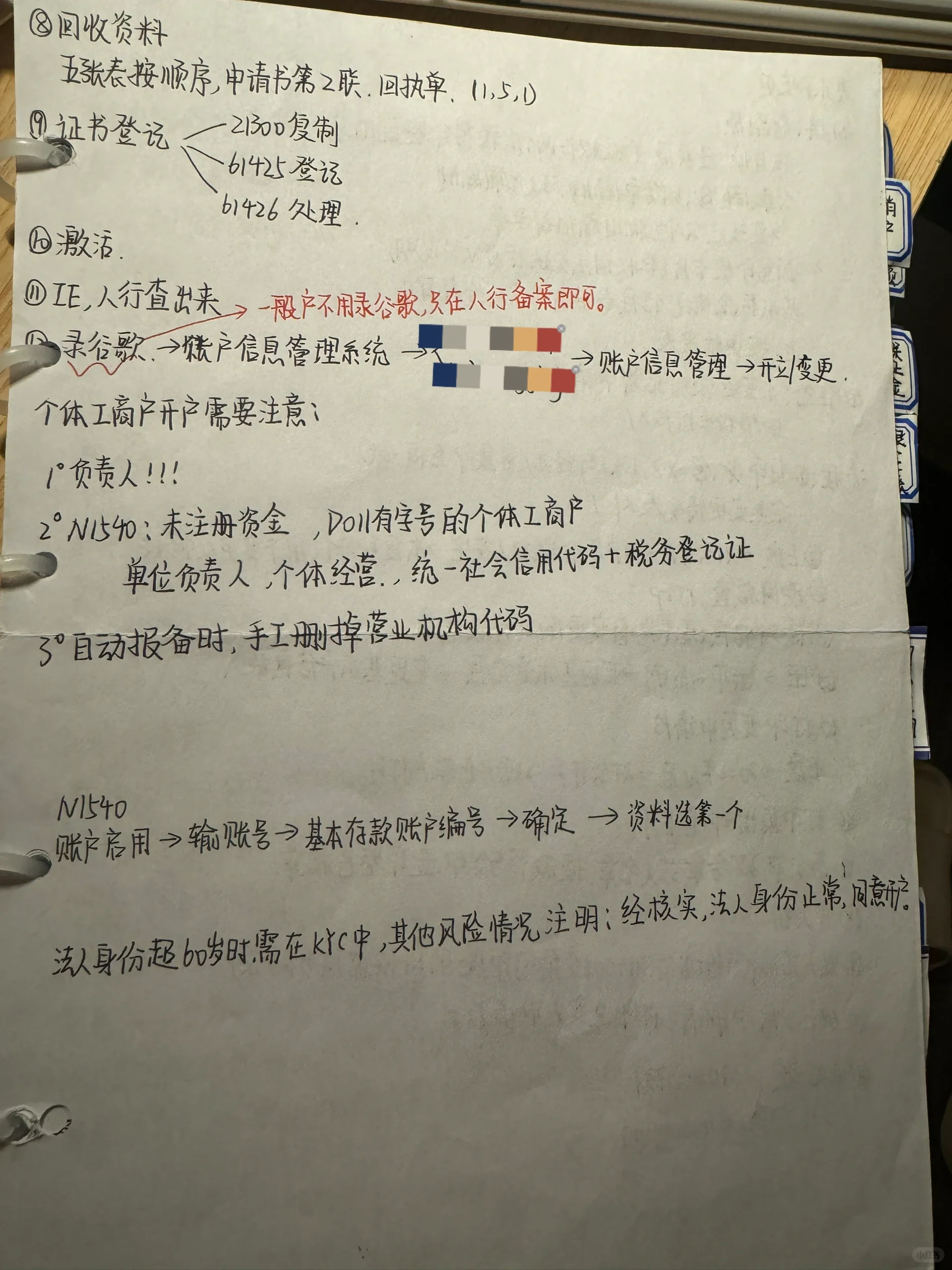 ? 信息:1。客户准备 1、营业执照原件2。三章3。法人身份证原件 4.经办人身份证原件(法定代表人不能来的) 2、 银行准备 1.本单位综合服务申请表(一式5份)2。联系人证明 3.风险通知4。申请开立单位账户 5.预留密封卡6。授权书(一式两份,法定代表人不来) ? 开户前准备: 1、 复印身份证和营业执照一式两份,一份作为传票,另一份作为账户信息,并提交给中国人民银行。打印“此复印件仅供开户和签字使用”,盖章并签字。 2、 查看企业灰色名单 3、 开户预检查,核实是否可以开立基本账户,是否存在长期停牌账户。 4、 60027在线验证可以打印在身份证副本的背面,用作传票。 ? 公众号开通:N1540 1.选择要开户的电子营业执照,输入预处理编号,然后进入界面。 2.核实户口→ 查看验证报告→ 查看图像→ 查看图像→ 验证是否为新公司→ 验证电子营业执照信息是否正确→ 填写营业执照的颁发机关和日期→ 读取经办人的ID 3.查询信息列表:选择其他信息(放置在其他信息中的身份证复印件)→ 确认信息列表→ 提交 4.客户信息填报->选择证明材料(统一社会信用代码、税务登记证、组织机构证书)->税务信息登记 5.提交打印版综合服务申请表➕ 开户申请表 6.注册企业网银用户、签约产品、账户用户、收款人身份、支付密码设备等信息。 7.数据恢复:综合服务申请表(5张,按顺序排列,记得戳好缺口);申请表的第二份副本;开户收据(包括在其他文件中) ? 开户结束:1。向中国人民银行备案➕ 启用帐户 2.记录谷歌系统 3.证书注册,61425注册,61426收藏 4.通过动态账户激活激活网上银行