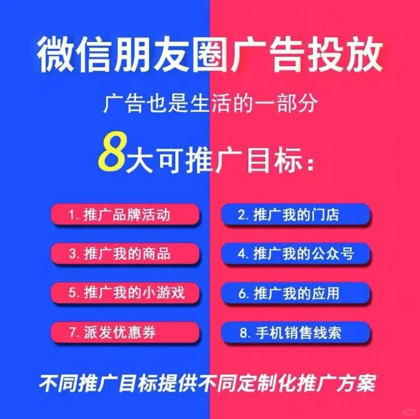 |||广告没有行业限制,所有媒体软件都可以用于广告 广告有三种方式:曝光计费、点击计费和效果转换计费[like R][like R] 不同的计费方式适用于不同的行业 让你的广告准确定位到合适的客户群,精准覆盖,这样你的产品就不再被忽视,你的公司就不再担心没有客户,你的商店也不再担心没有顾客进入! 公告位置 CETV 杜 申国单一中央电视台 二 三缸发动机 信息流 基于站点的推广服务 价格低廉 抖音头条西瓜万水千河 朋友圈里的快手百度 效果好 微信朋友圈广告投放 广告也是生活的一部分 8个主要可推广目标: 1.推广品牌活动 2.推广我的店铺 3.推广我的产品 4.推广我的公众号 5.推广我的迷你游戏 6.推广我的应用程序 7.发放优惠券 8.移动销售线索 针对不同的推广目标提供定制化的推广计划 在Moments上做广告 快来找我们! 房地产/汽车/美容/餐饮/教育/商务服务/装饰、建材和食品/ 服装鞋帽、运动健身、会展、休闲娱乐、旅游等